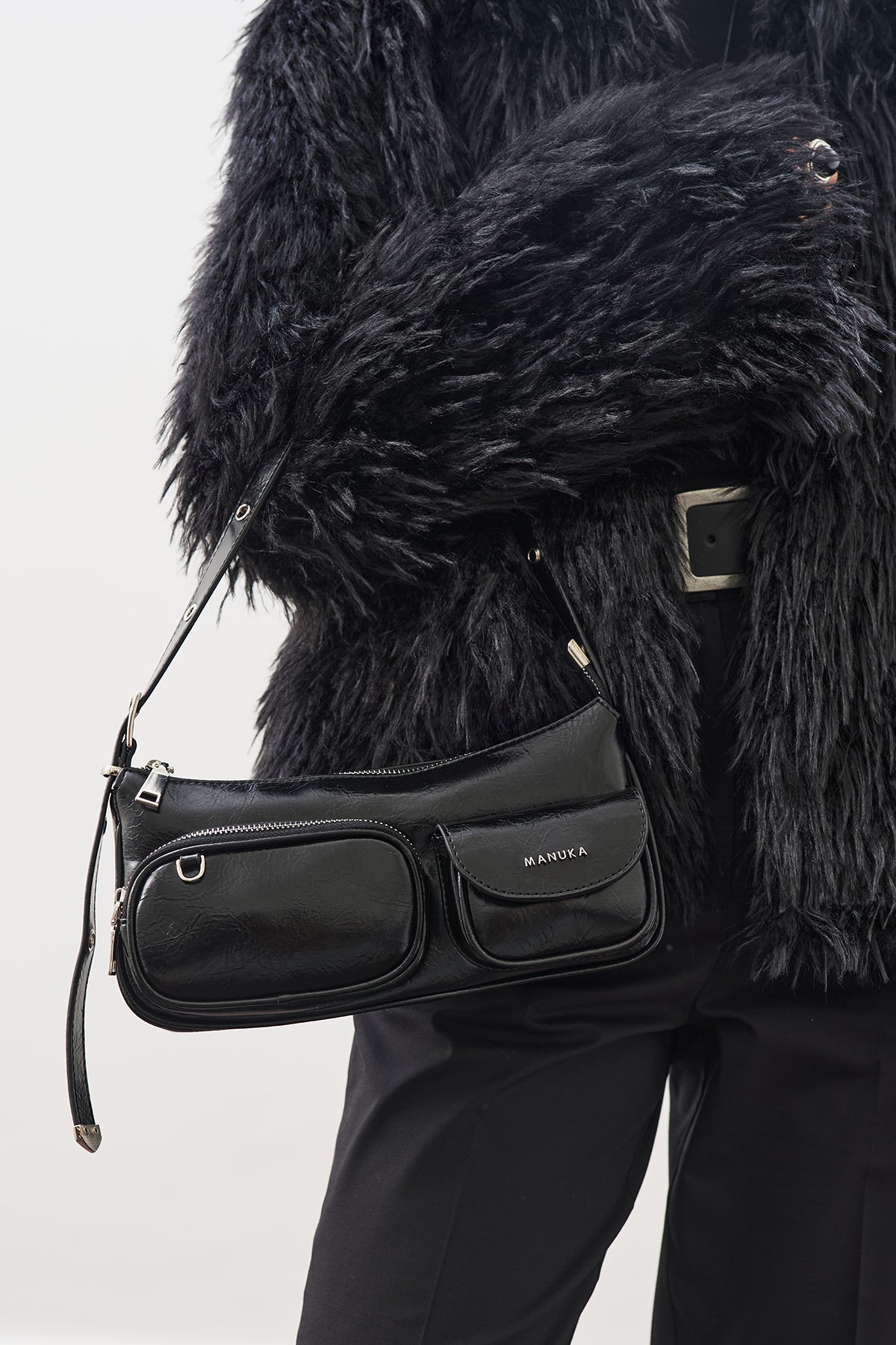 Küçük cepli, kuş gözü ve tokalı askılık,fermuarlı kapama,suni deri,astarlı