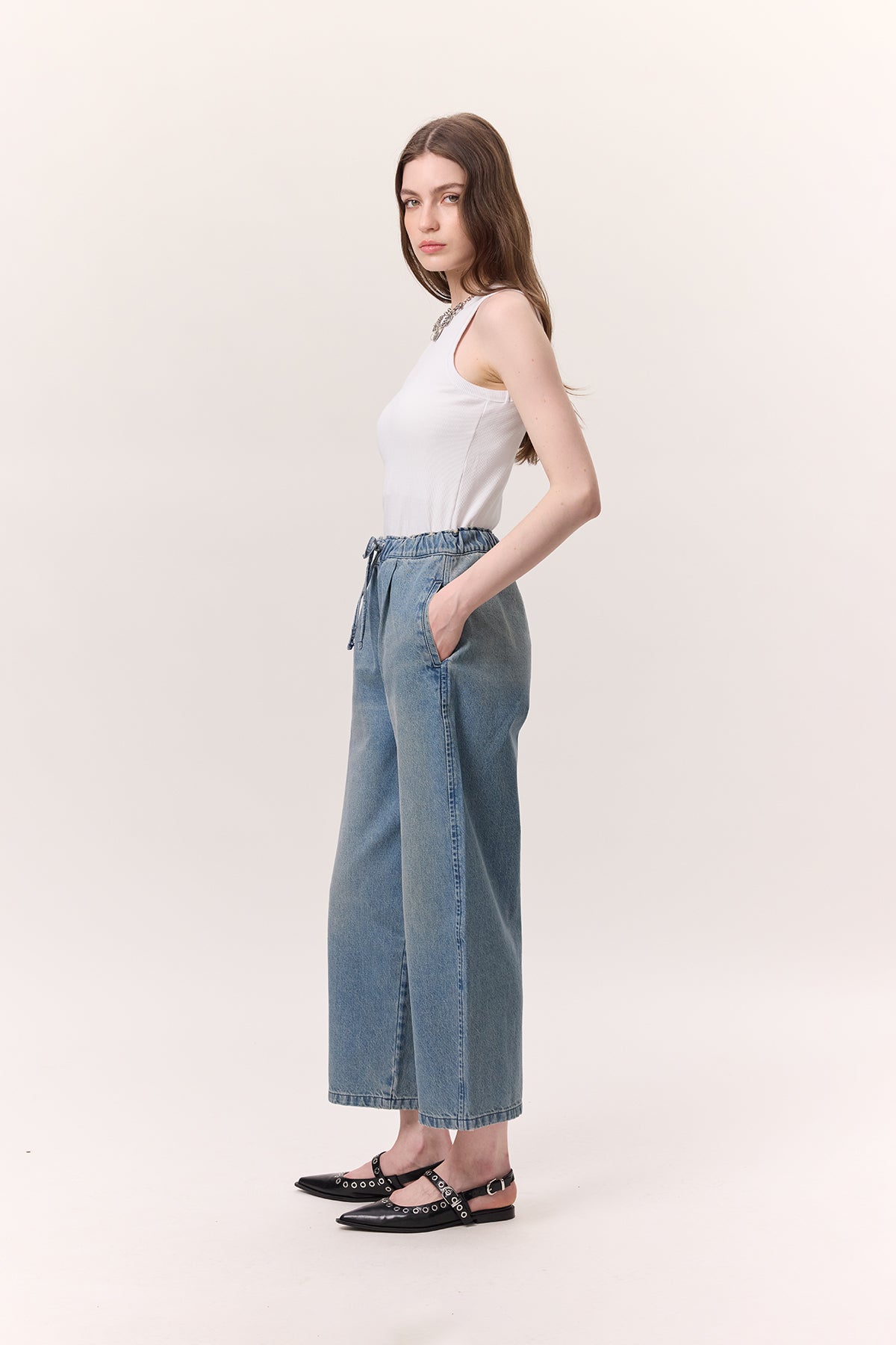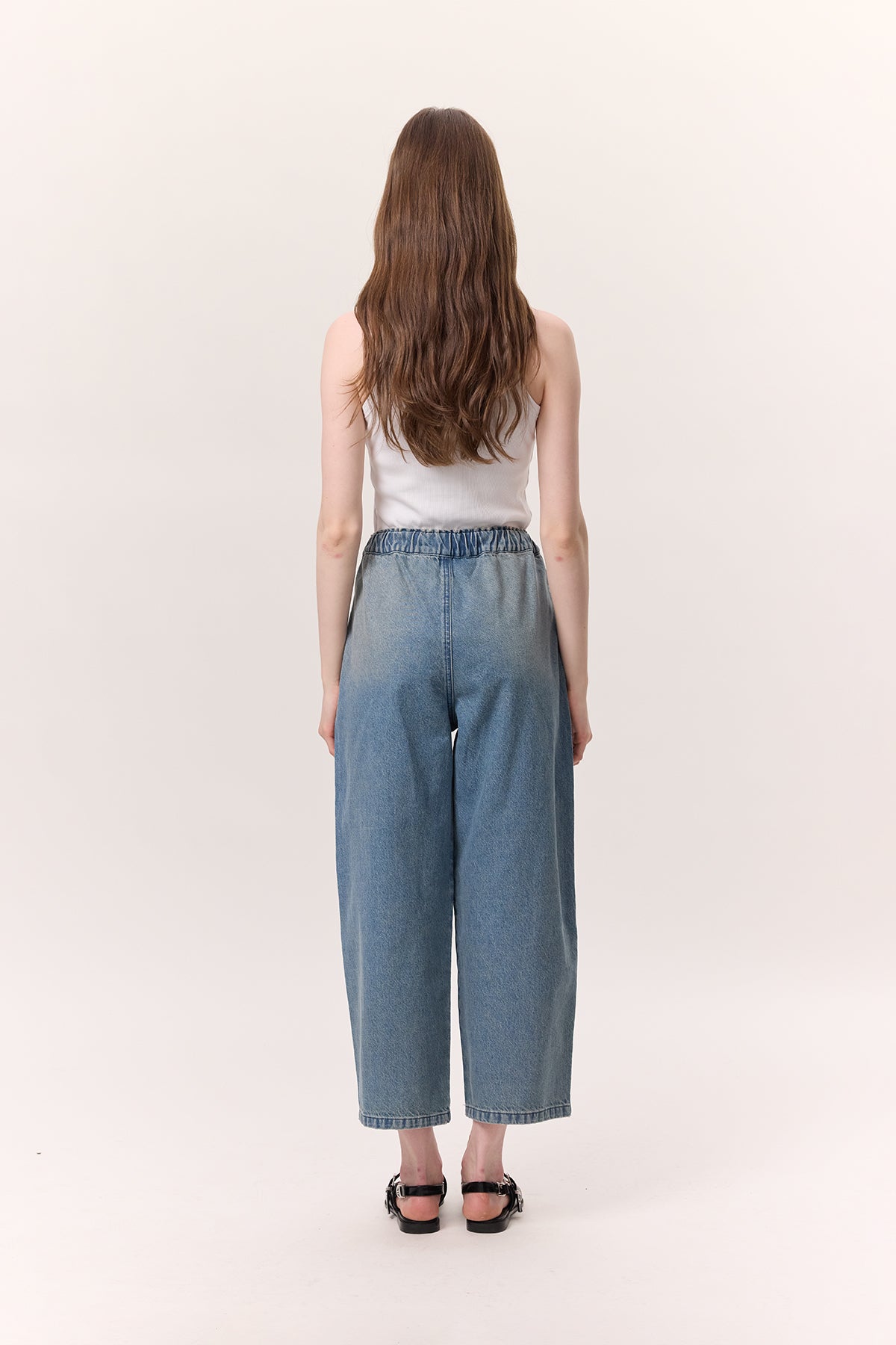 Adjustable Waist Relaxed Denim Pants Blue
