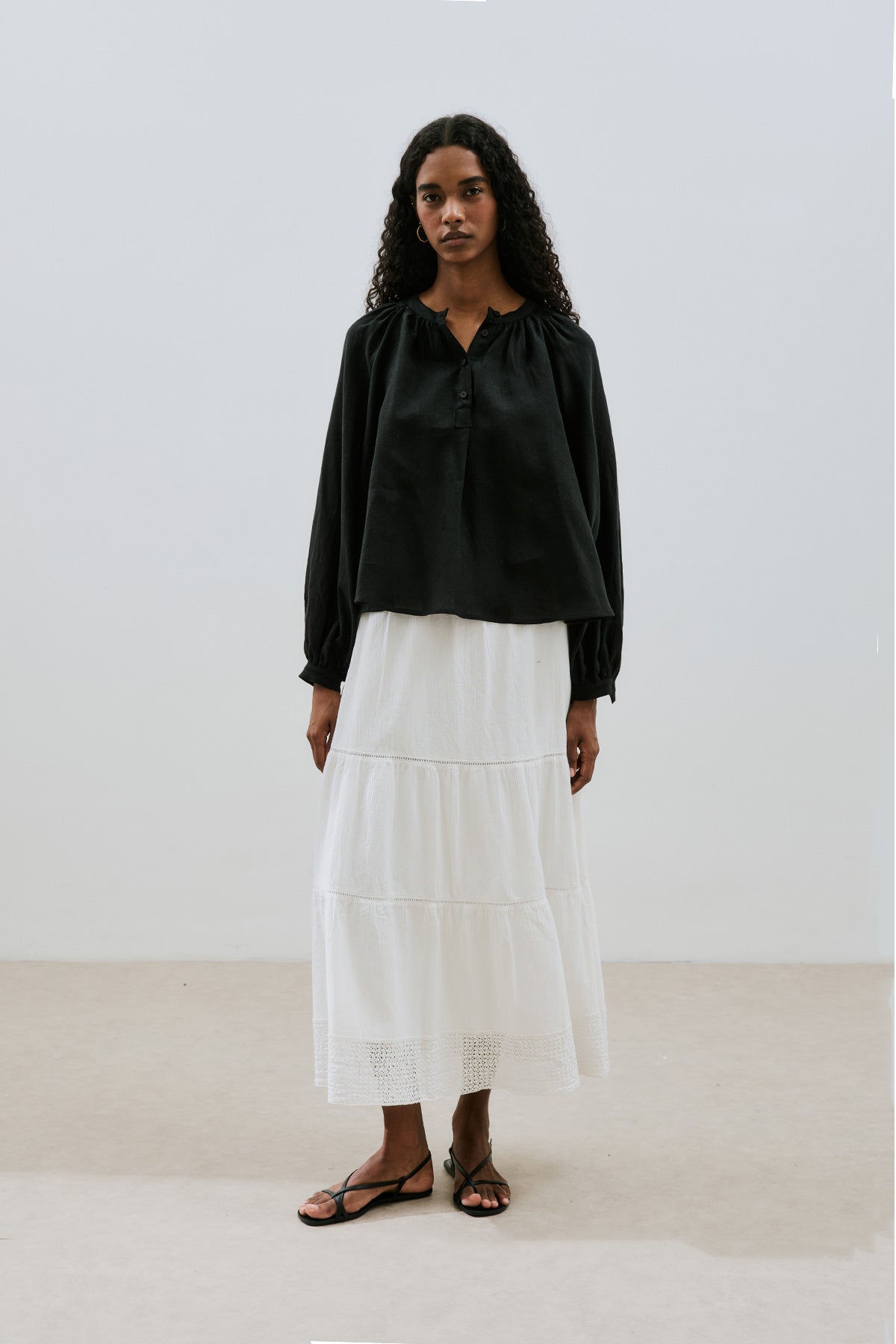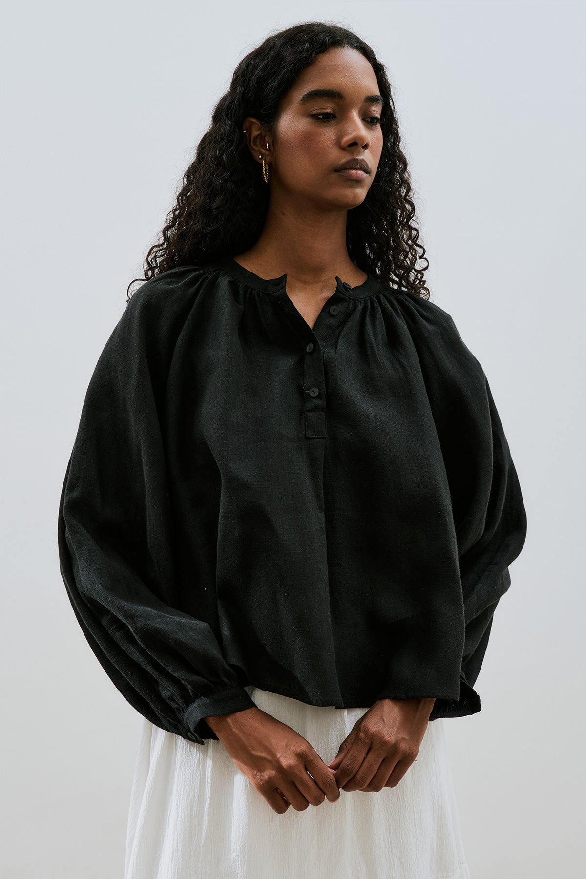 Round mandarin collar, button closure, long raglan balloon sleeves with cuffs.