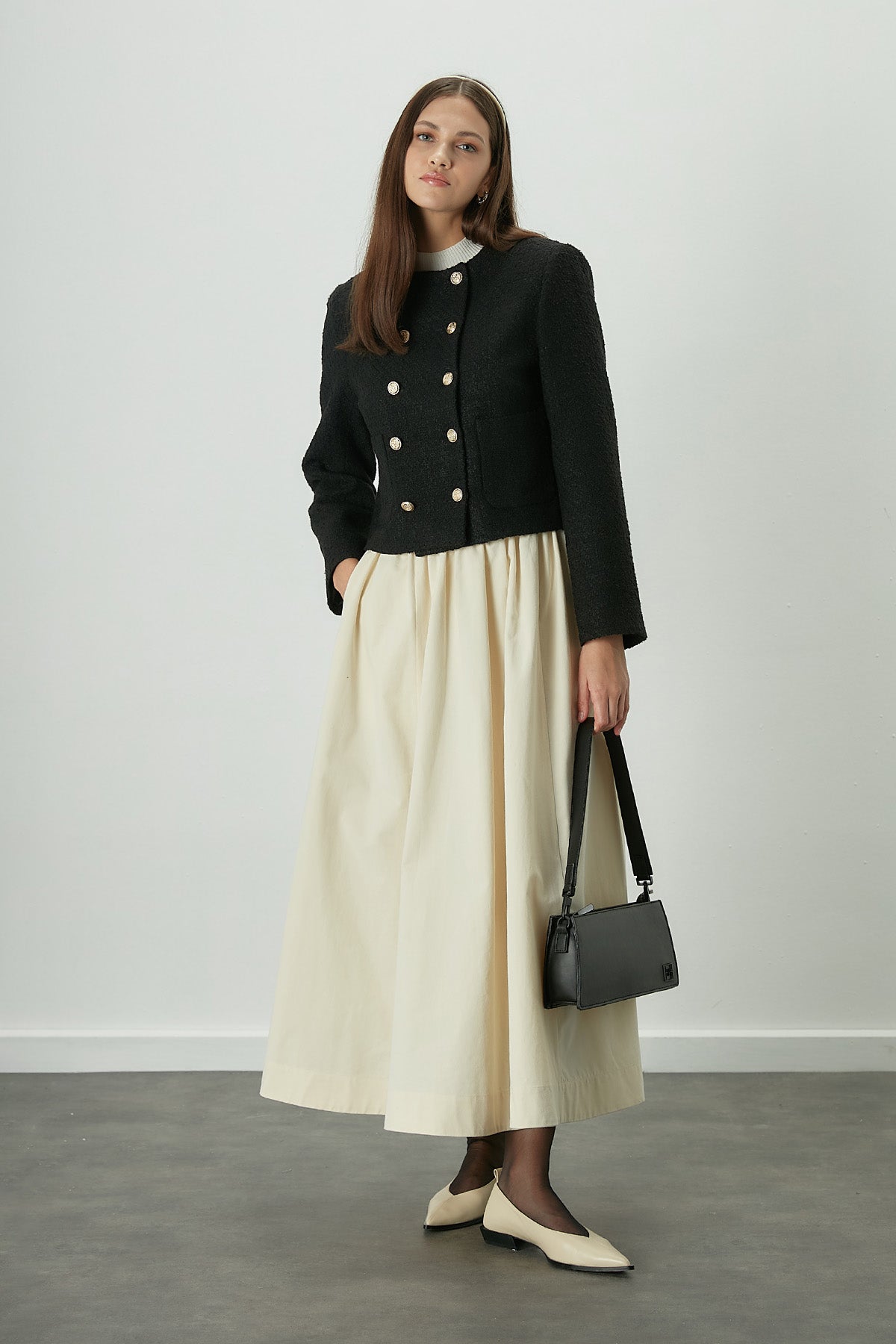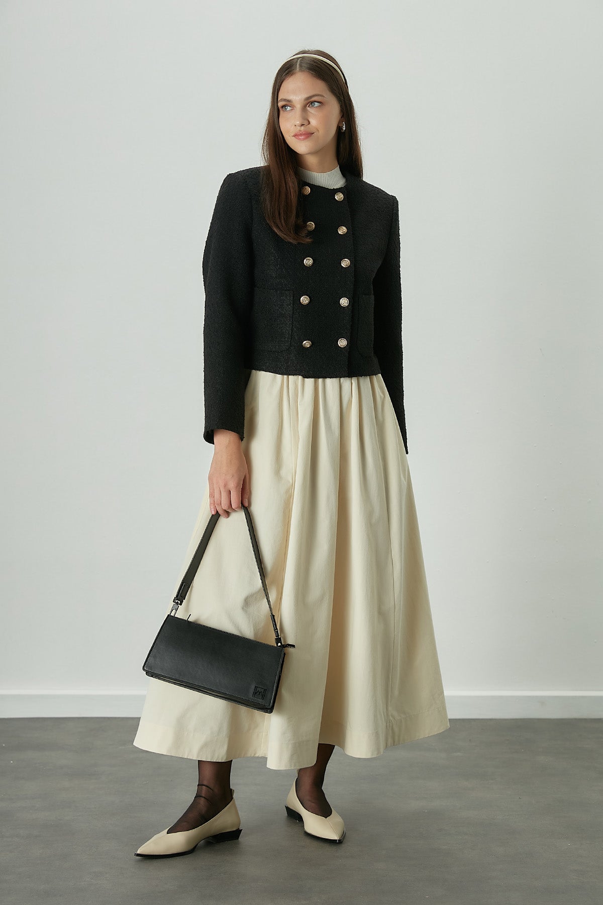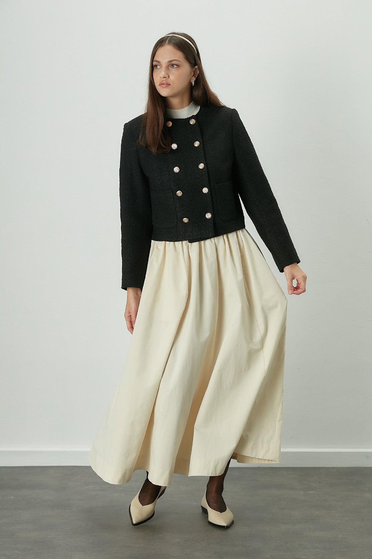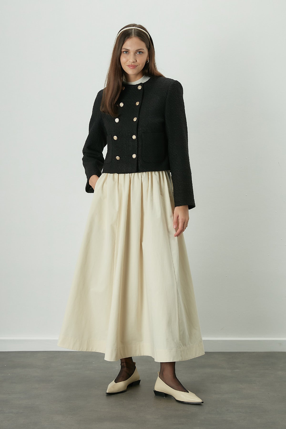 Comfort meets elegance. This skirt is designed to fit snugly at the waist, featuring a concealed zipper closure for a seamless look. The shirred detailing and unique stitching add a touch of sophistication, while the cotton gabardine fabric ensures durability and comfort. A versatile piece that embodies chic simplicity.