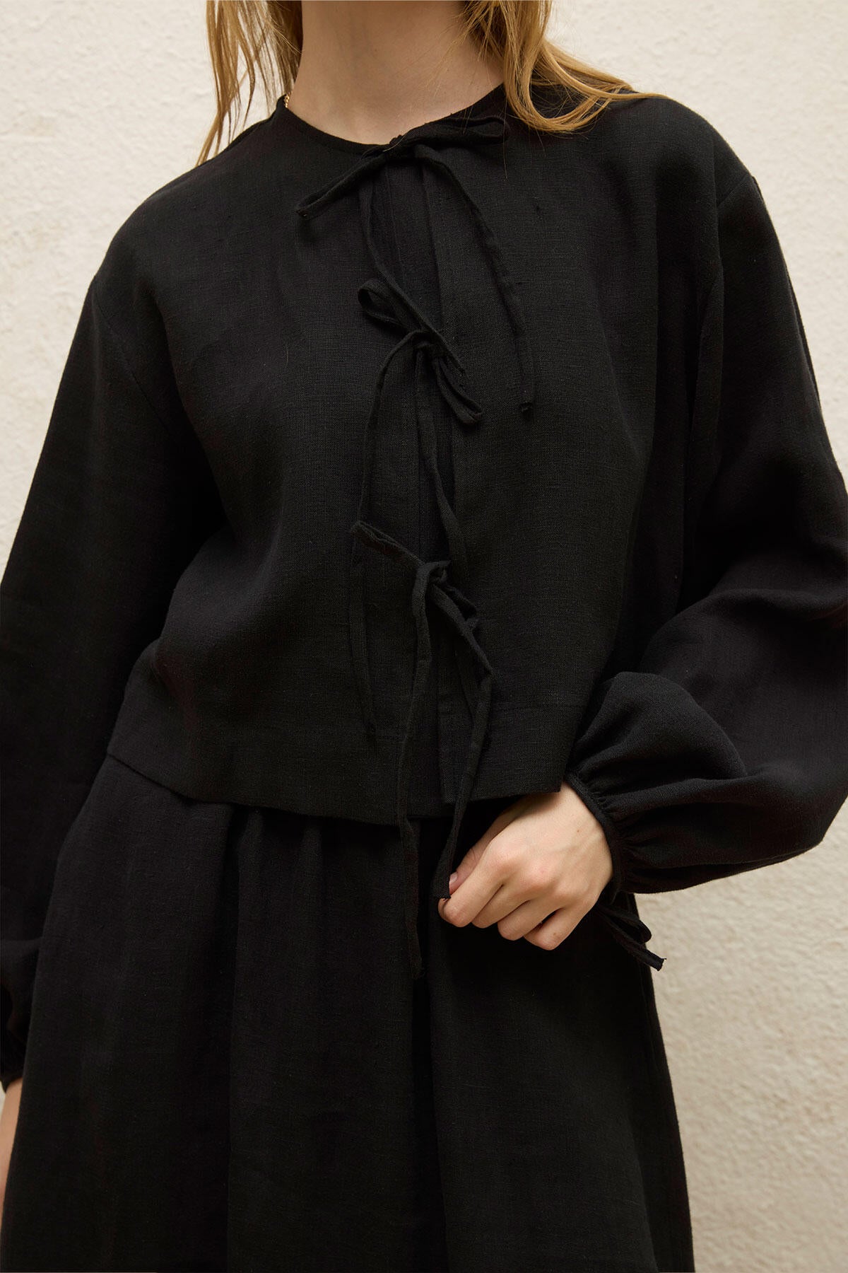 This top features a round neckline, tie detail, and balloon sleeves. Made from 100% linen fabric.