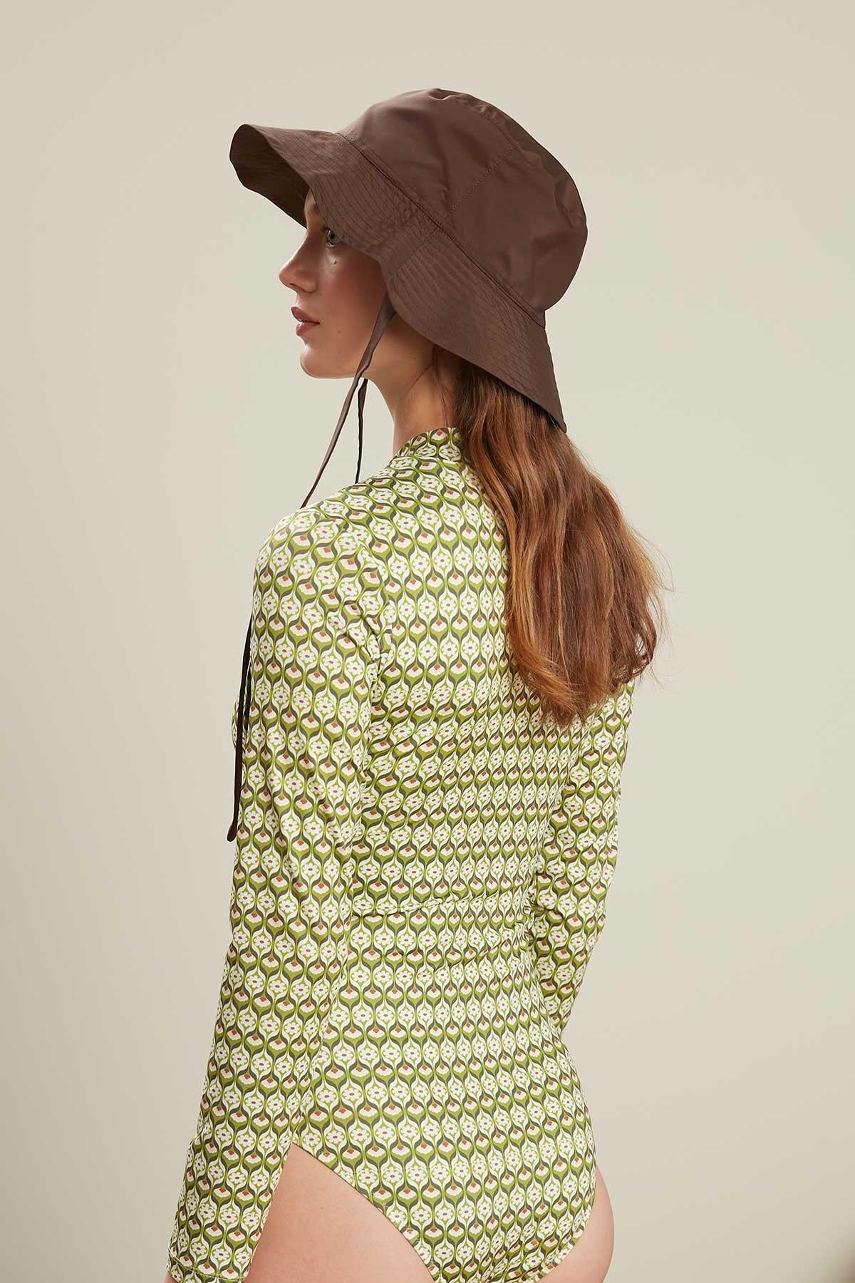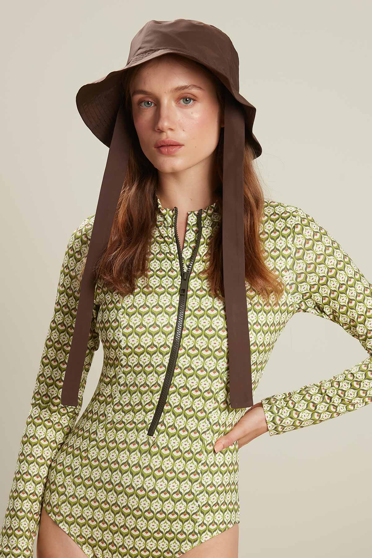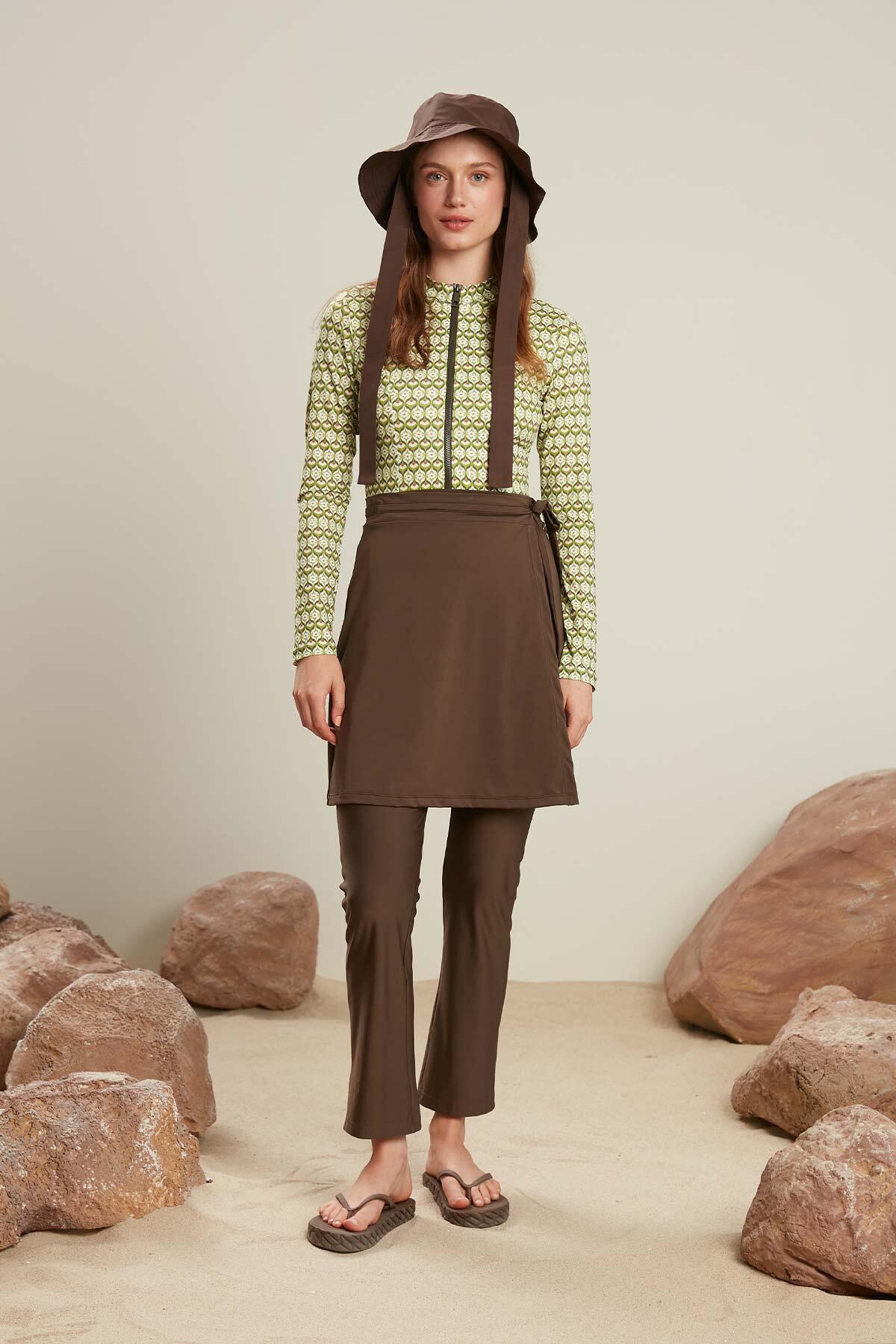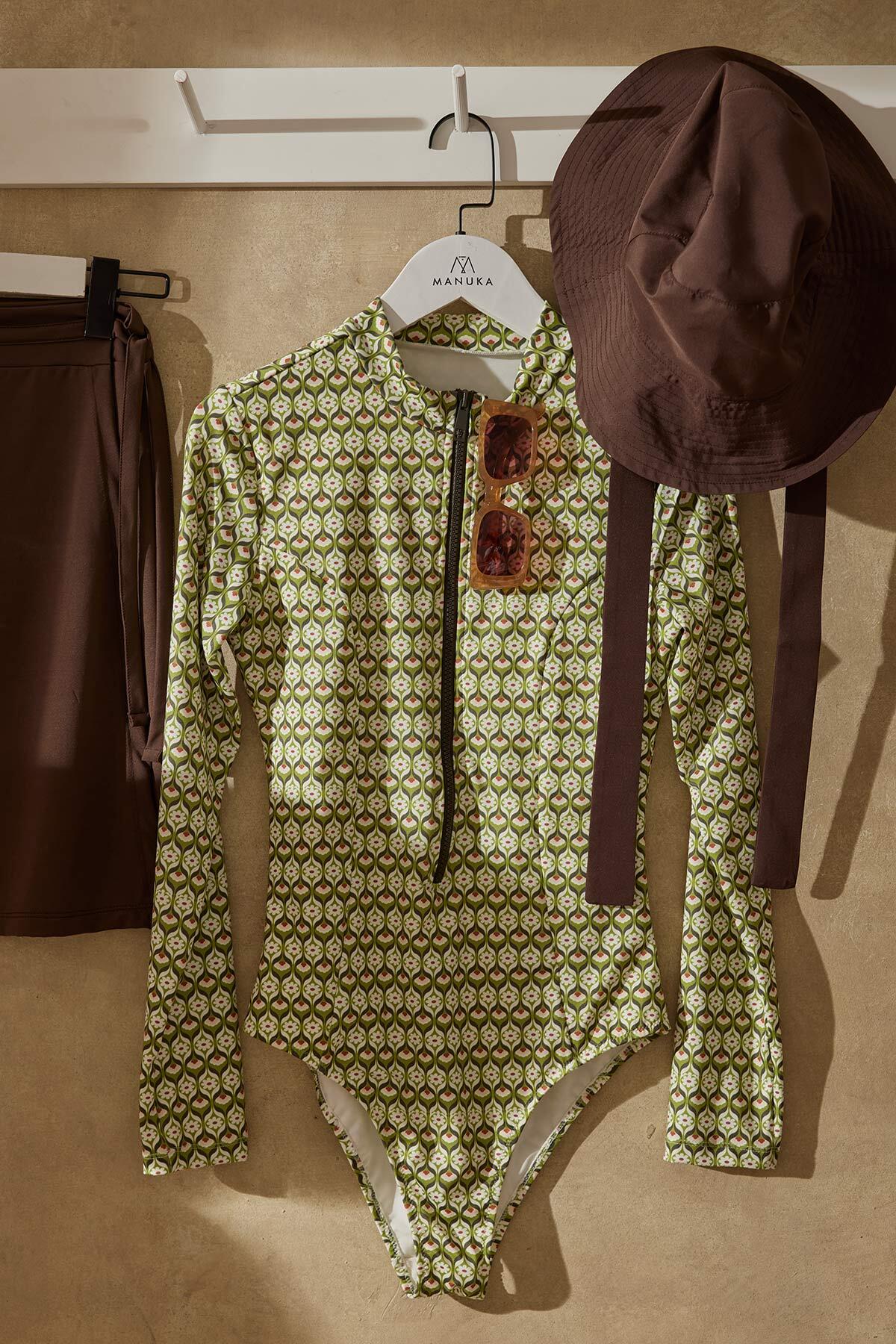 Crafted from flexible swimwear fabric with a composition of 90% polyester and 10% elastane, this swimsuit offers both comfort and stretch for a flattering fit. The high neckline and front zipper closure ensure a secure and stylish look, while the padded cups provide support and shape to the bust. Designed with a vibrant pattern, it adds a pop of color to your poolside ensemble (only includes the upper part of the swimsuit).