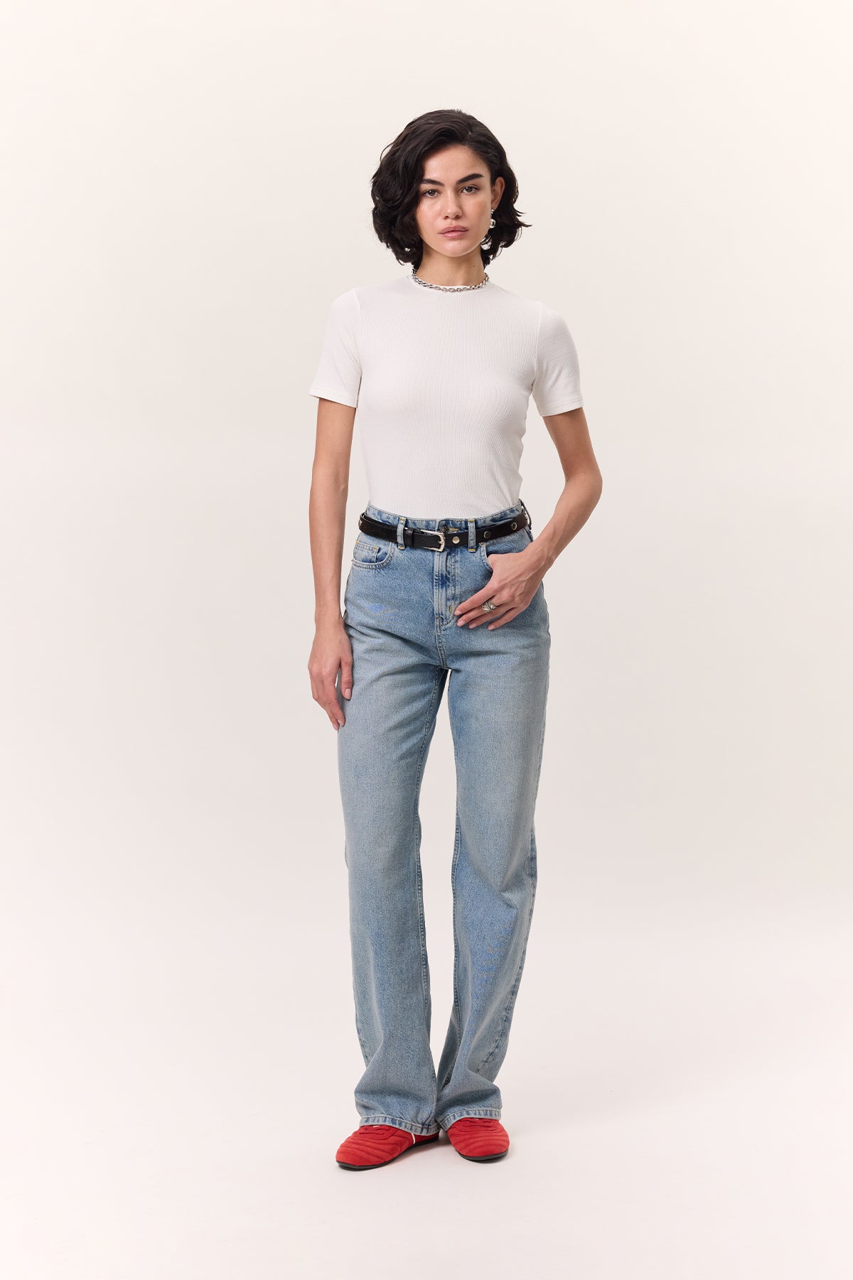 Crew neck, short sleeves, slim fit.