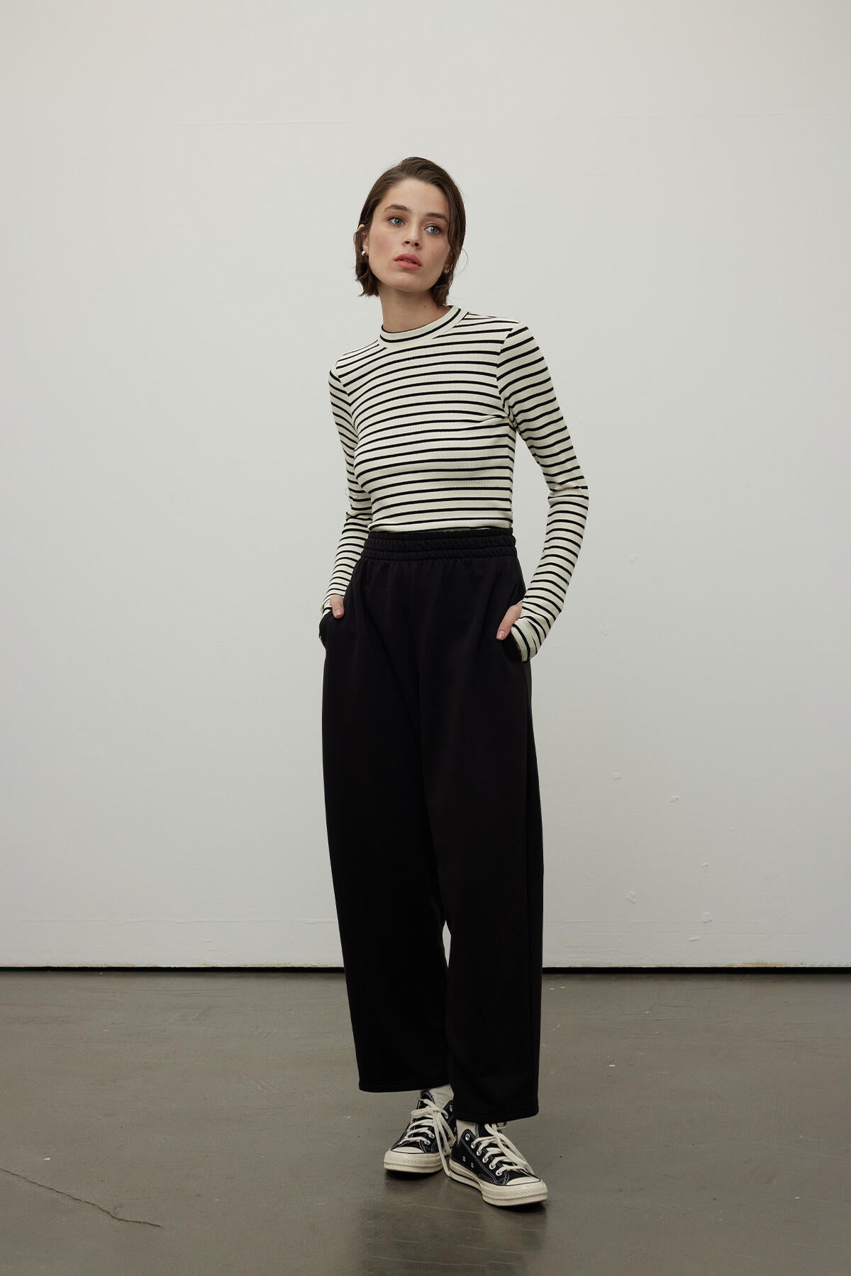 The striped finger sleeve bodysuit offers a stylish and comfortable option for your wardrobe. With its high neckline and slim fit, it provides a flattering silhouette. The bodysuit features fine stripes and ribbed detailing, adding a touch of texture and visual interest. The finger sleeve detail gives it a unique and trendy look. Crafted from a blend of cotton, polyester, and elastane, it ensures a soft and stretchy feel for all-day comfort.