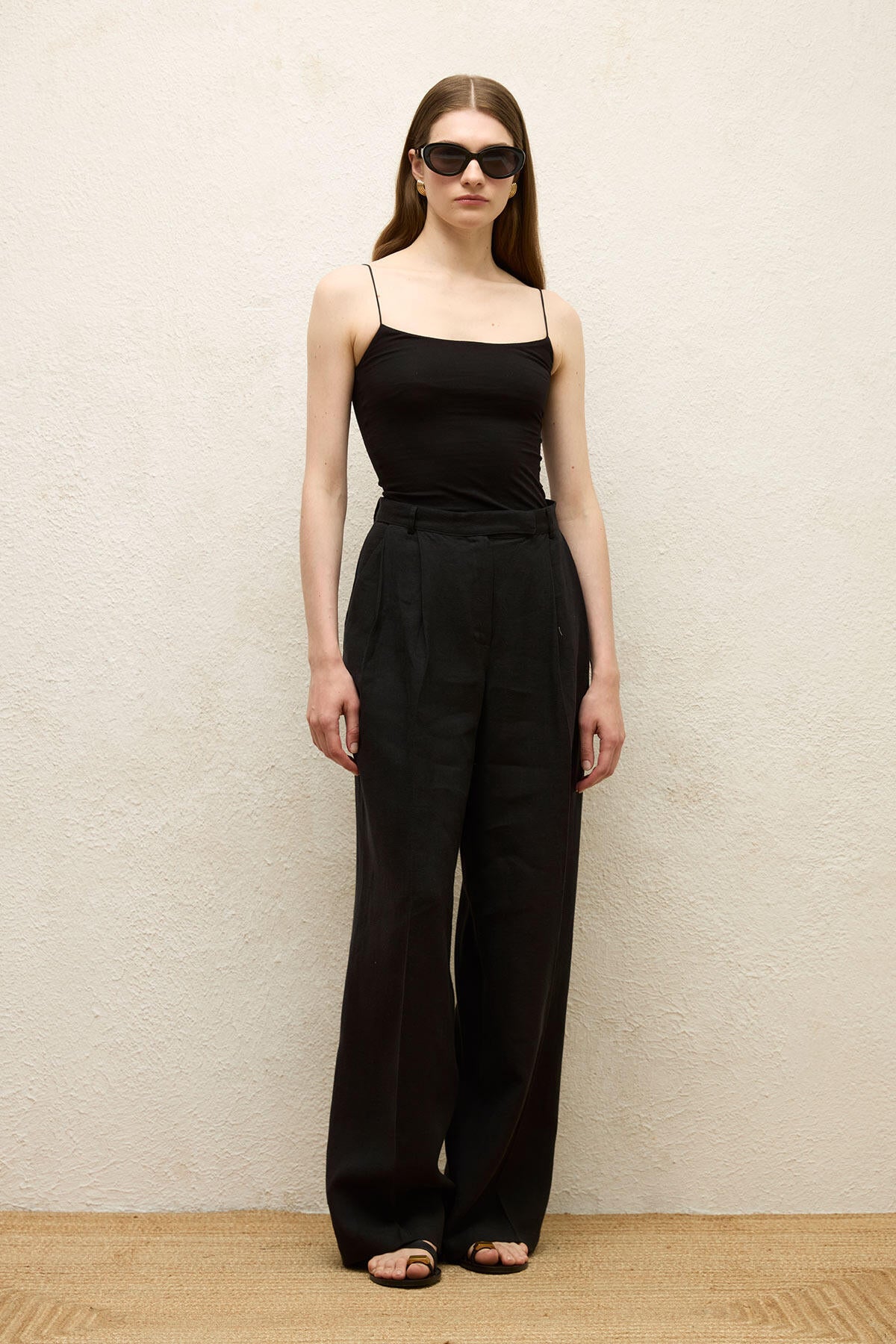 These high-waisted, full-length pants feature side pockets, asymmetrical pleat details, wide legs, and a hook-and-eye closure.