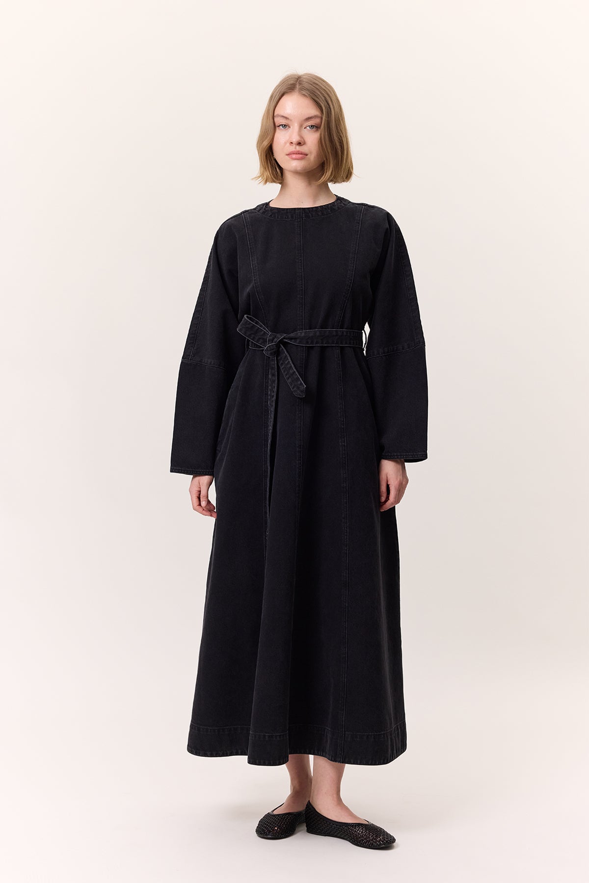 Wide Sleeve Belted Denim Dress Black