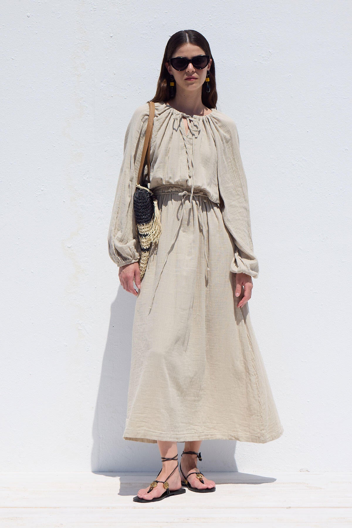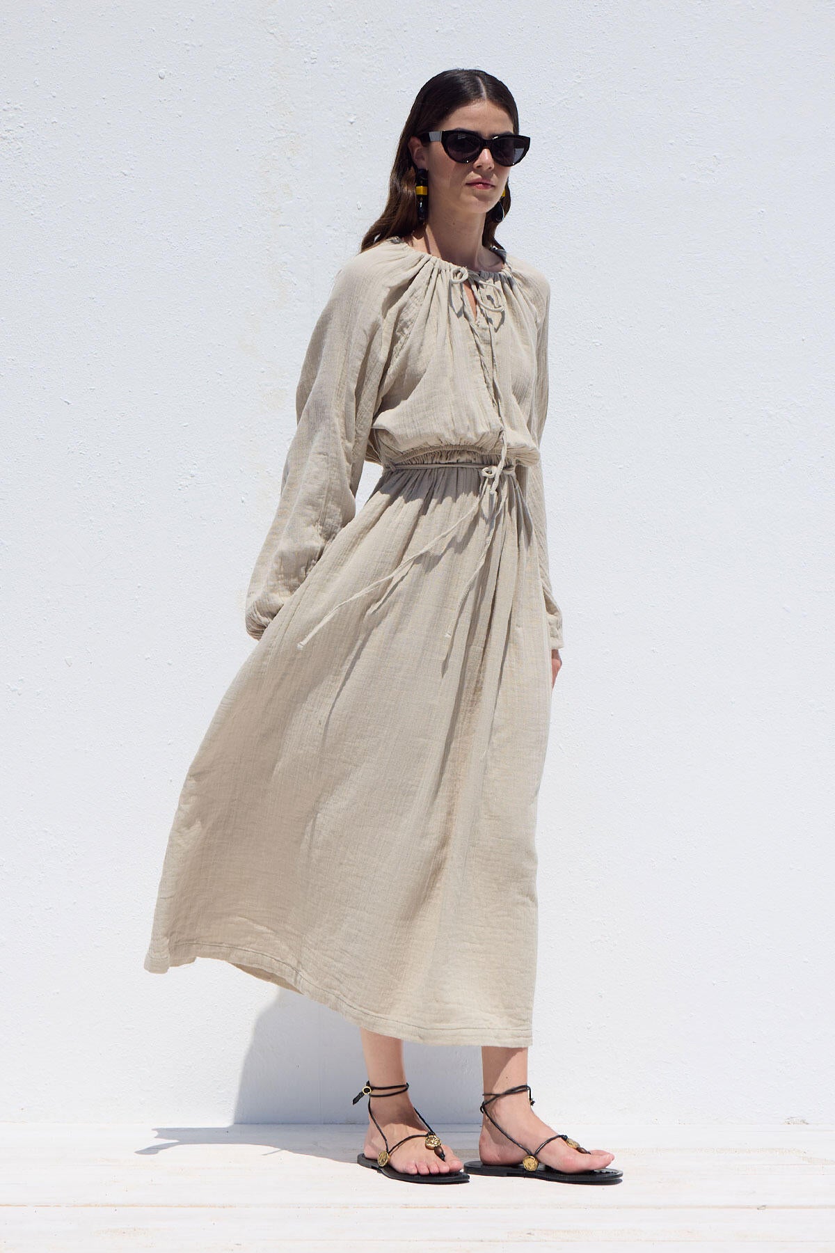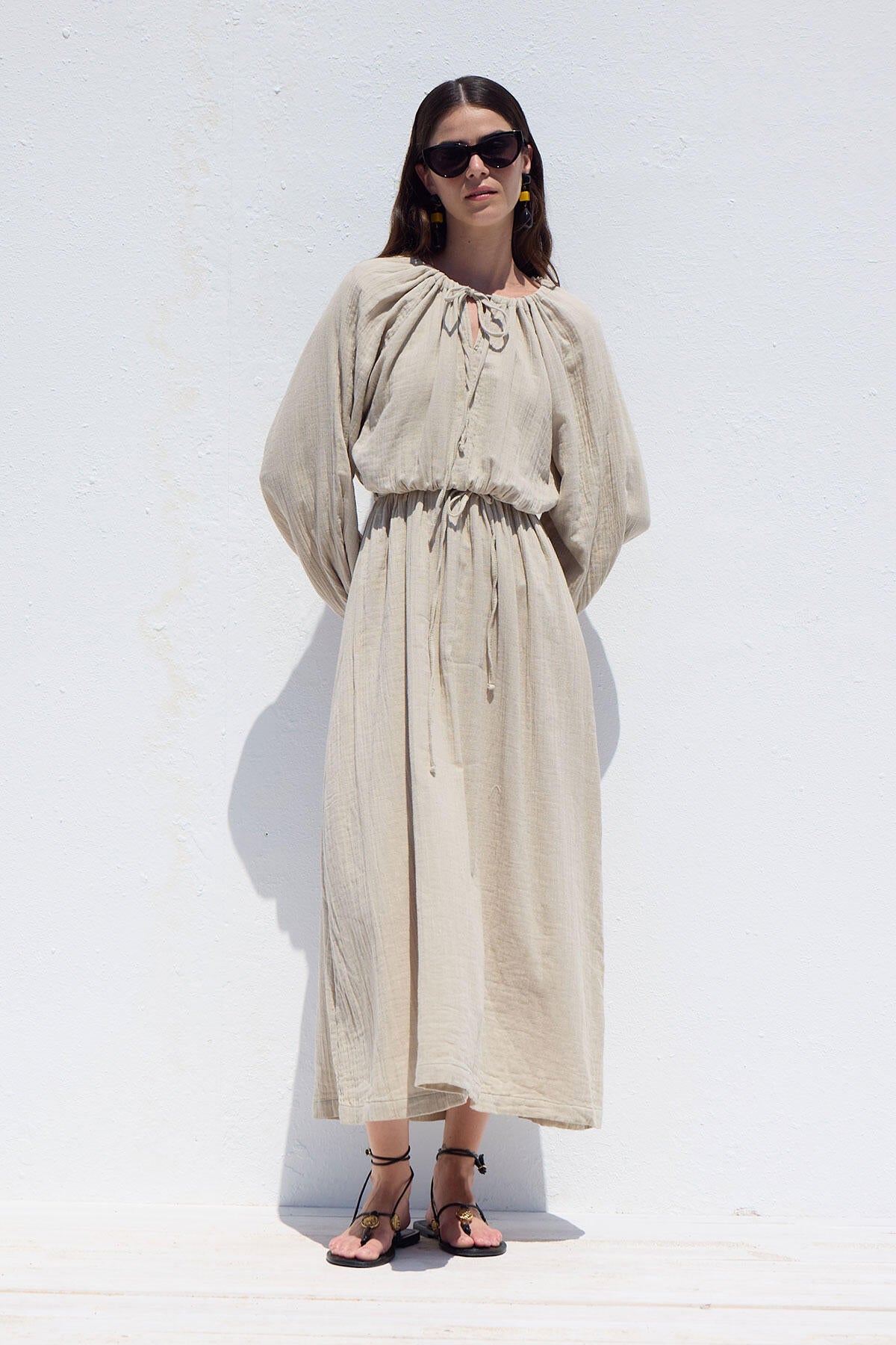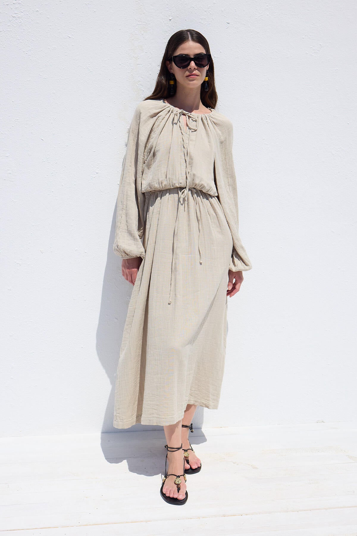 This dress features an adjustable drawstring neckline, raglan balloon sleeves, full length, and ruching details. It is unlined and made from muslin fabric.