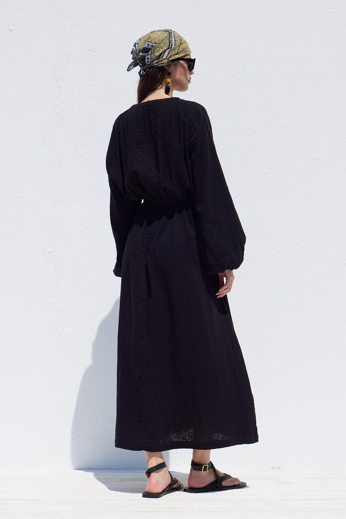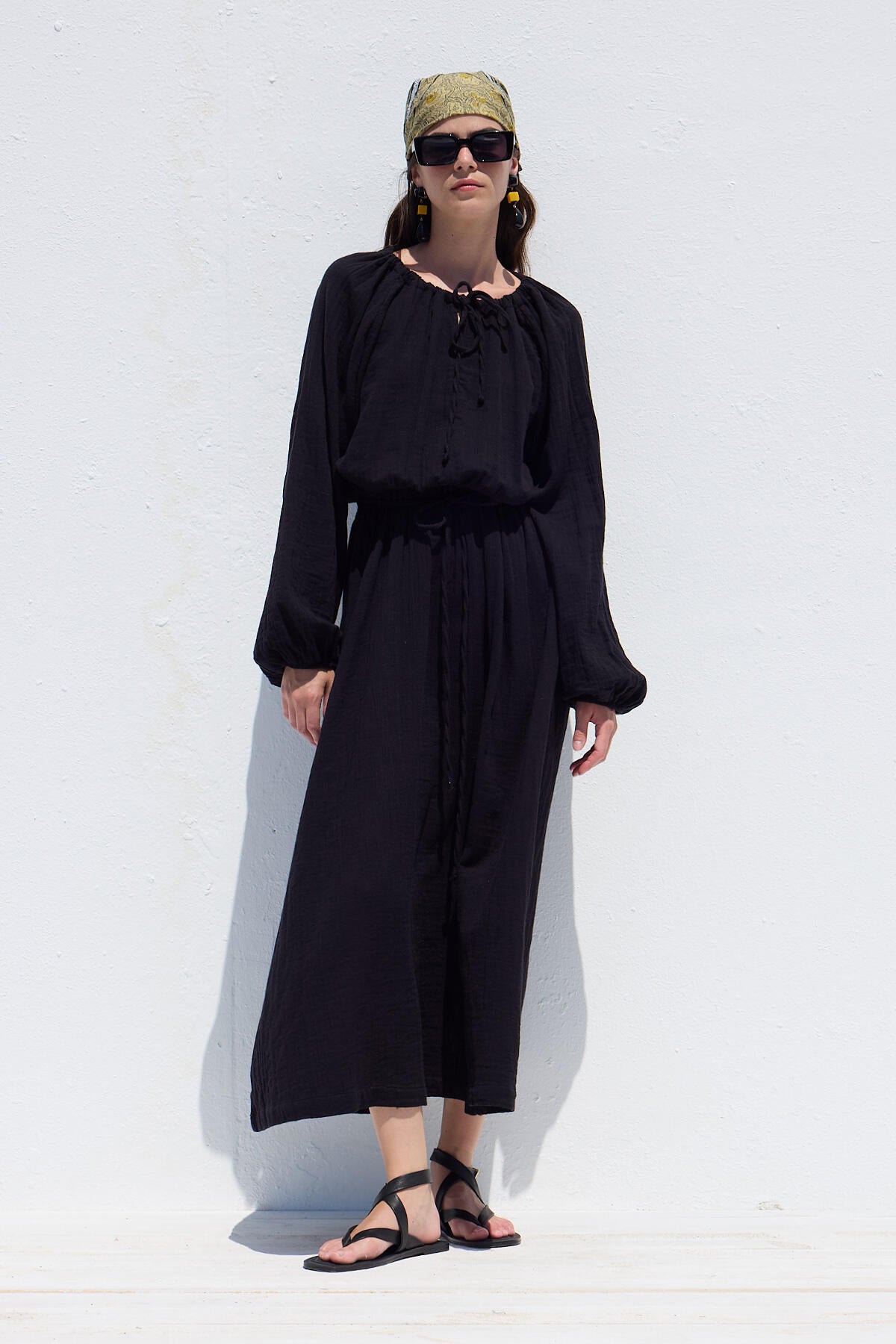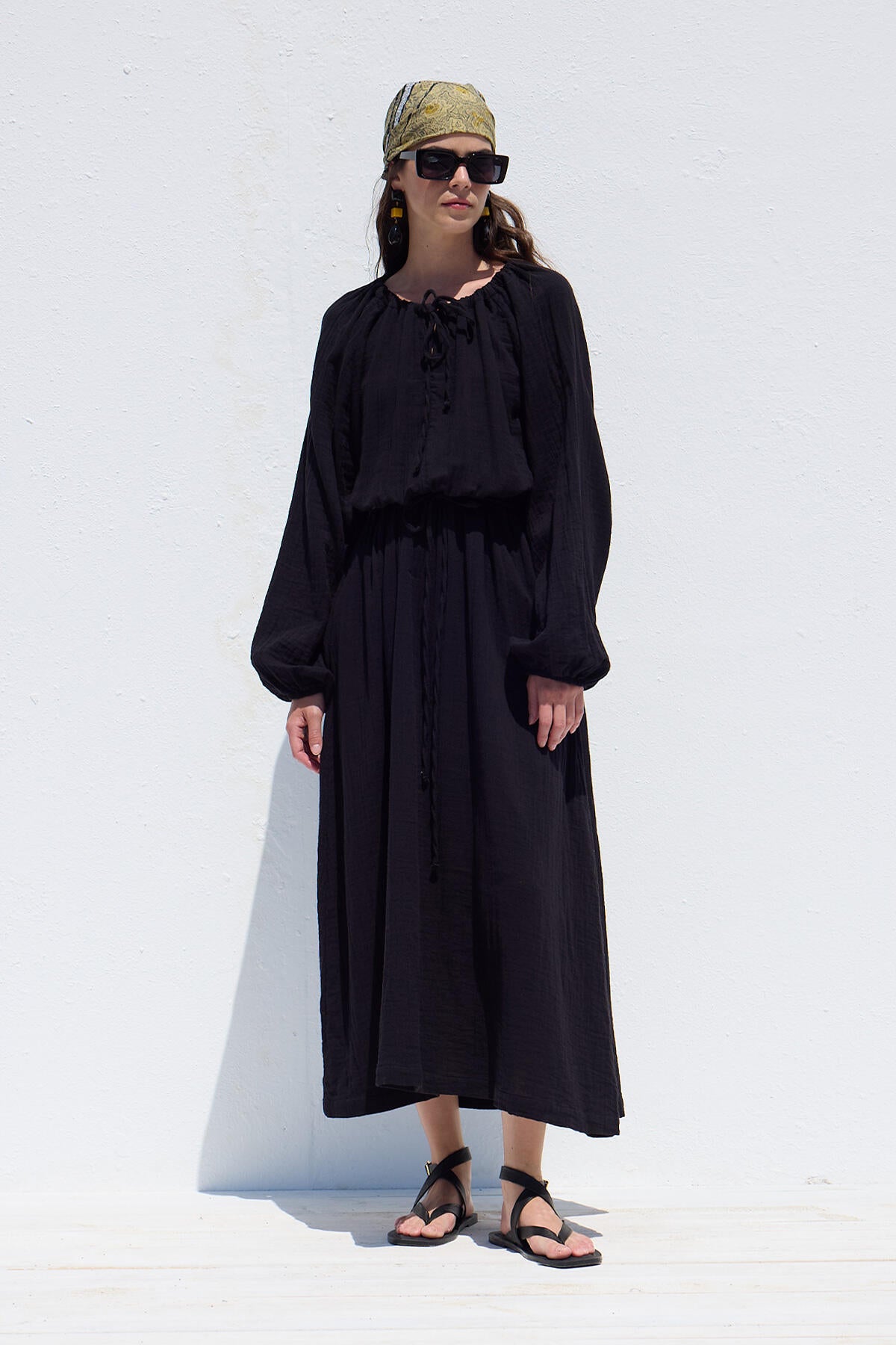 This dress features an adjustable drawstring neckline, raglan balloon sleeves, full length, and ruching details. It is unlined and made from muslin fabric.