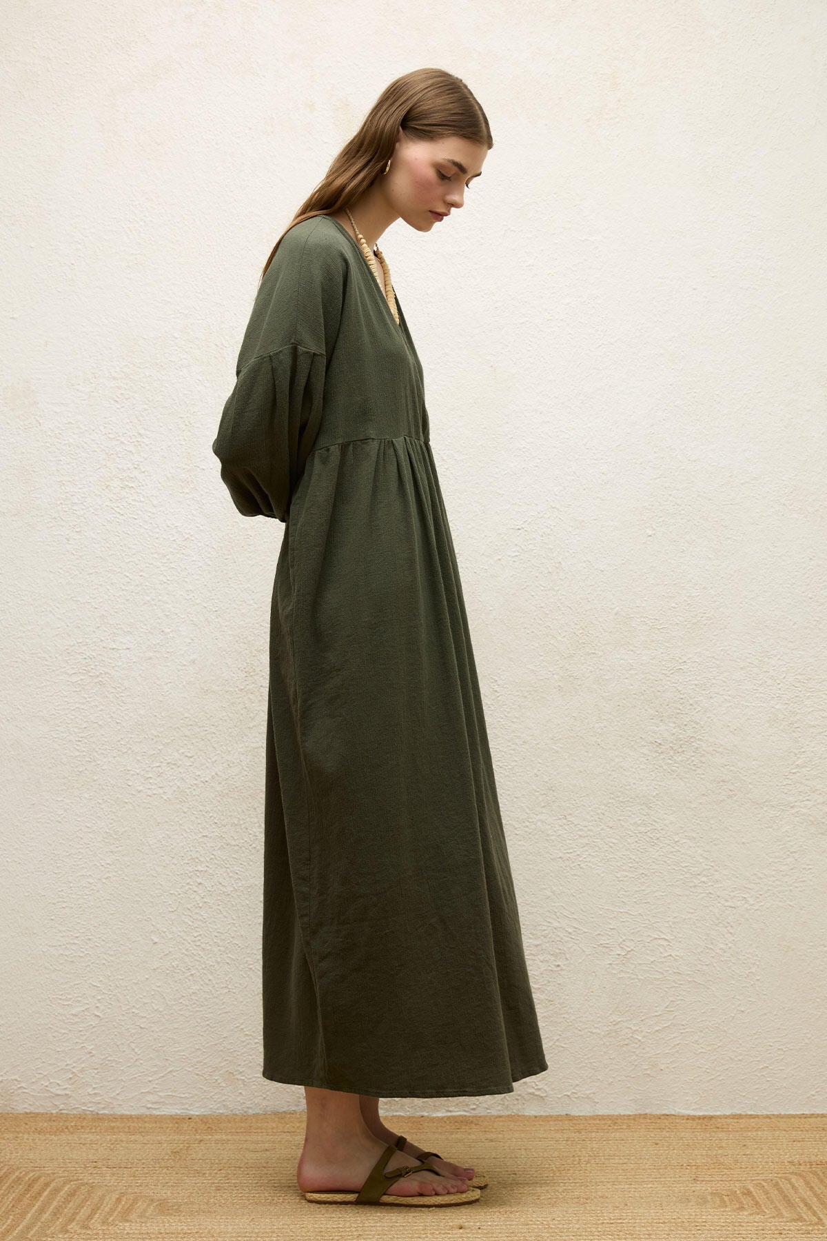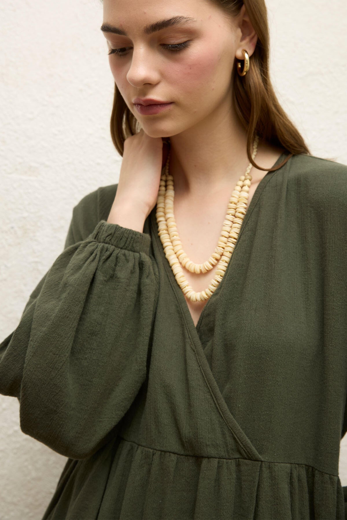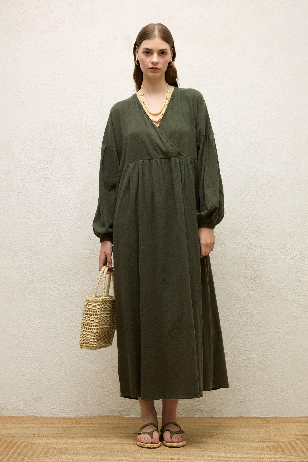 This full-length dress features a wrap neckline, long balloon sleeves, and gathered details.