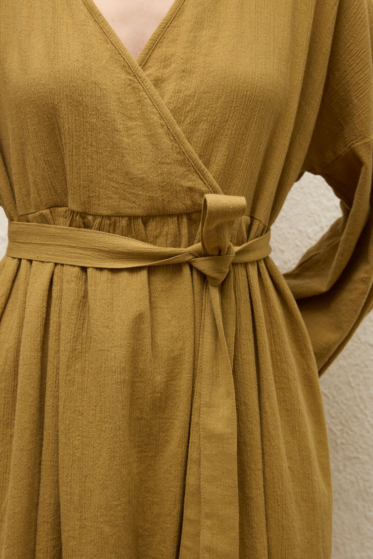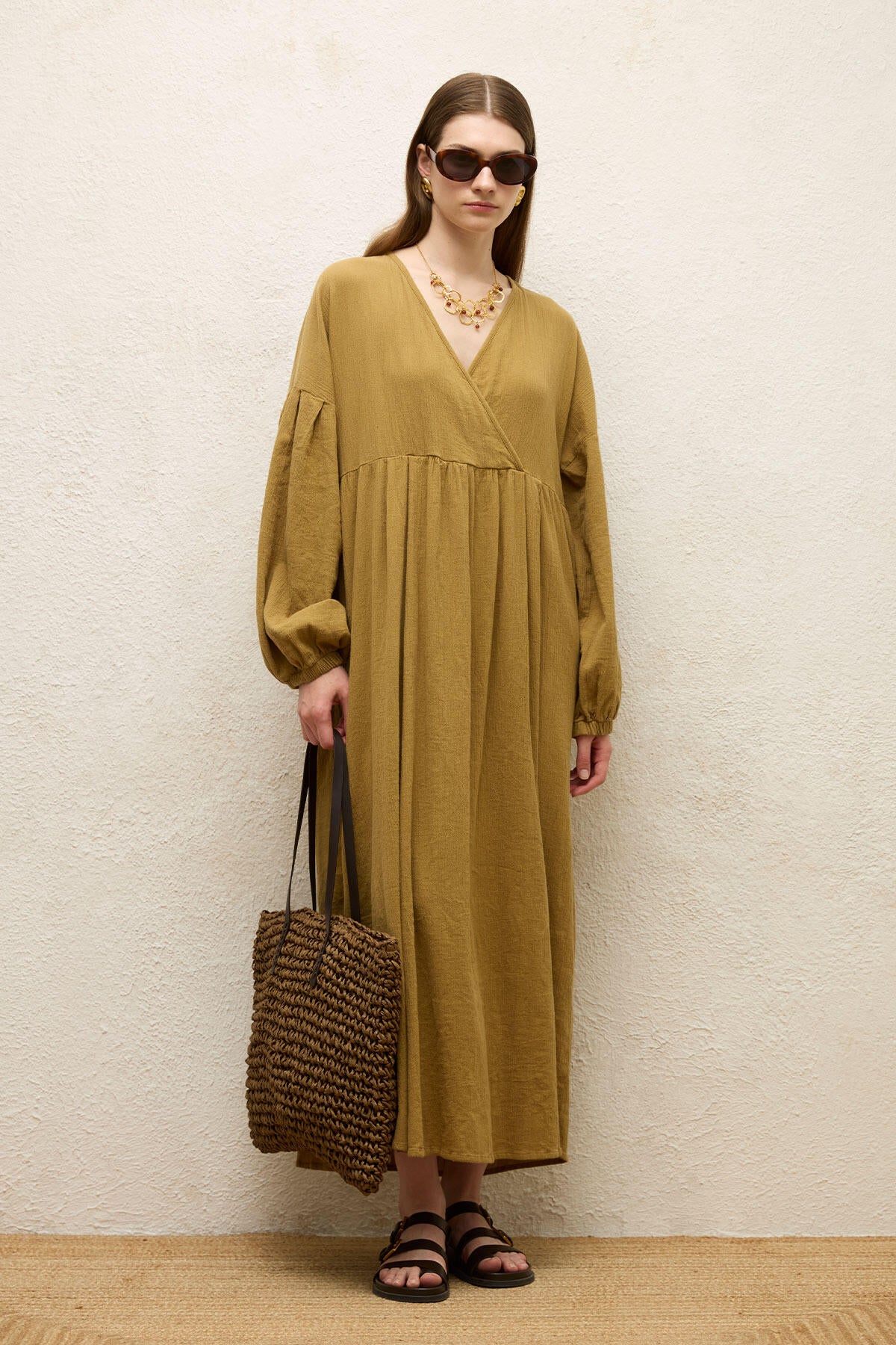 This full-length dress features a wrap neckline, long balloon sleeves, and gathered details.