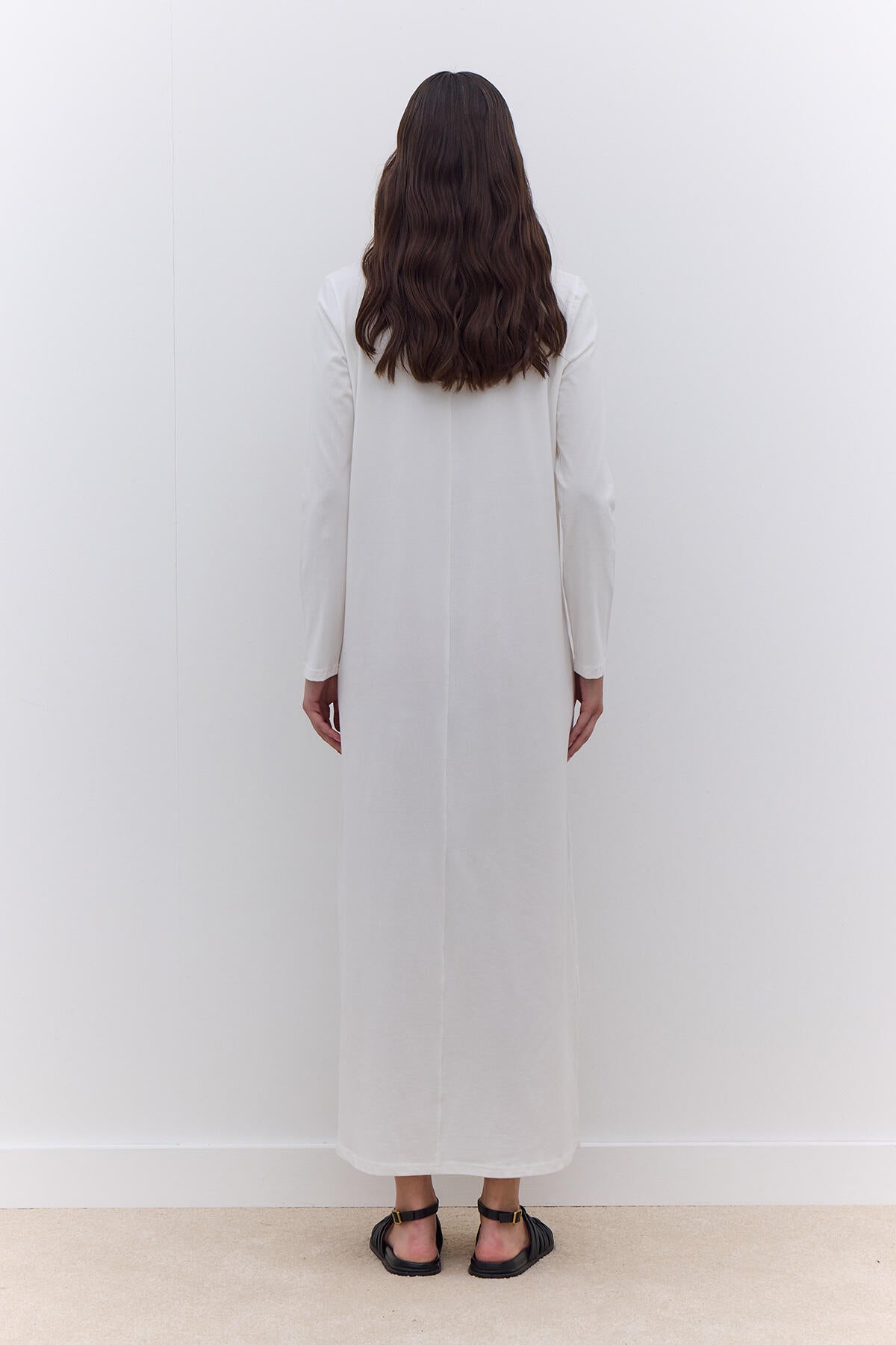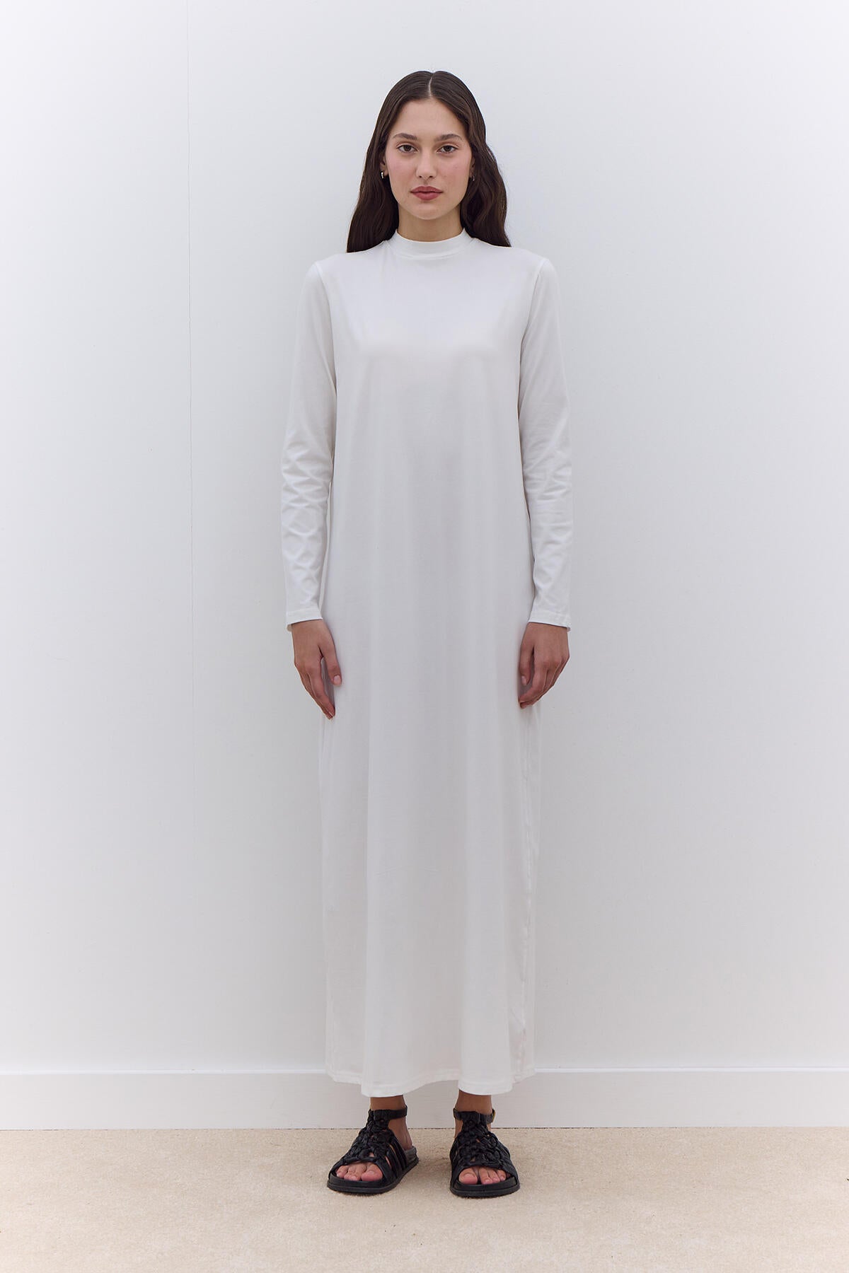 High round neckline, long sleeves, ankle length, regular fit, made from stretchy knit fabric.