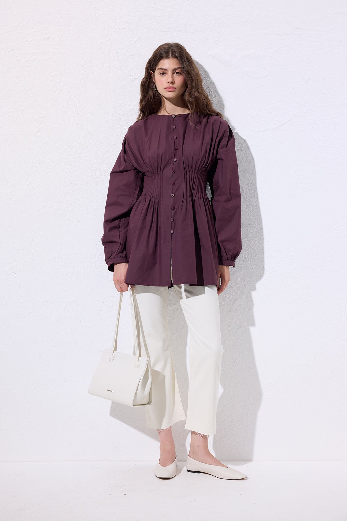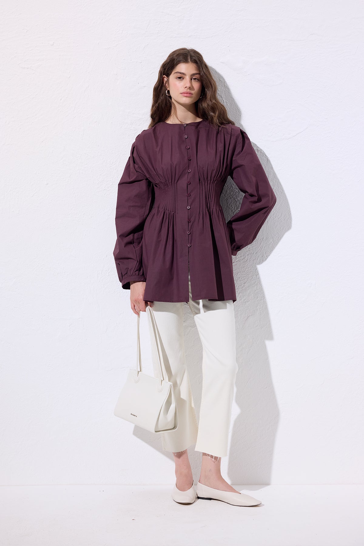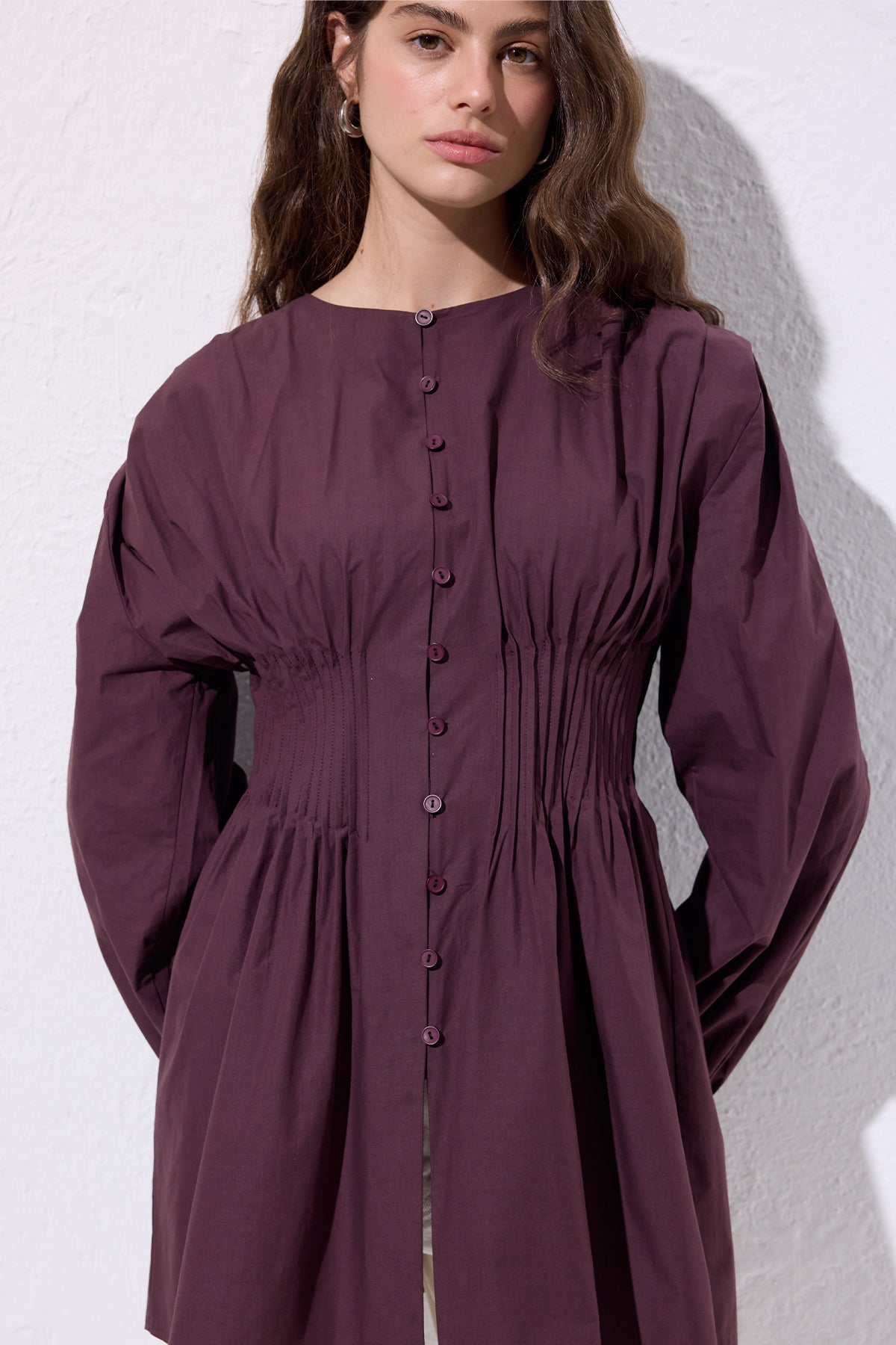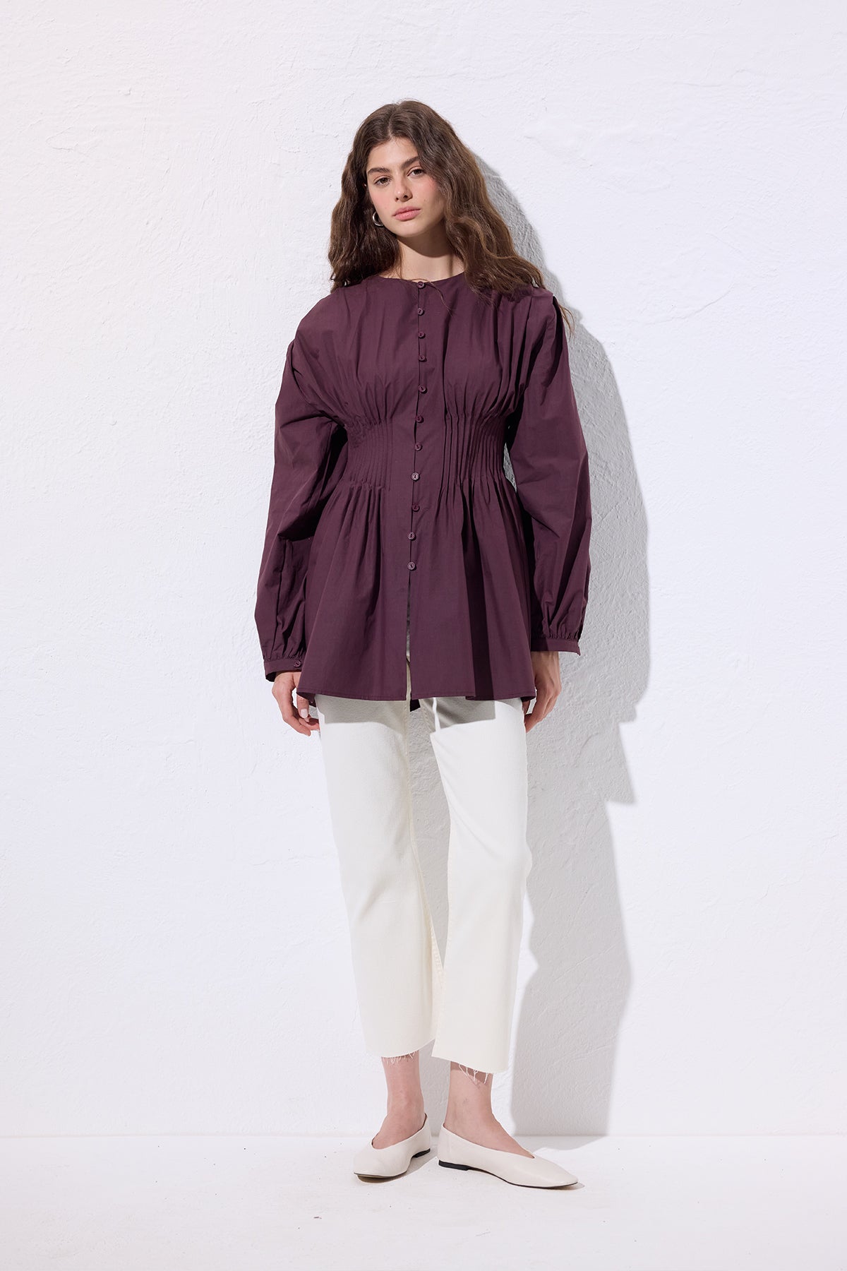 Long-Sleeve Pleated Blouse Damson