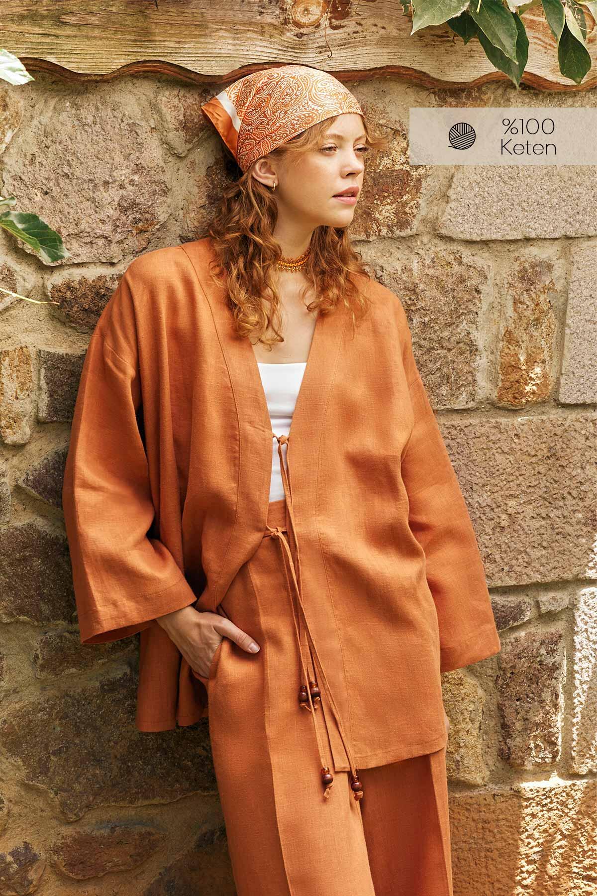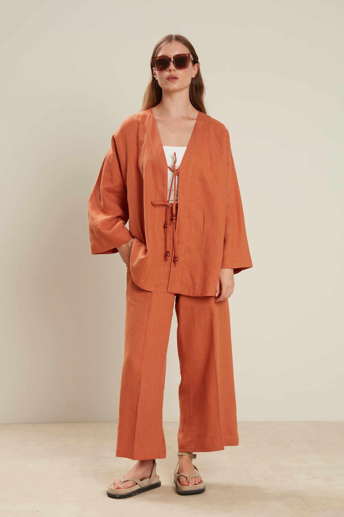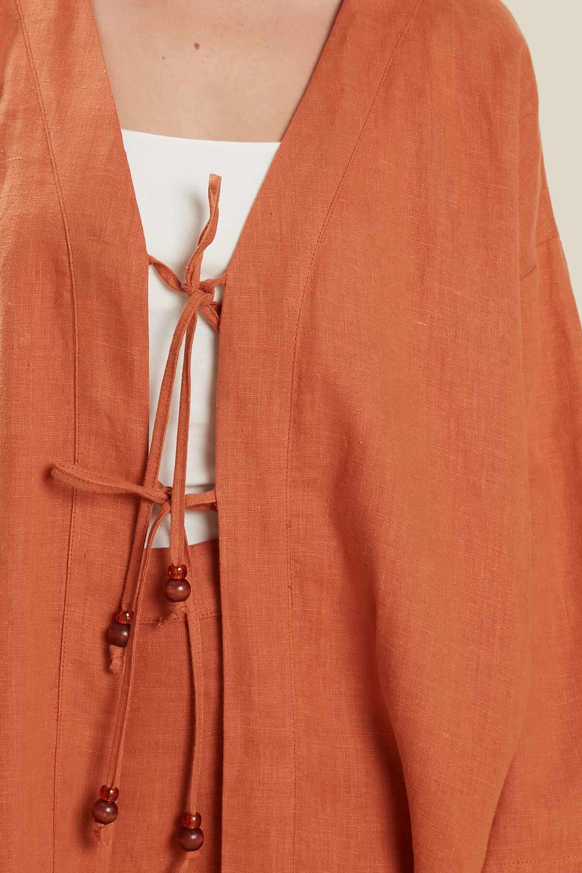 Crafted from 100% linen for unmatched breathability and comfort, this piece features a relaxed, wide fit with dropped shoulders, embodying effortless elegance. Adorned with beaded cord details for an added touch of sophistication, this kimono is the epitome of chic, laid-back style.