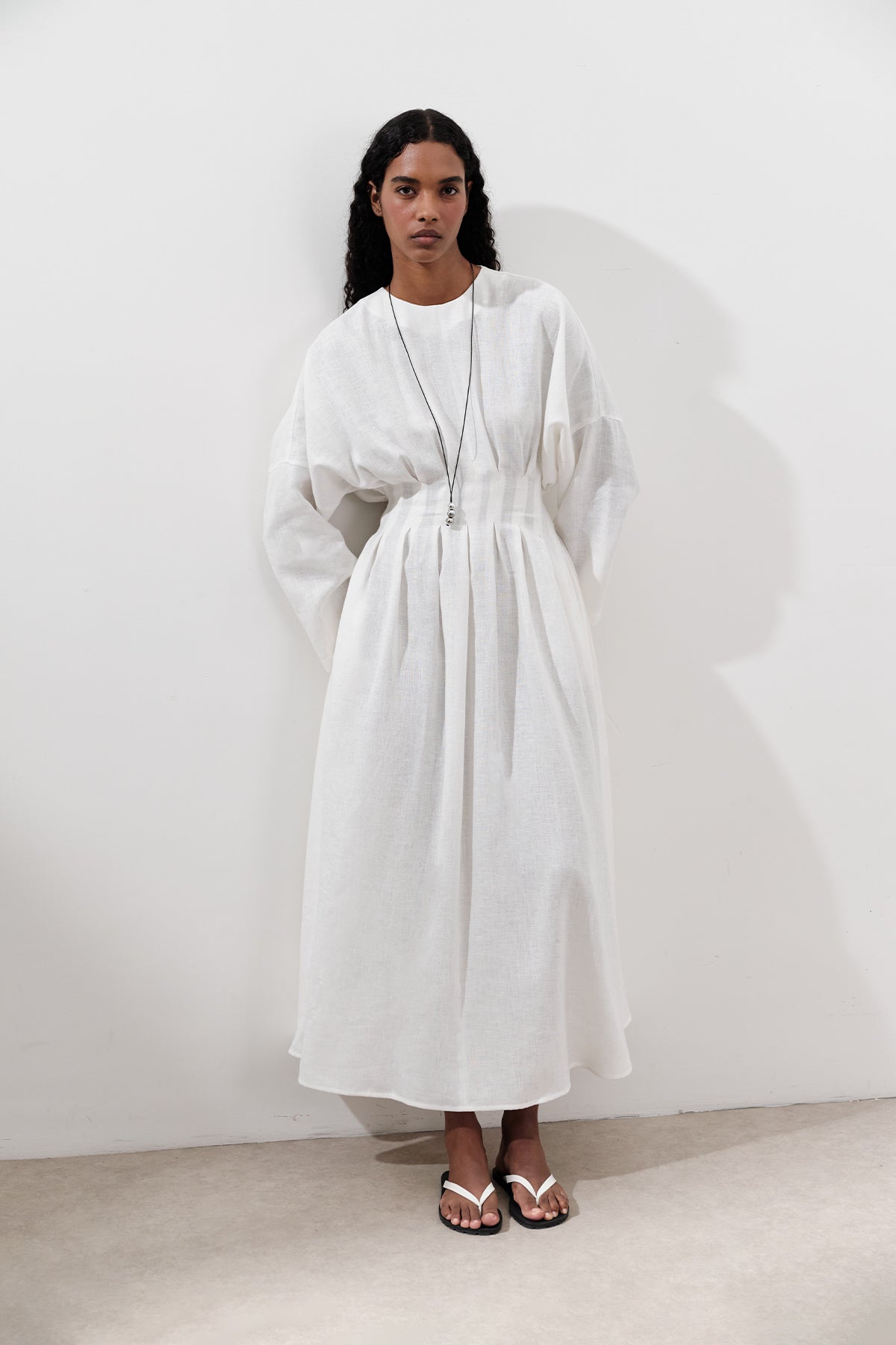 Linen Pleat Detail Dress Ecru