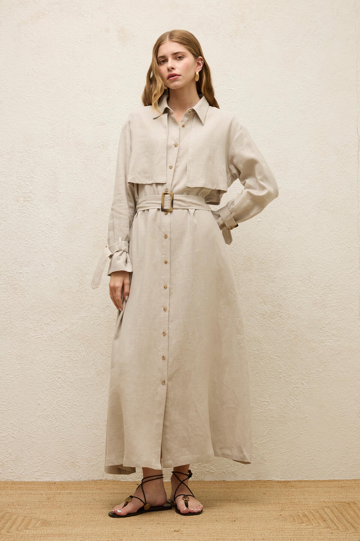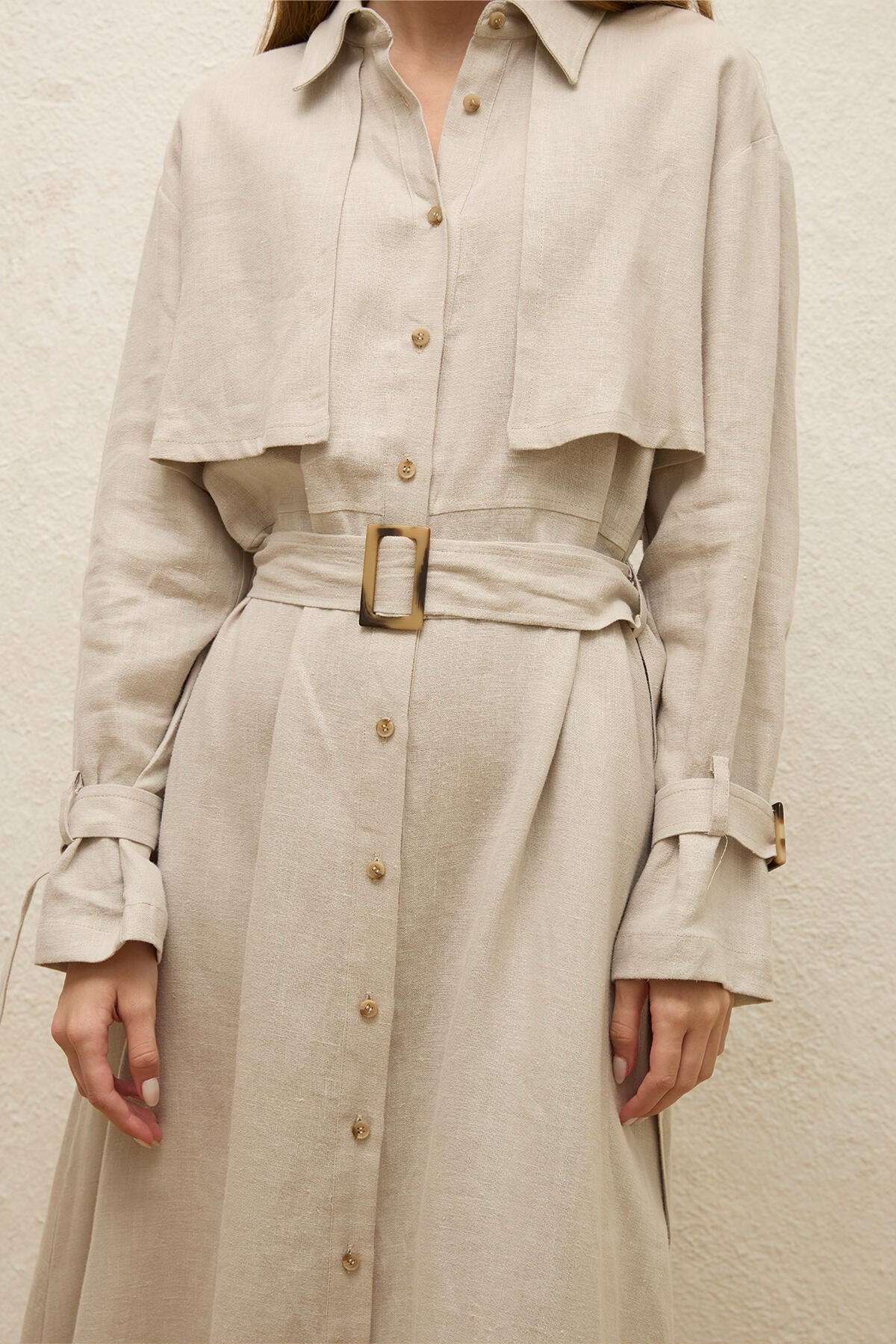 Windbreaker design, shirt collar, button closure, belt detail at the waist and sleeves, full length.