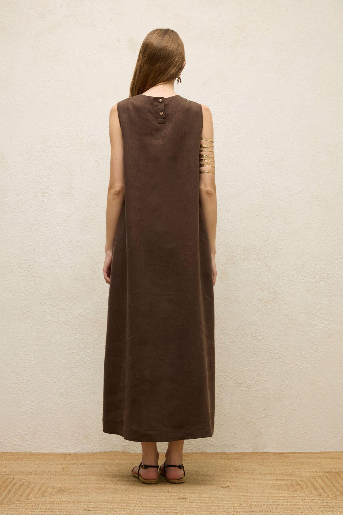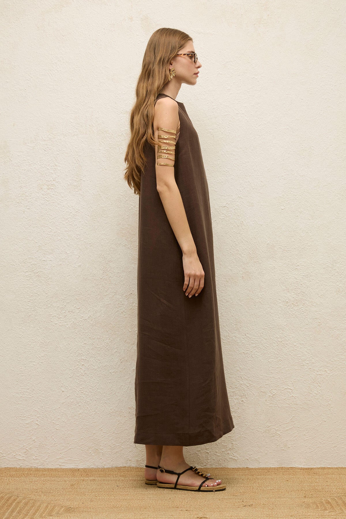 This full-length dress features stitch detailing, a round neckline, sleeveless design, back keyhole closure, and a belt.