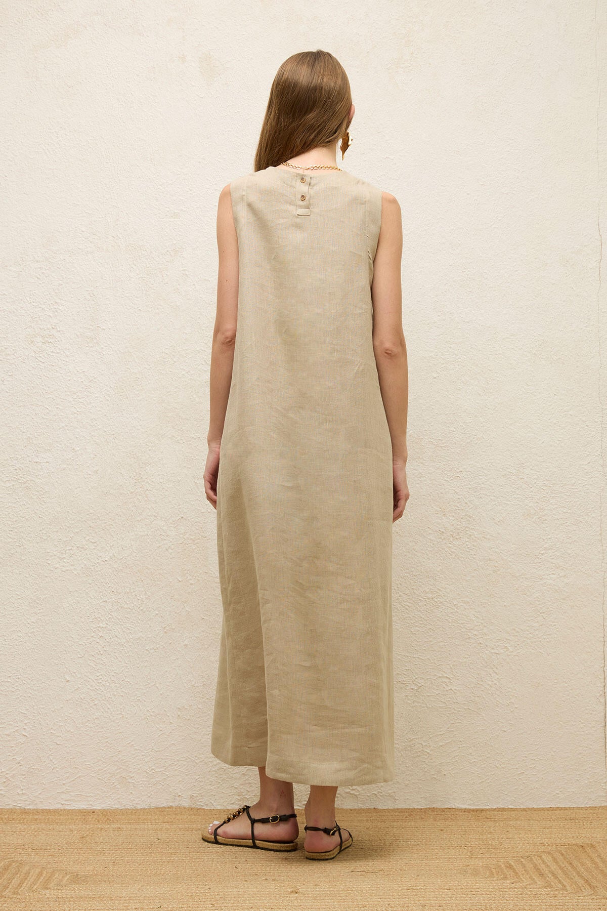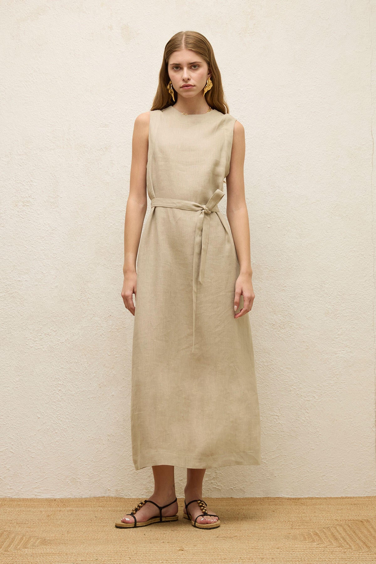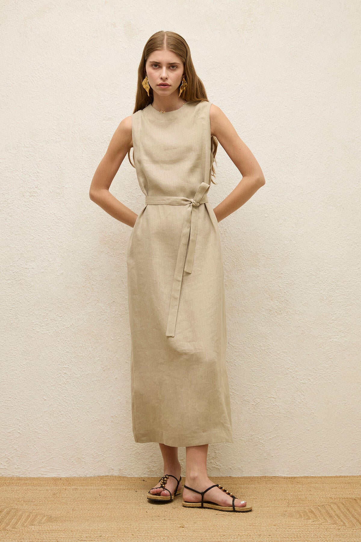 This full-length dress features stitch detailing, a round neckline, sleeveless design, back keyhole closure, and a belt.
