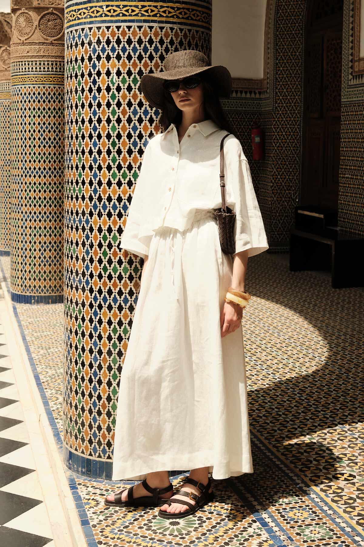 These full-length pants feature an elastic waistband with adjustable drawstrings, side pockets, and a wide flared cut. Made from 100% linen fabric.