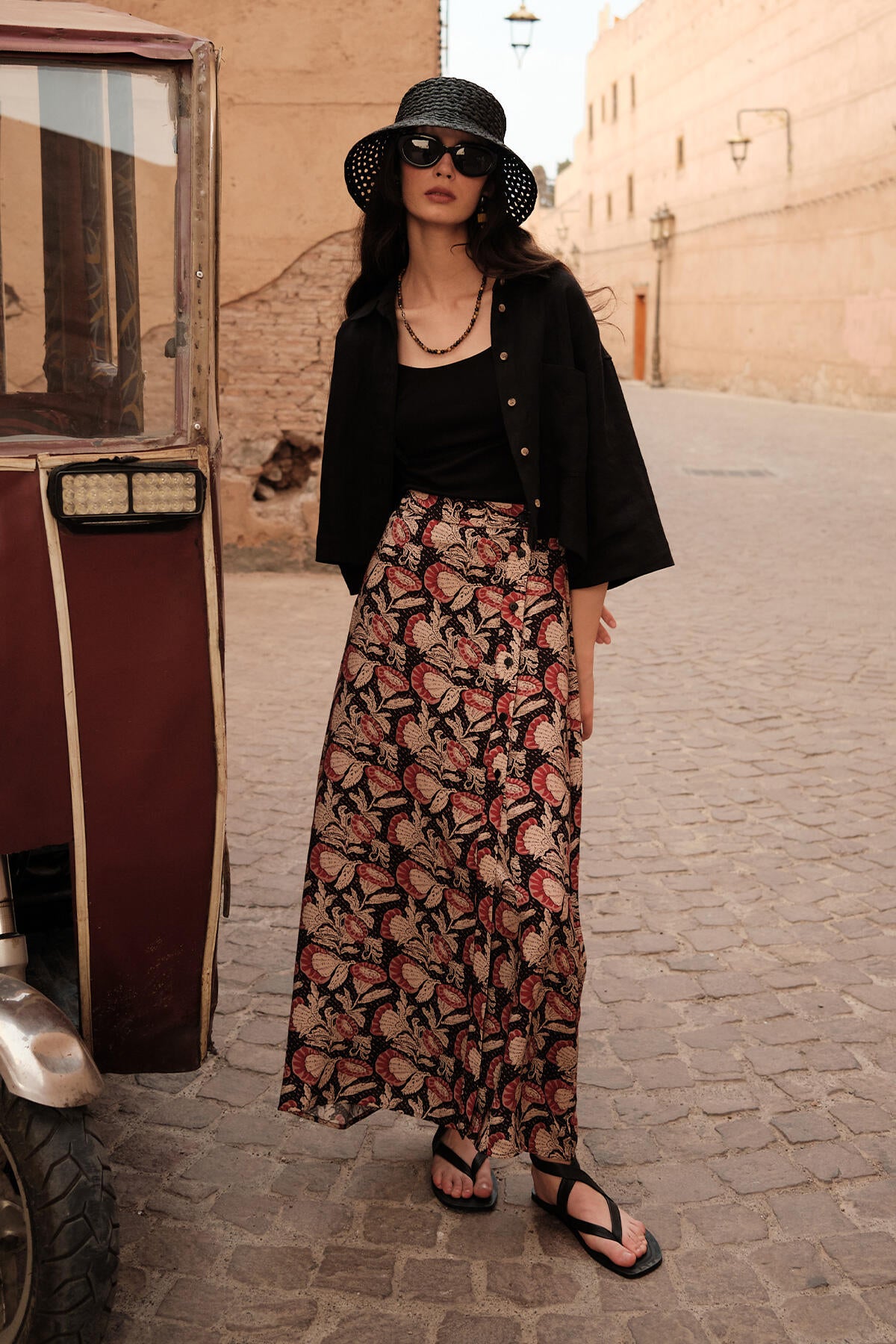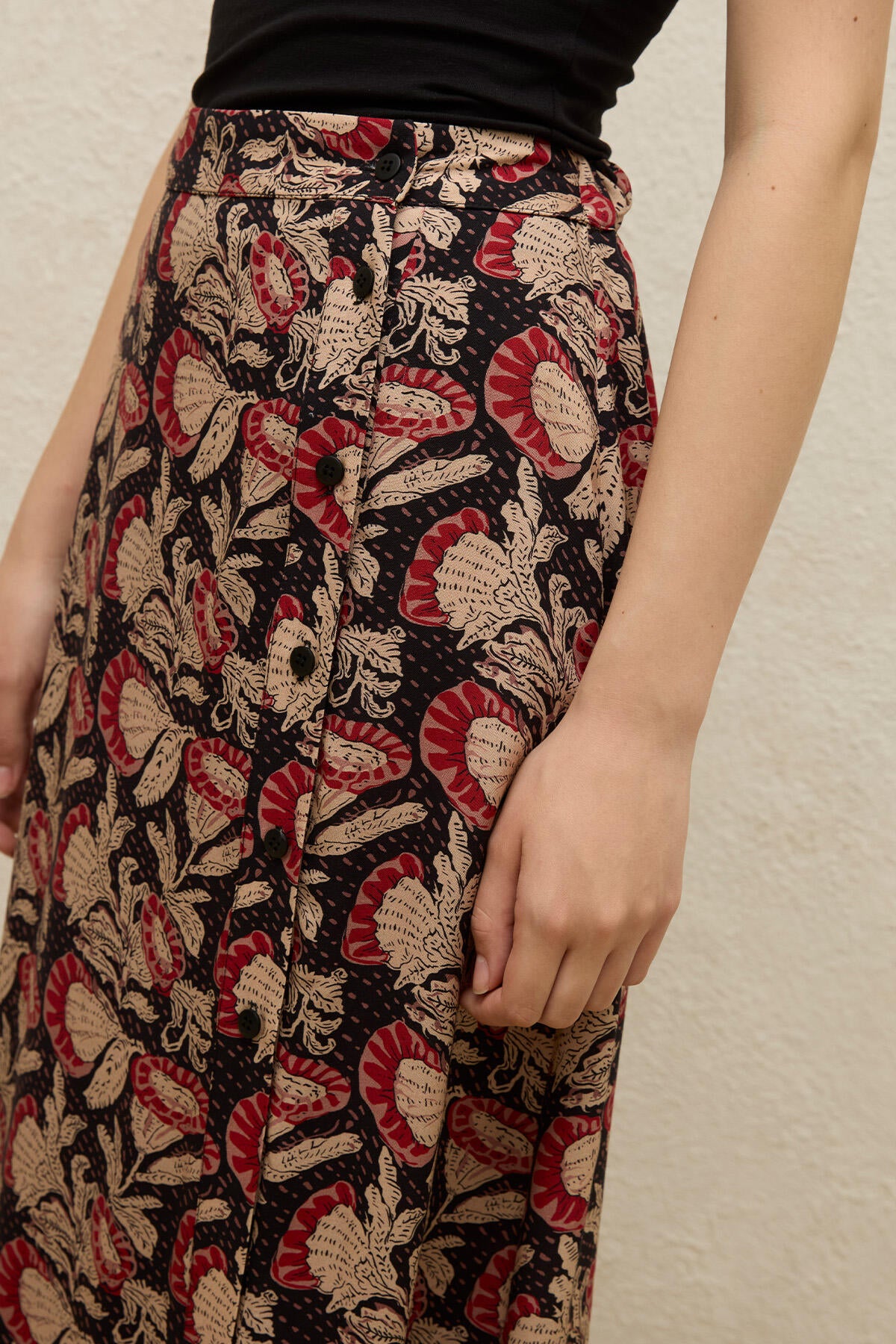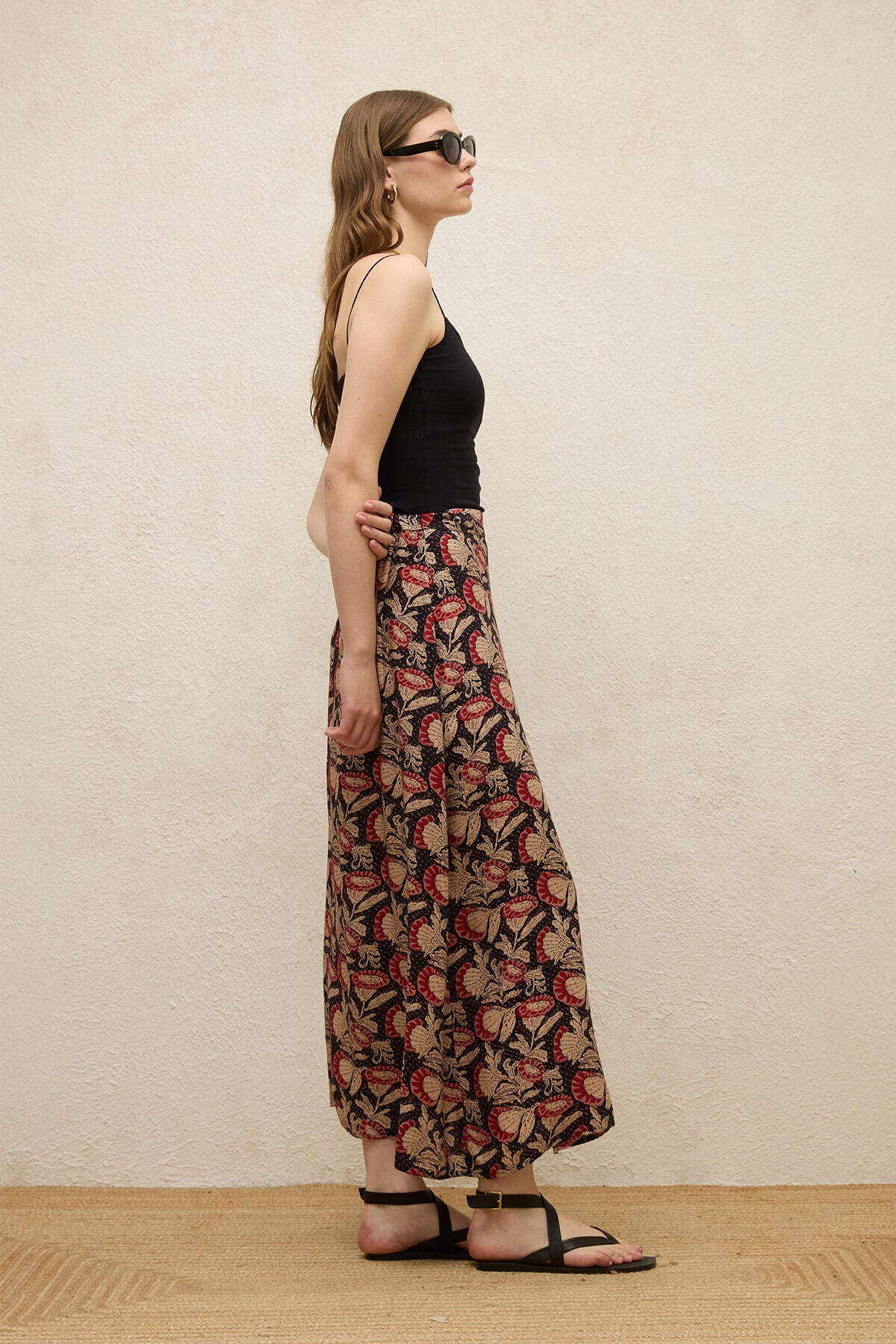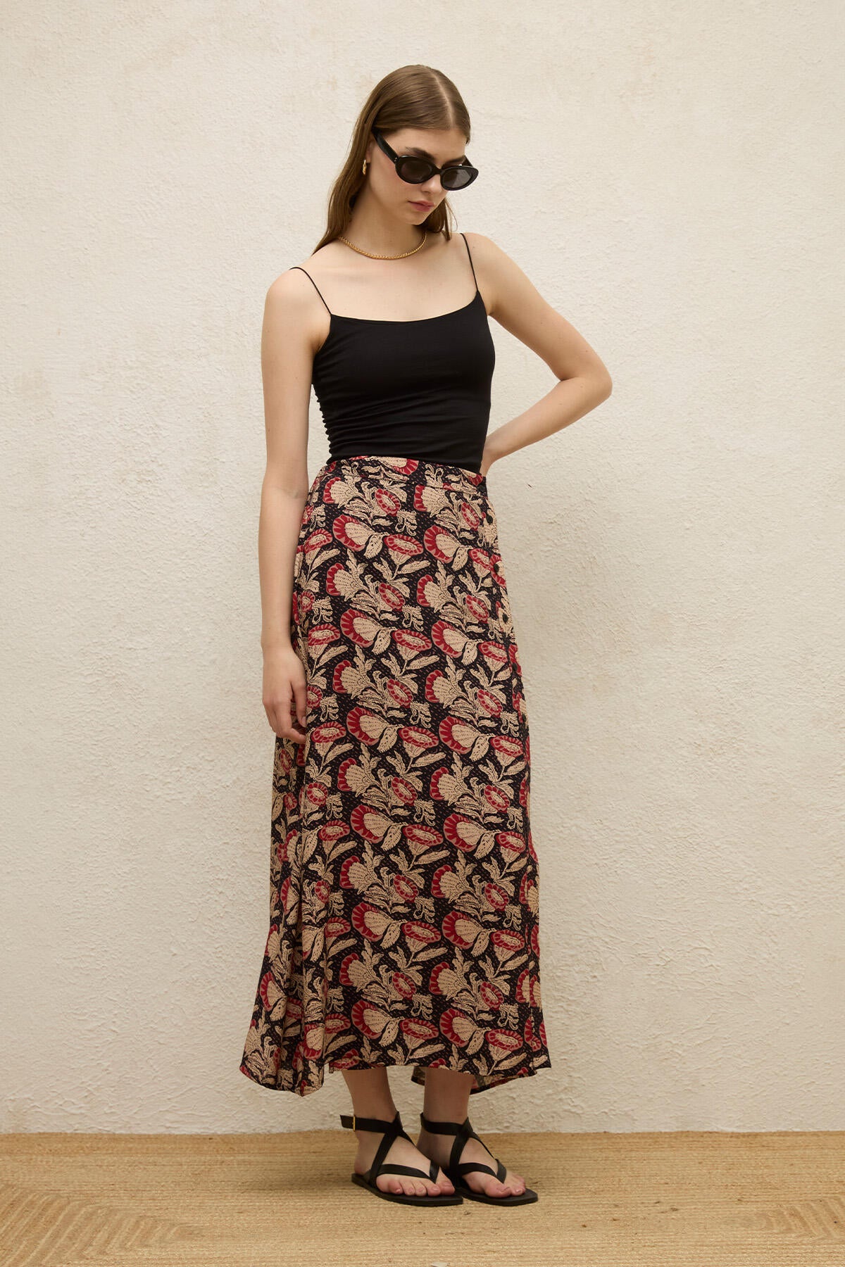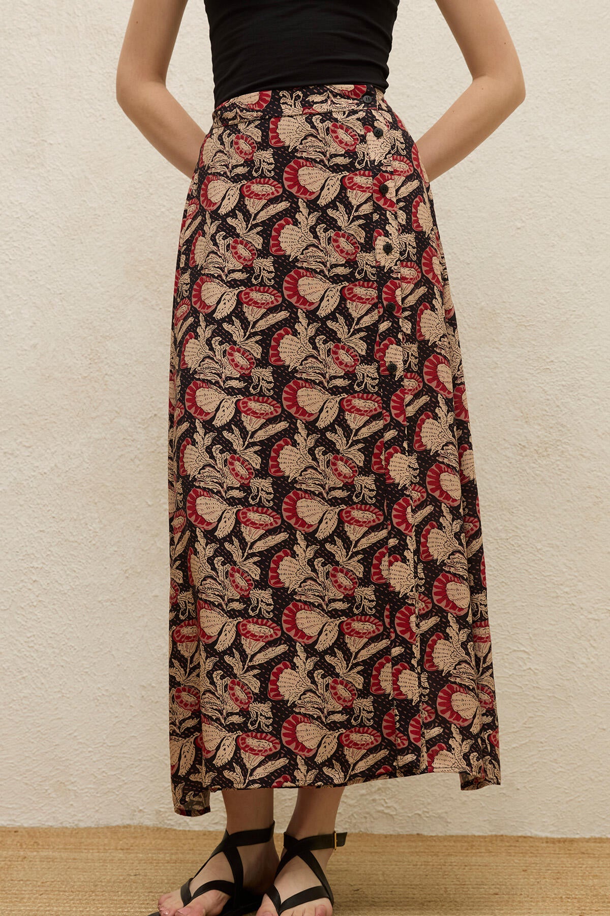 Wrap closure, elasticized back waistband, side concealed zipper, unlined, made from patterned viscose fabric.