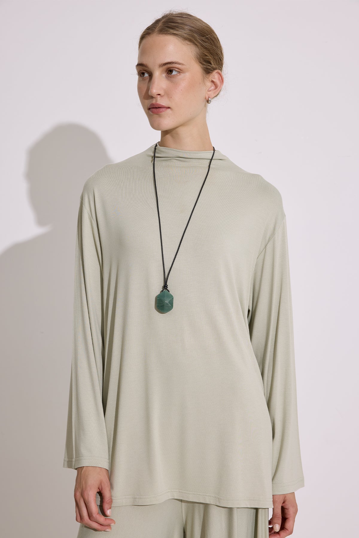 Regular fit, draped high-neck blouse with long sleeves and tunic length.