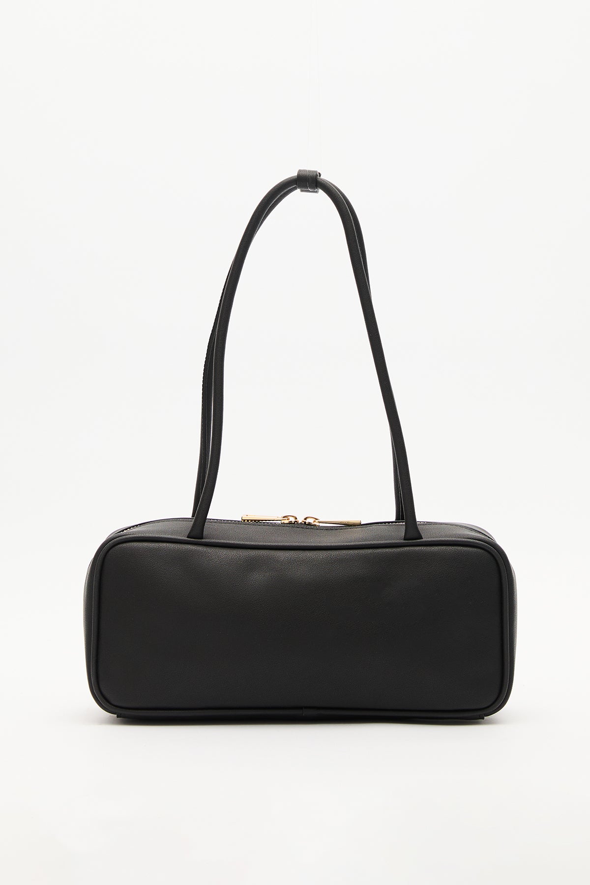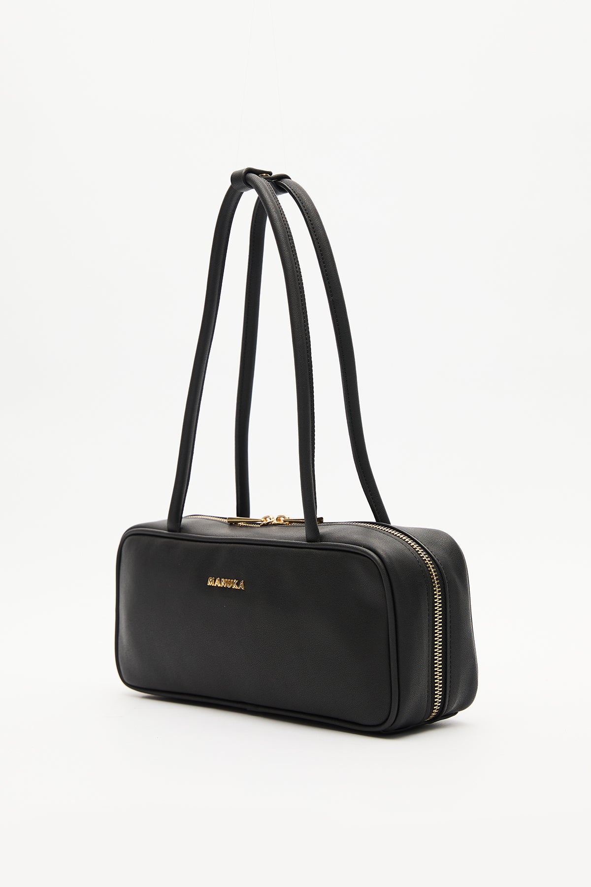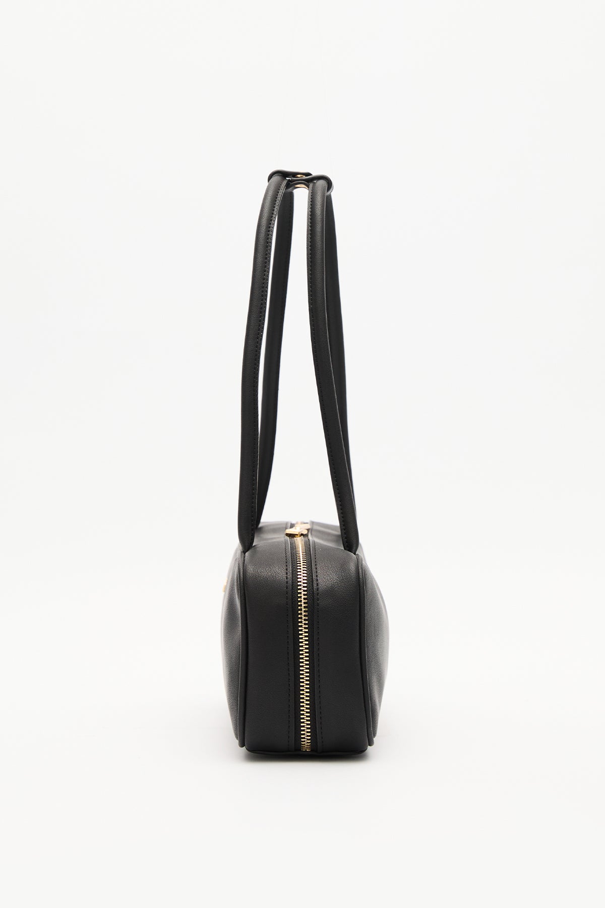 Designed with double zip closures and a sleek, structured silhouette. Features a lined interior with an inner pocket for essentials, and a snap-fastened strap with subtle logo detailing. Accented with gold-tone zippers and snap buttons.