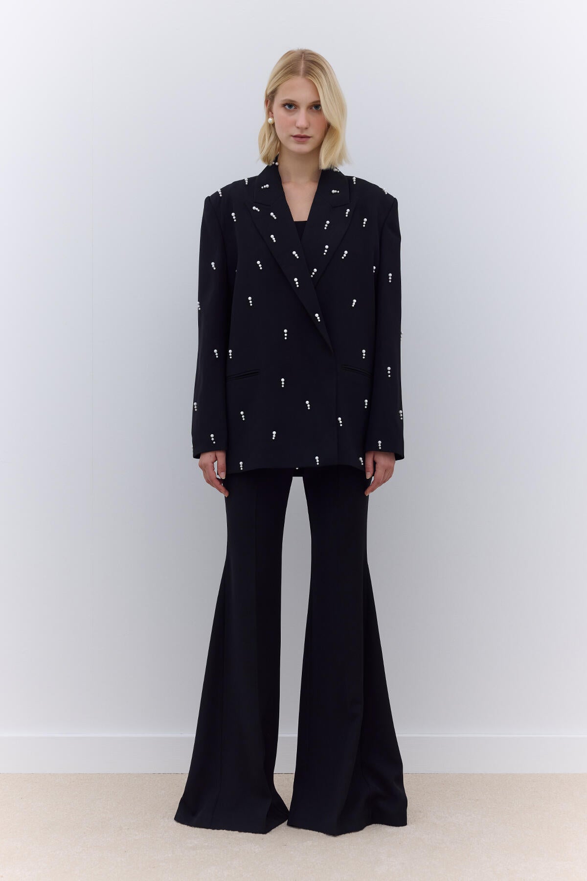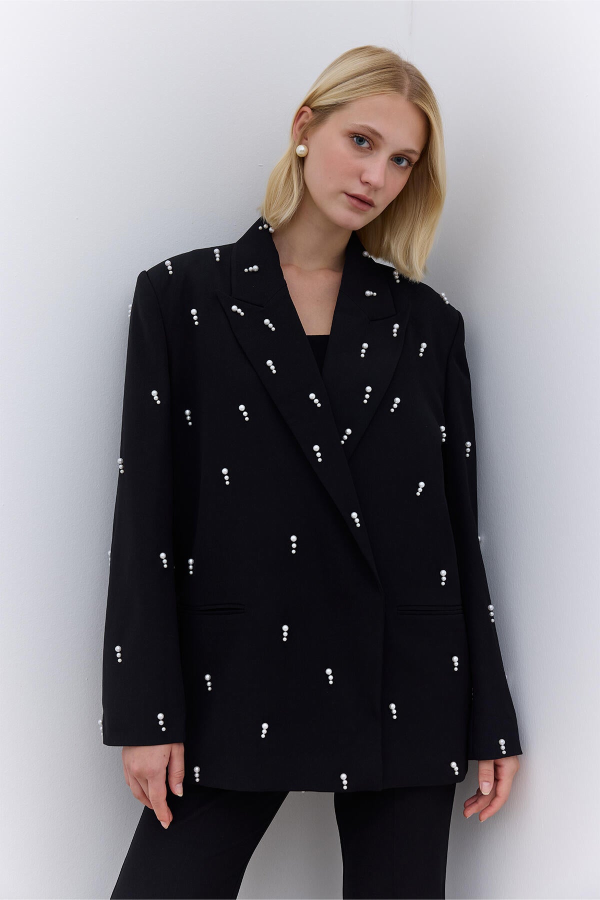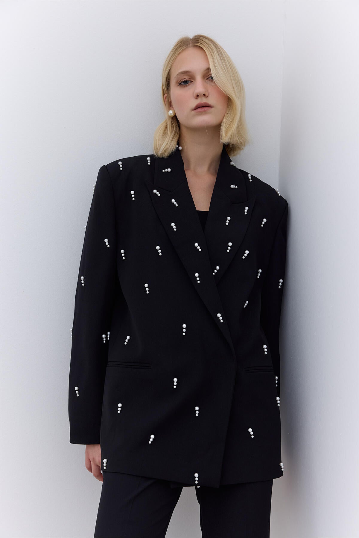 An oversized blazer featuring pearl details, concealed buttons, a double-breasted closure, full lining, padded shoulders, and welt pockets.