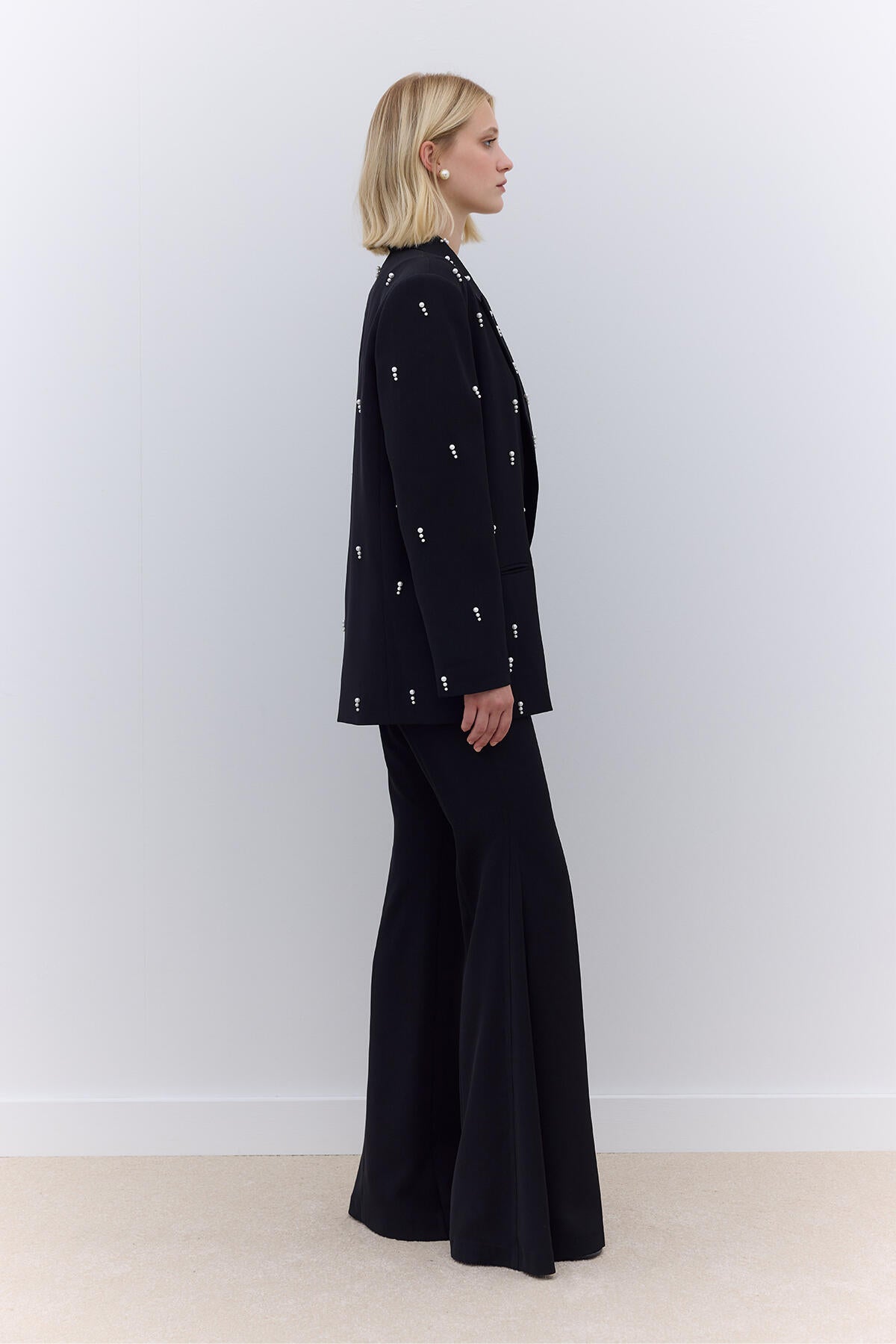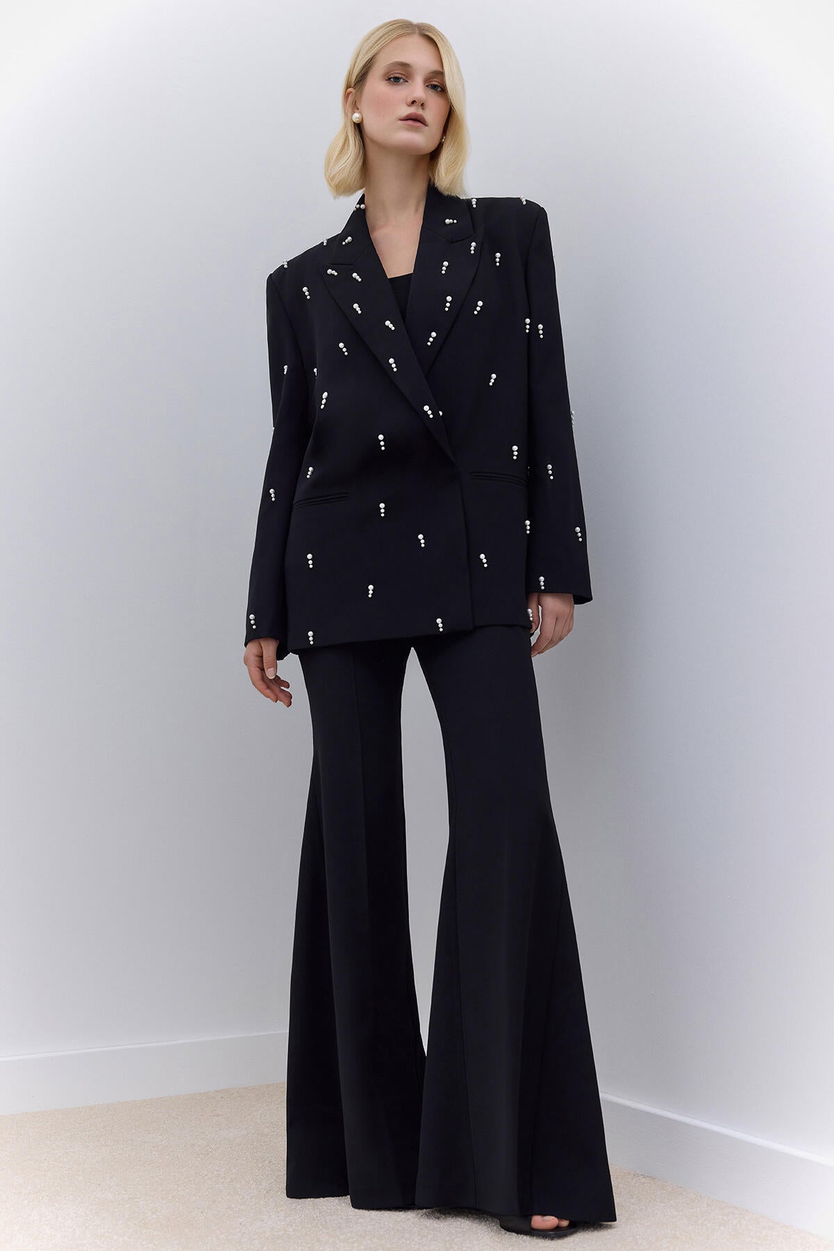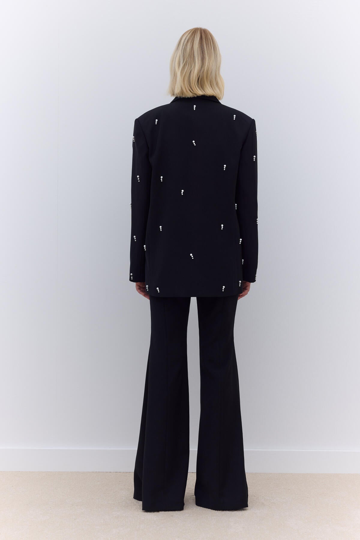 An oversized blazer featuring pearl details, concealed buttons, a double-breasted closure, full lining, padded shoulders, and welt pockets.
