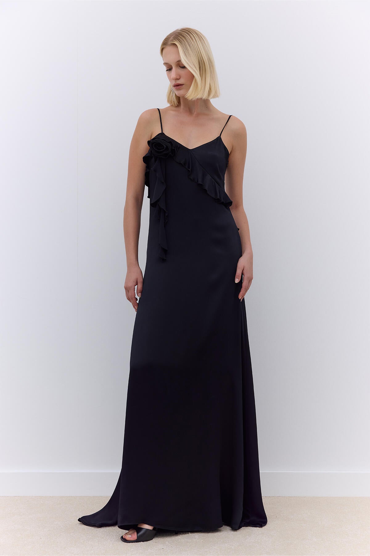 A delicate dress made from soft-textured satin fabric, featuring straps and floral details crafted from the same fabric. It has a concealed zipper closure and is fully lined.