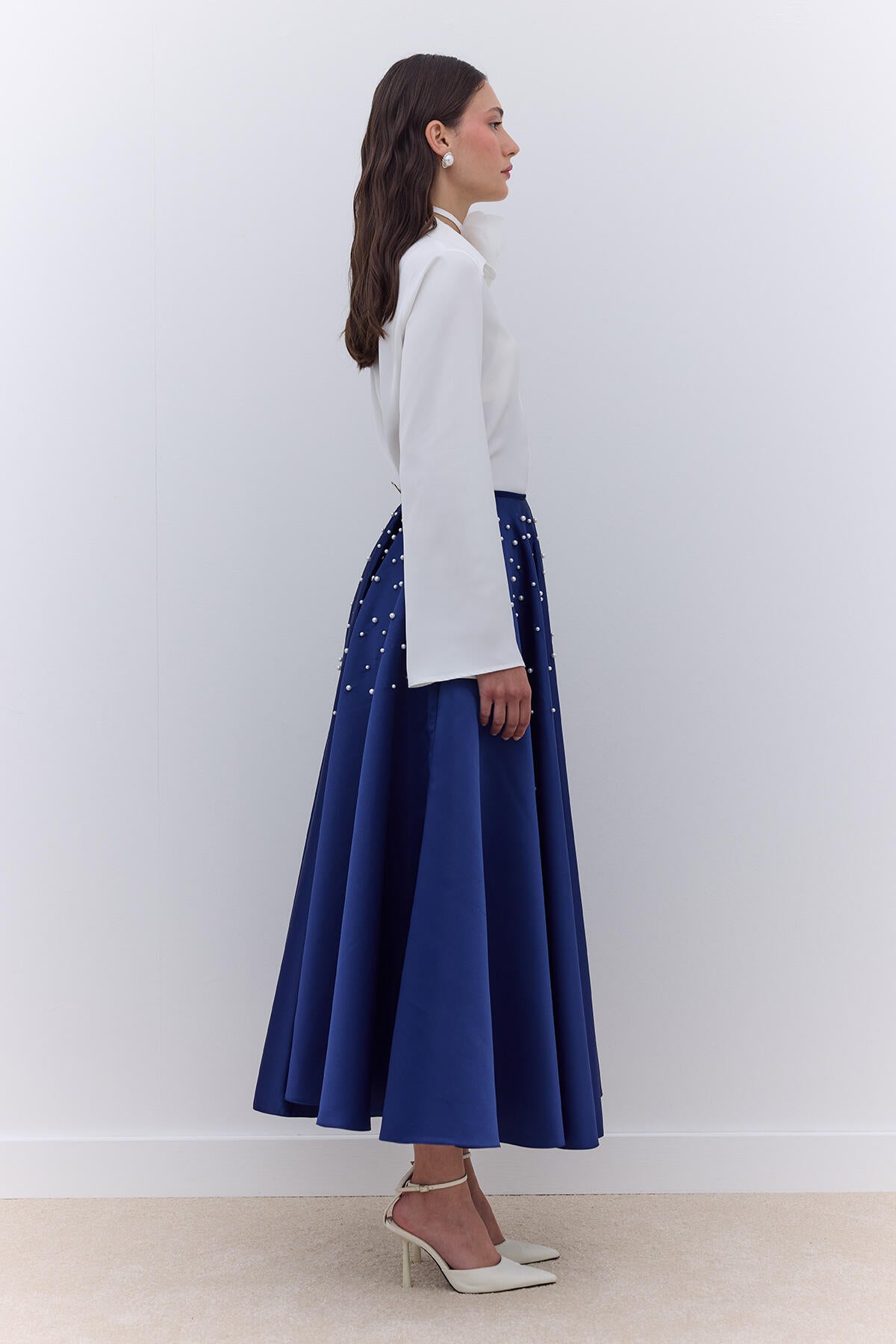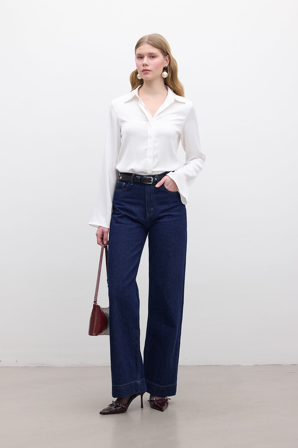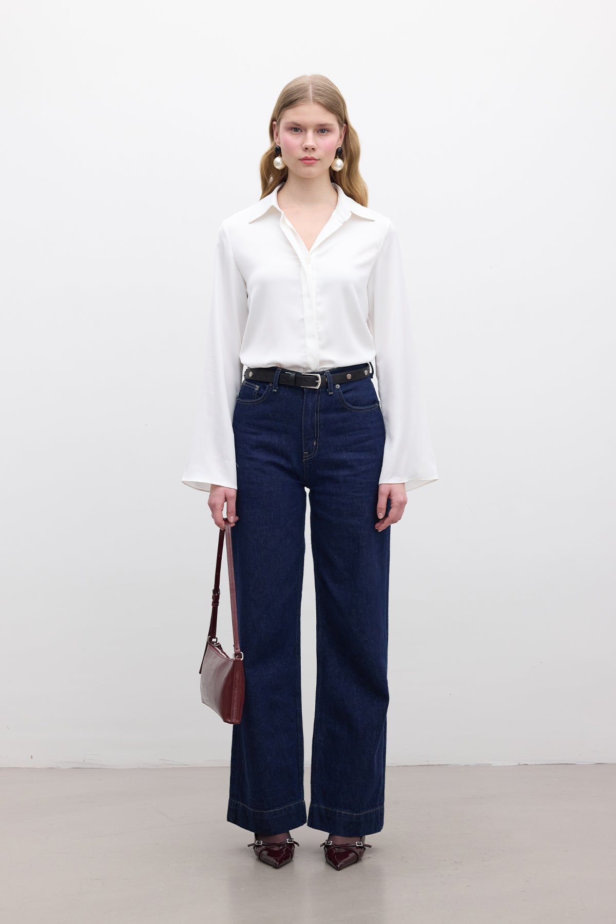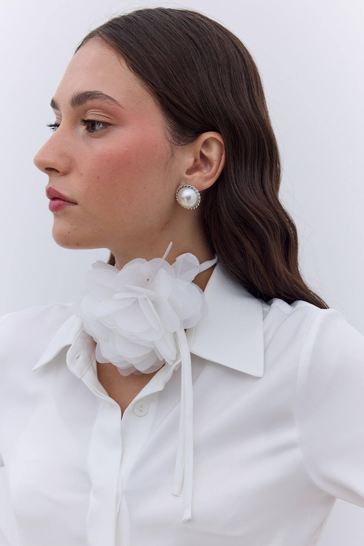 This shirt features a satin fabric with a fitted cut and slightly flared sleeves for a stylish touch. The shirt collar is adorned with a floral accessory, adding a delicate detail to the elegant design.