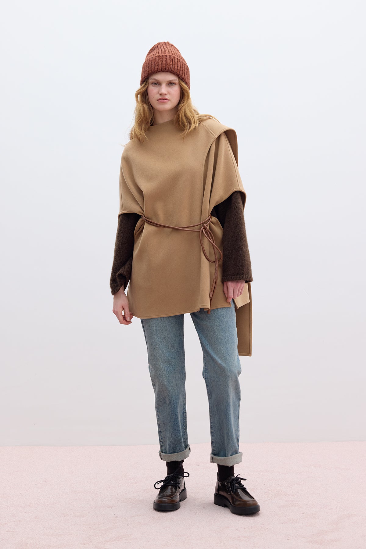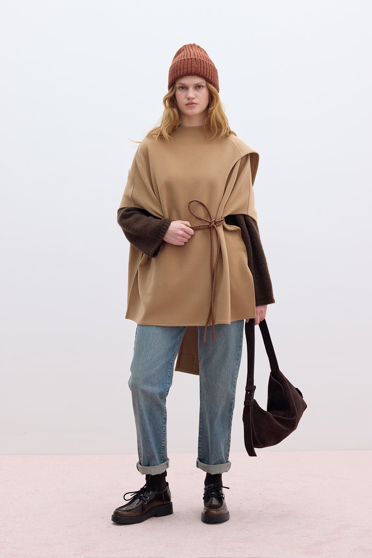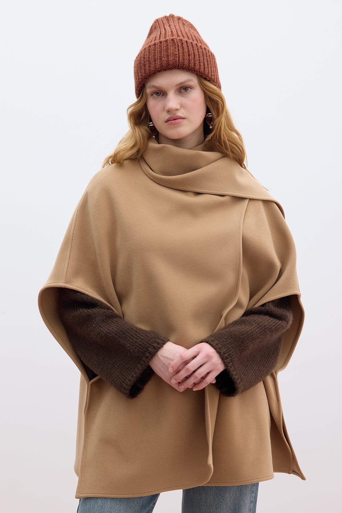 Features a unique built-in scarf, elevating the classic poncho silhouette with a touch of elegance and warmth. Adorned with a leather label detail for a hint of luxury, the tunic length ensures versatile styling options, making it a perfect layering piece over any outfit. Crafted in a standard fit, it offers a flattering drape for all body types. Made from seasonal cachet fabric, this unlined poncho coat is ideal for transitioning weather, providing just the right amount of warmth without the bulk.
