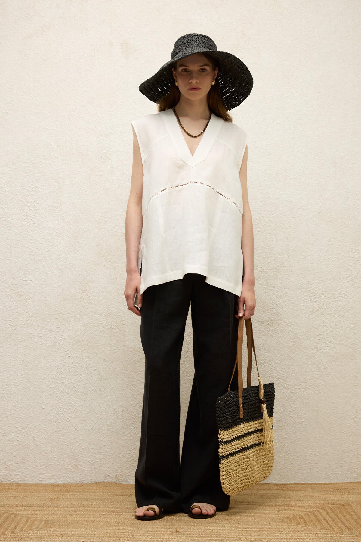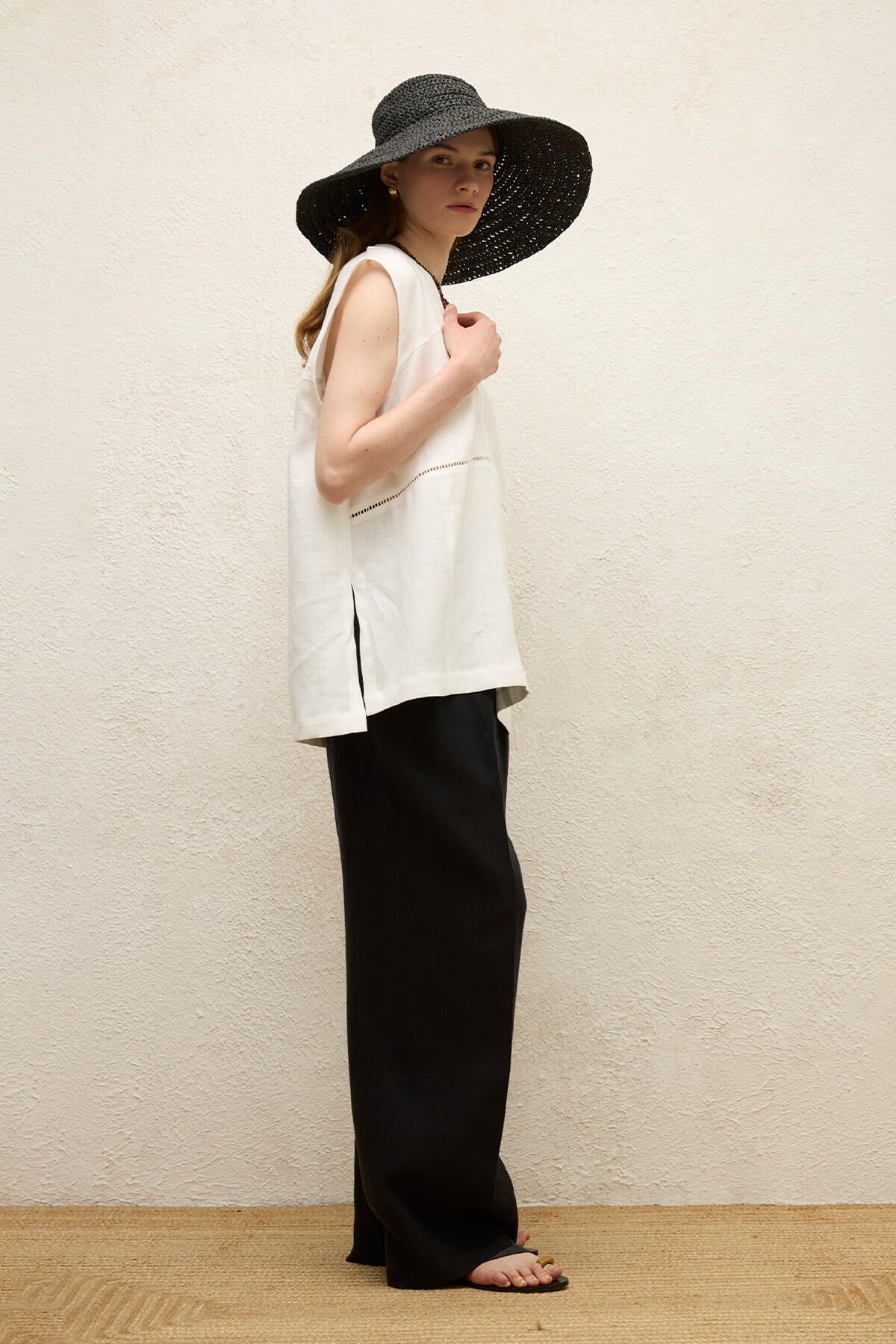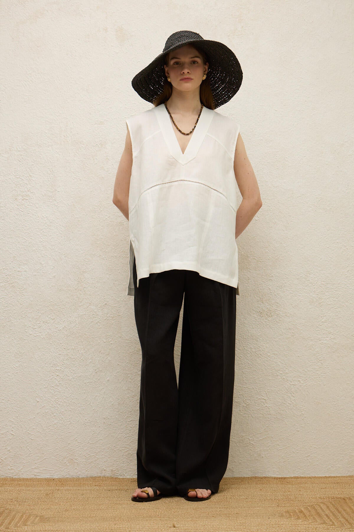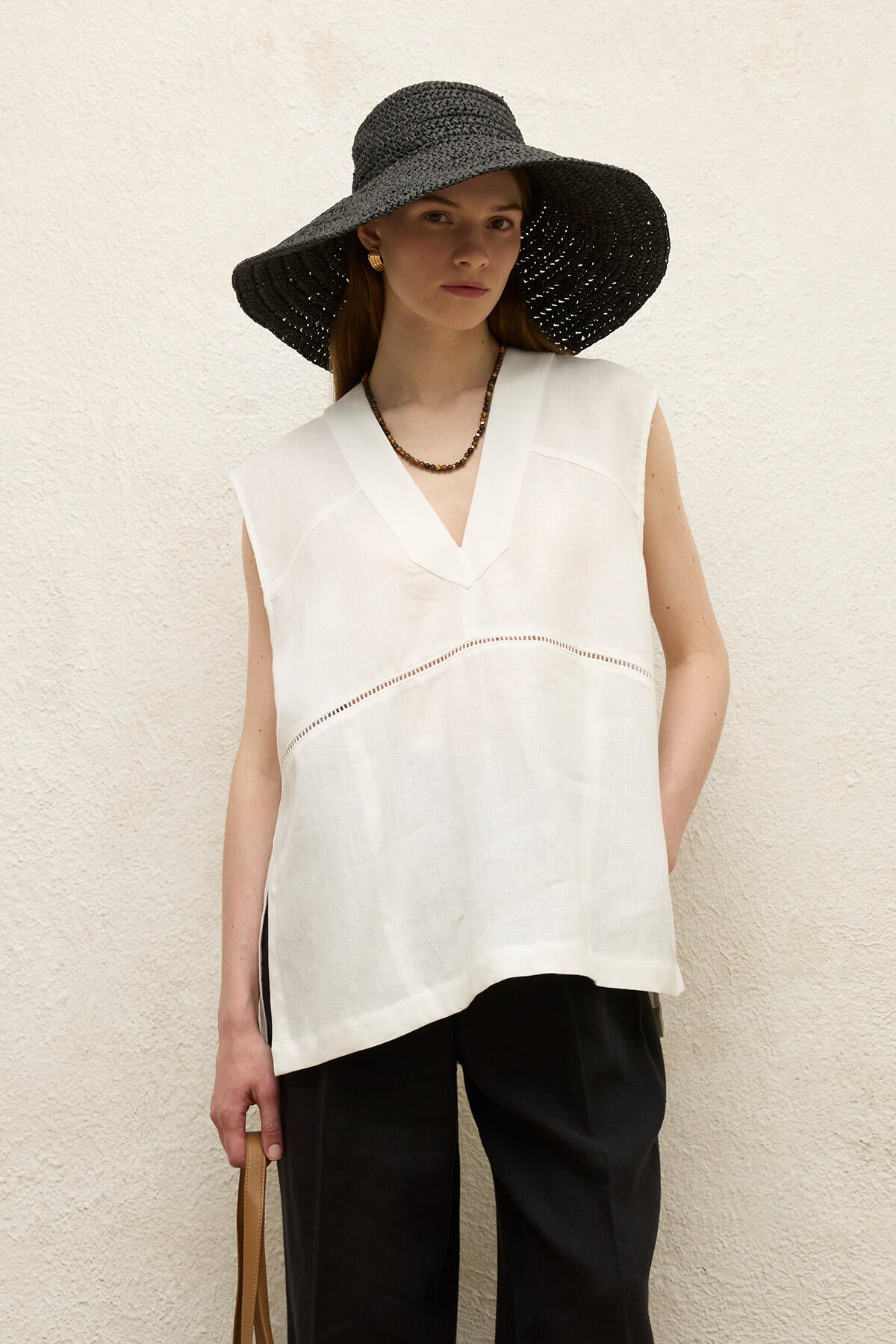 This top features a V-neckline, lace insert detail, and side slits. Made from 100% linen fabric.