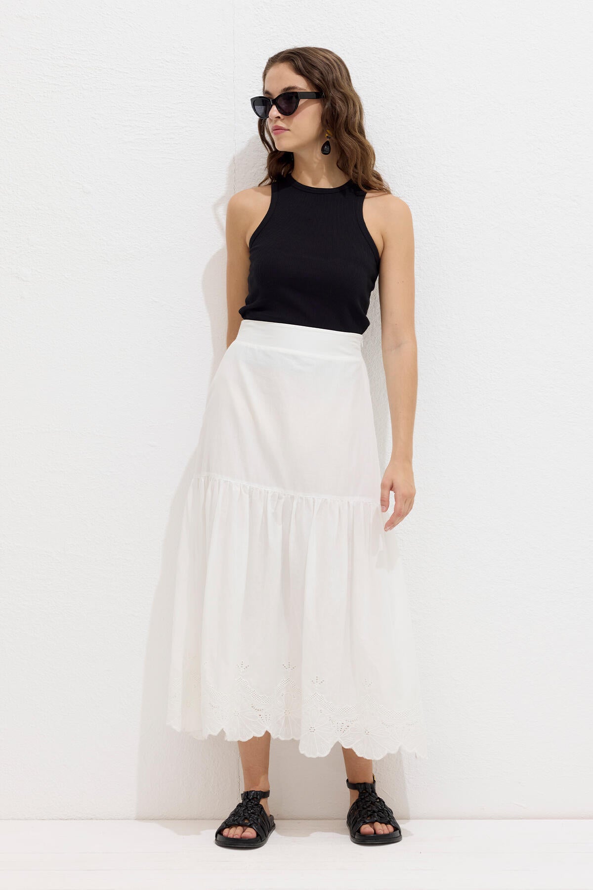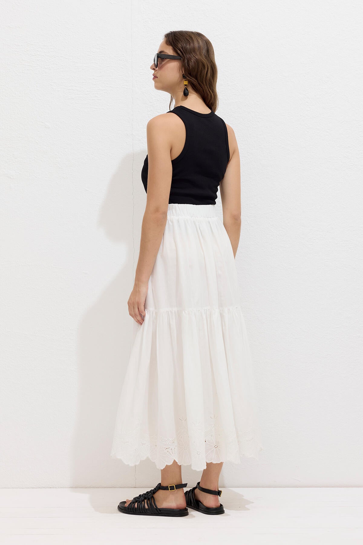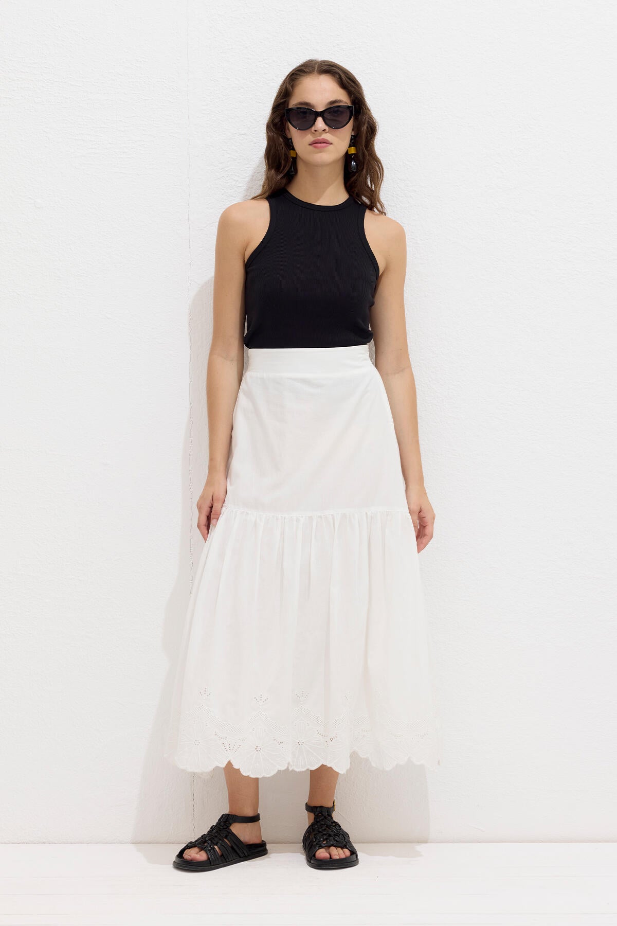 A high-waisted skirt featuring an elasticized back, concealed side zipper closure, pleated design, and full lining. The hem is detailed with delicate embroidery.