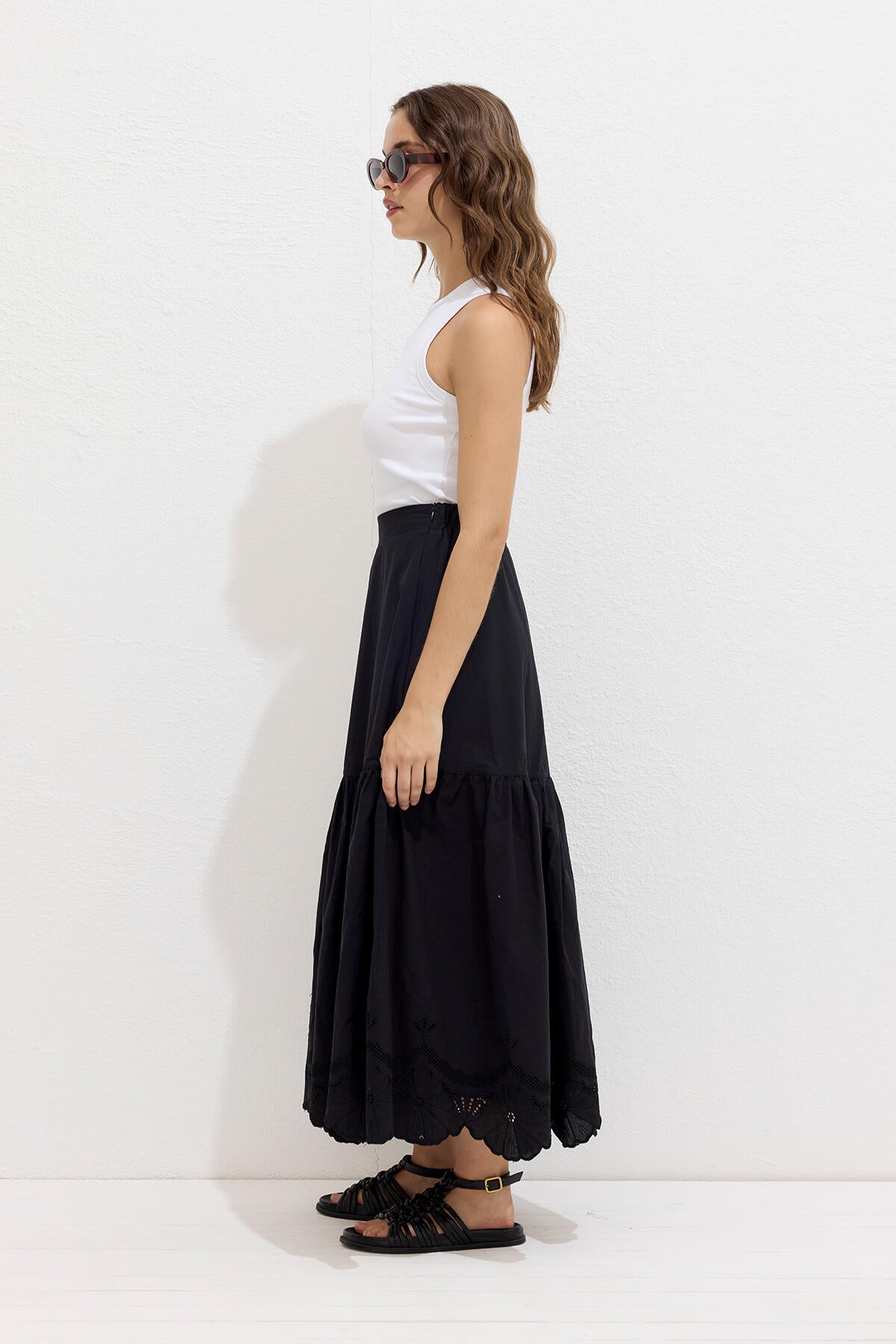 A high-waisted skirt featuring an elasticized back, concealed side zipper closure, pleated design, and full lining. The hem is detailed with delicate embroidery.
