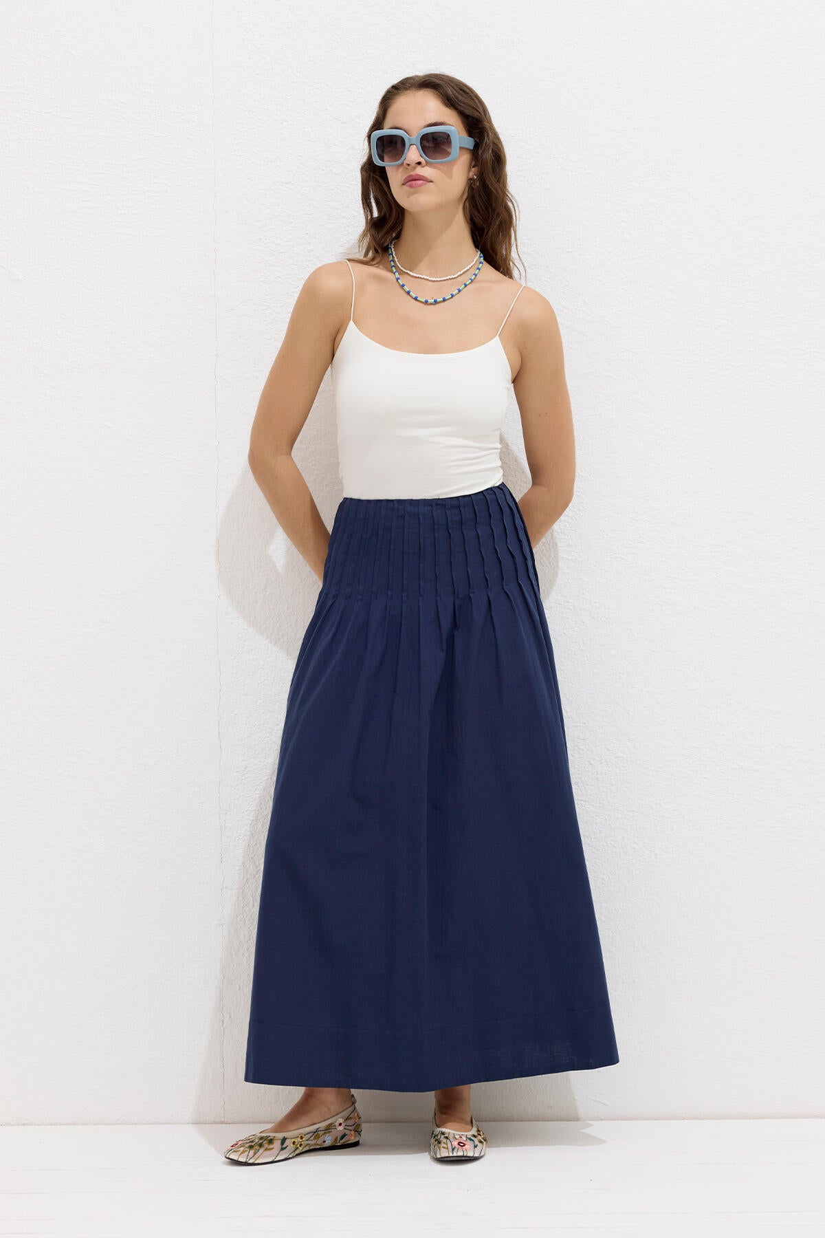 This high-waisted skirt features pintuck stitching, a wide flared silhouette, lining, and a zipper closure. Made from cotton voile fabric.