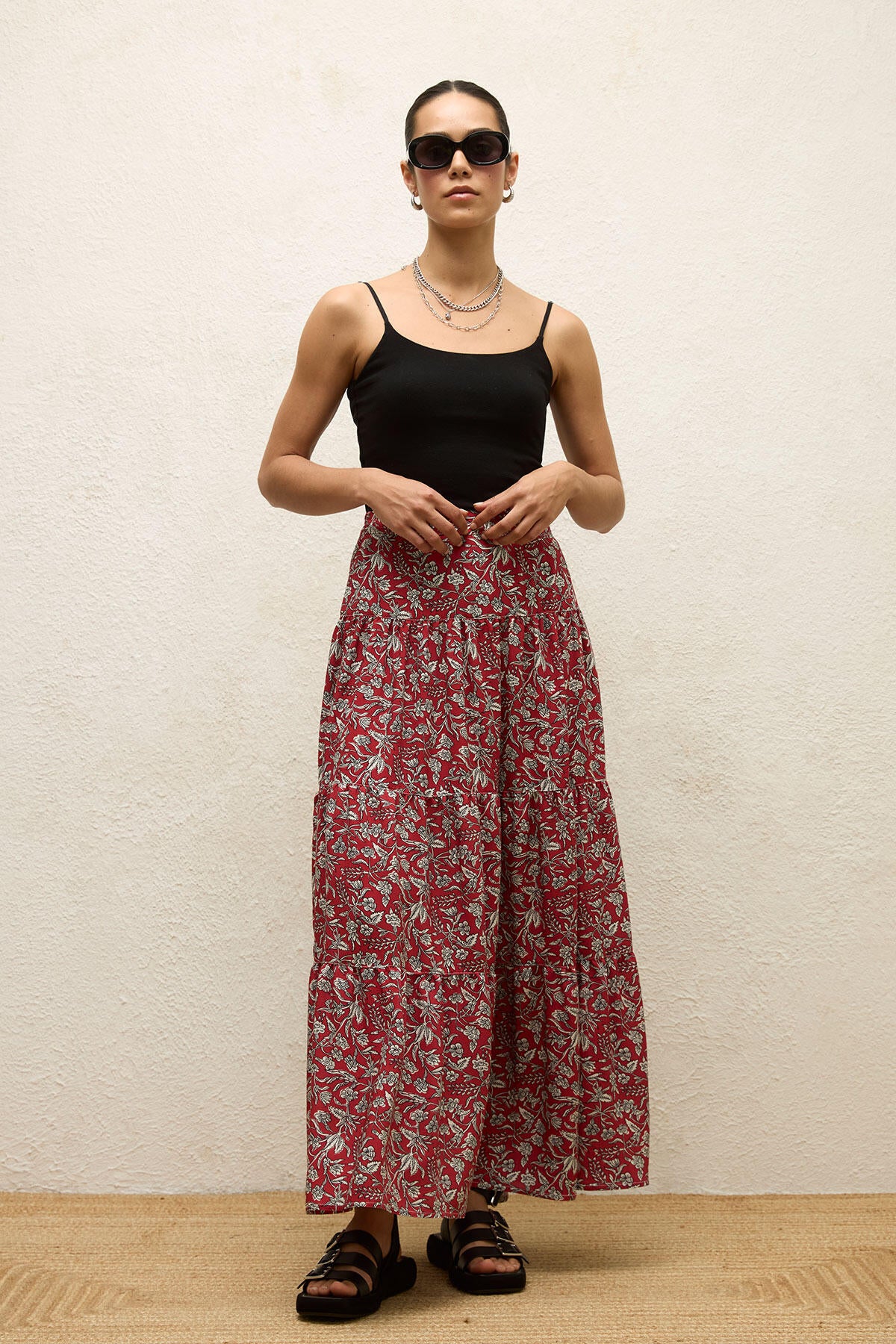 Side zipper closure, with yoke and gathering details, full length, made from patterned viscose fabric.