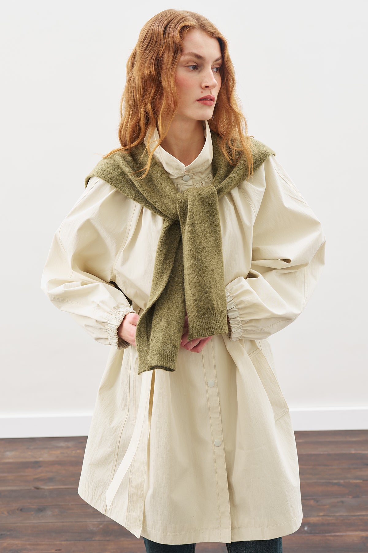 Gömlek yakalı, reglan kol, büzgü detaylı, ara boy, çıt çıt kapamalı, normal kalıp, dokuma kumaş.