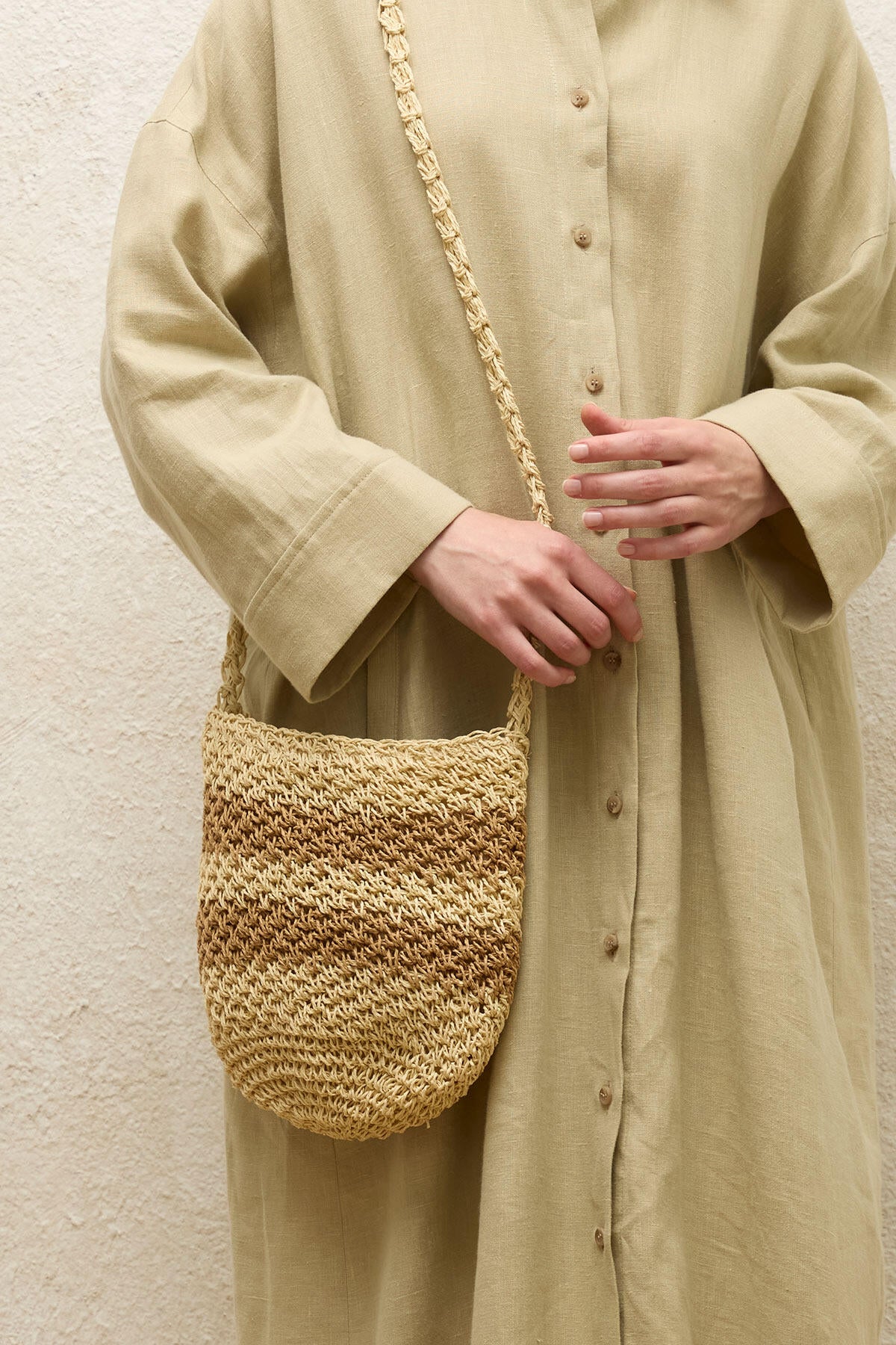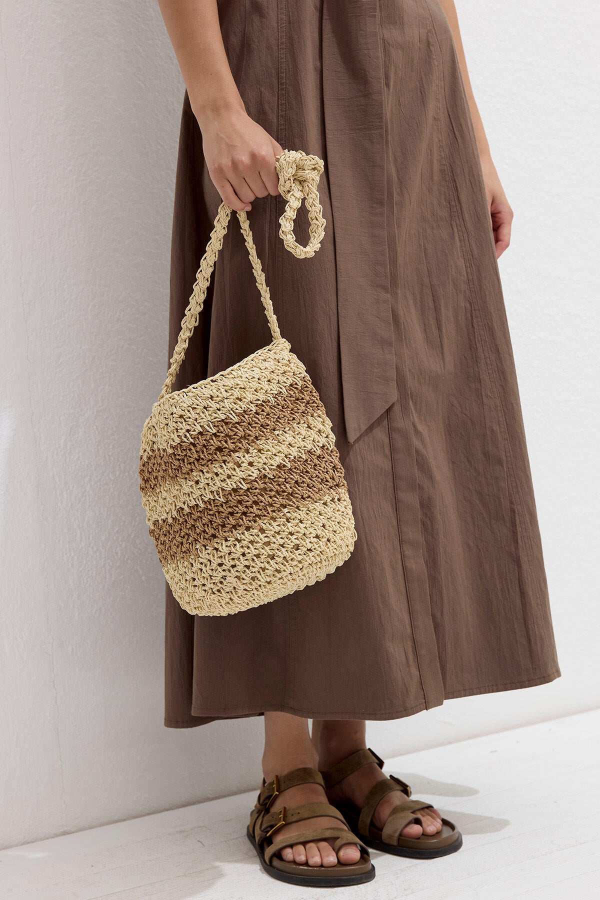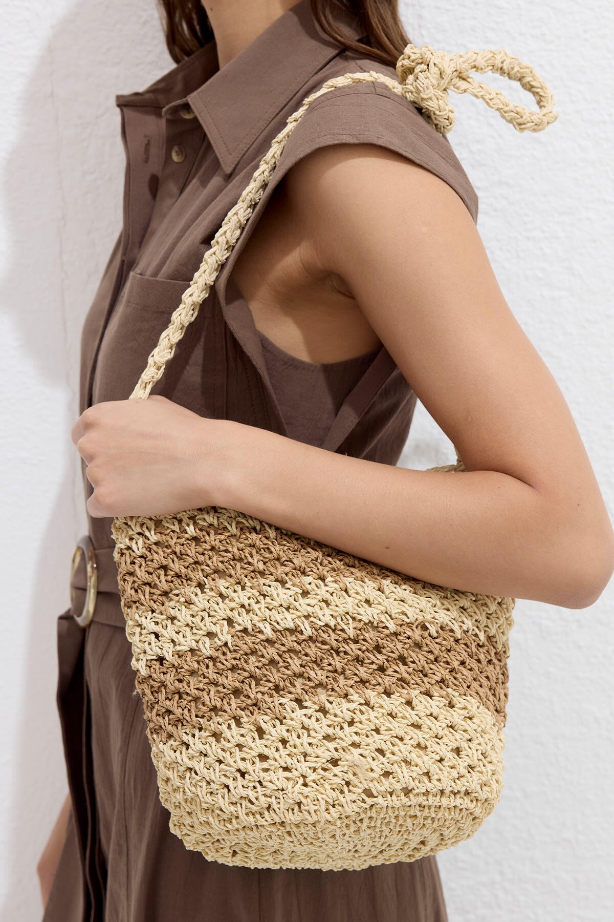 Crossbody straps, adjustable drawstring bag lining, self-patterned weave, tassel details.