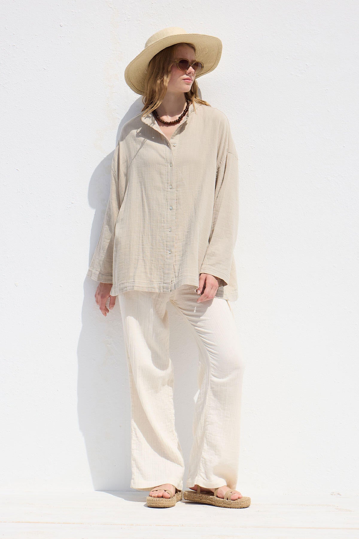 This muslin shirt features button closure, dropped shoulders, long wide sleeves, and a regular fit.