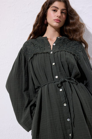 Muslin Gathered Waist Dress Dark Green