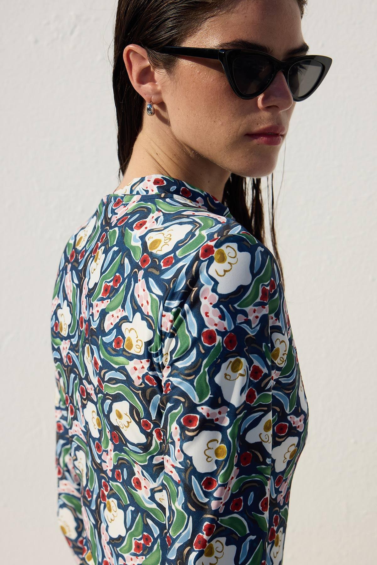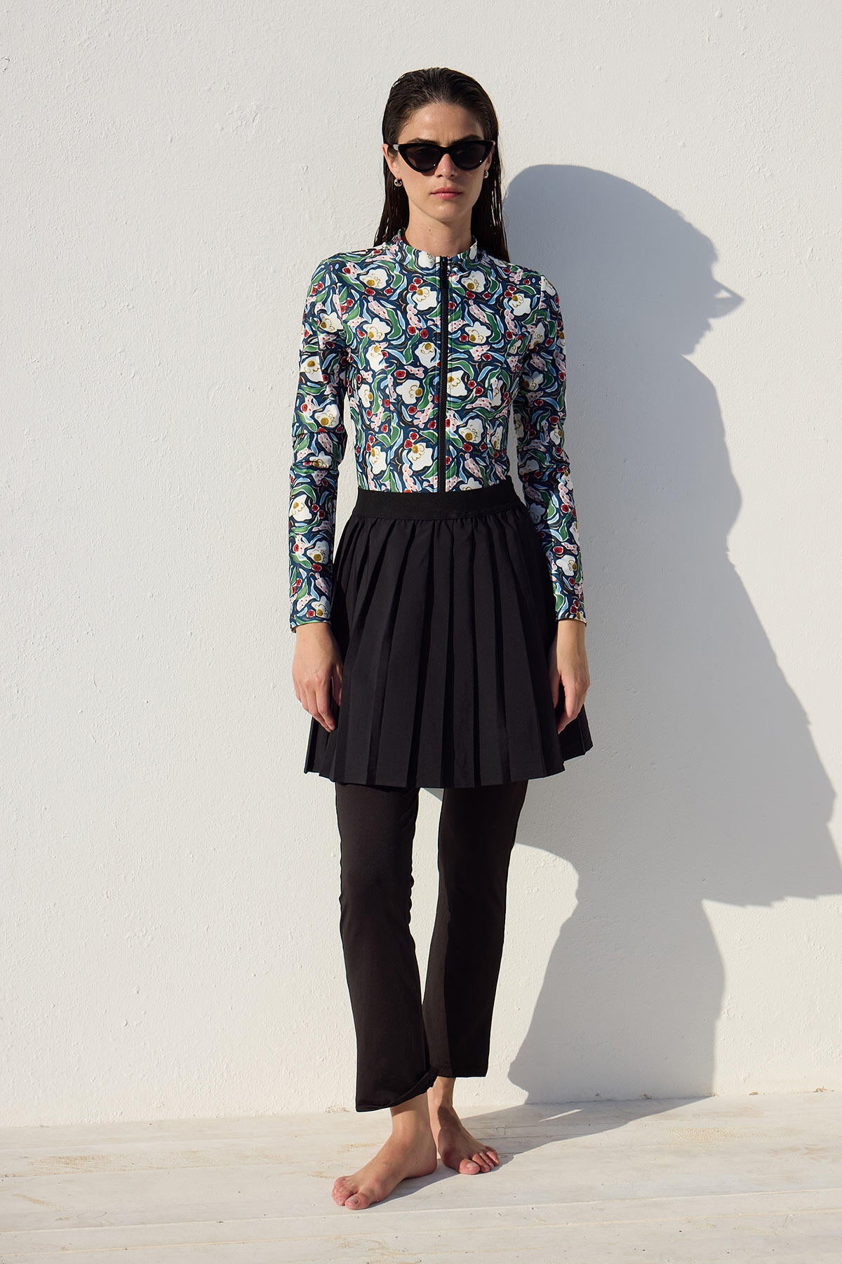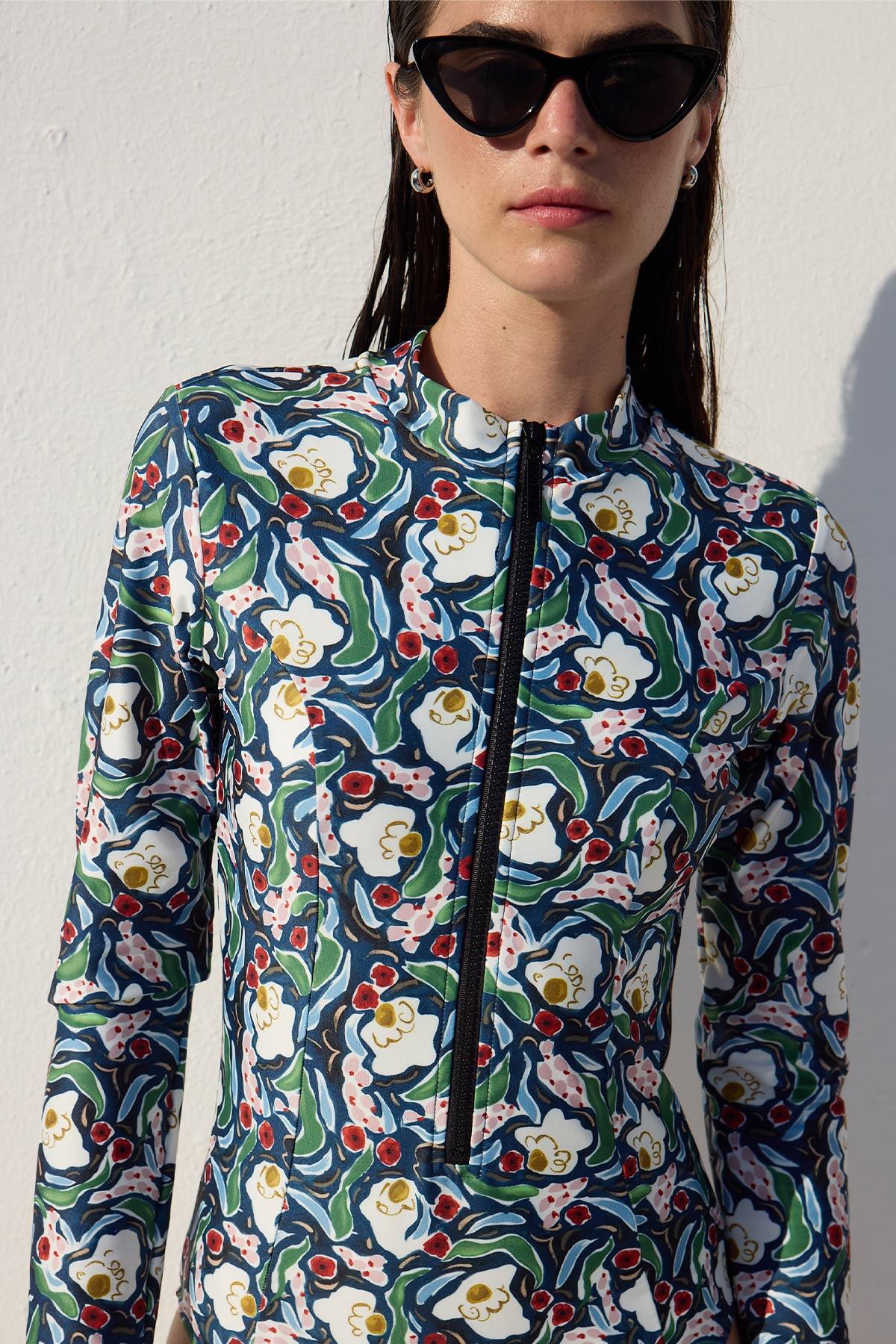 Crafted from flexible swimwear fabric with a composition of 90% polyester and 10% elastane, this swimsuit offers both comfort and stretch for a flattering fit. The high neckline and front zipper closure ensure a secure and stylish look, while the padded cups provide support and shape to the bust. Designed with a vibrant pattern, it adds a pop of color to your poolside ensemble (only includes the upper part of the swimsuit).