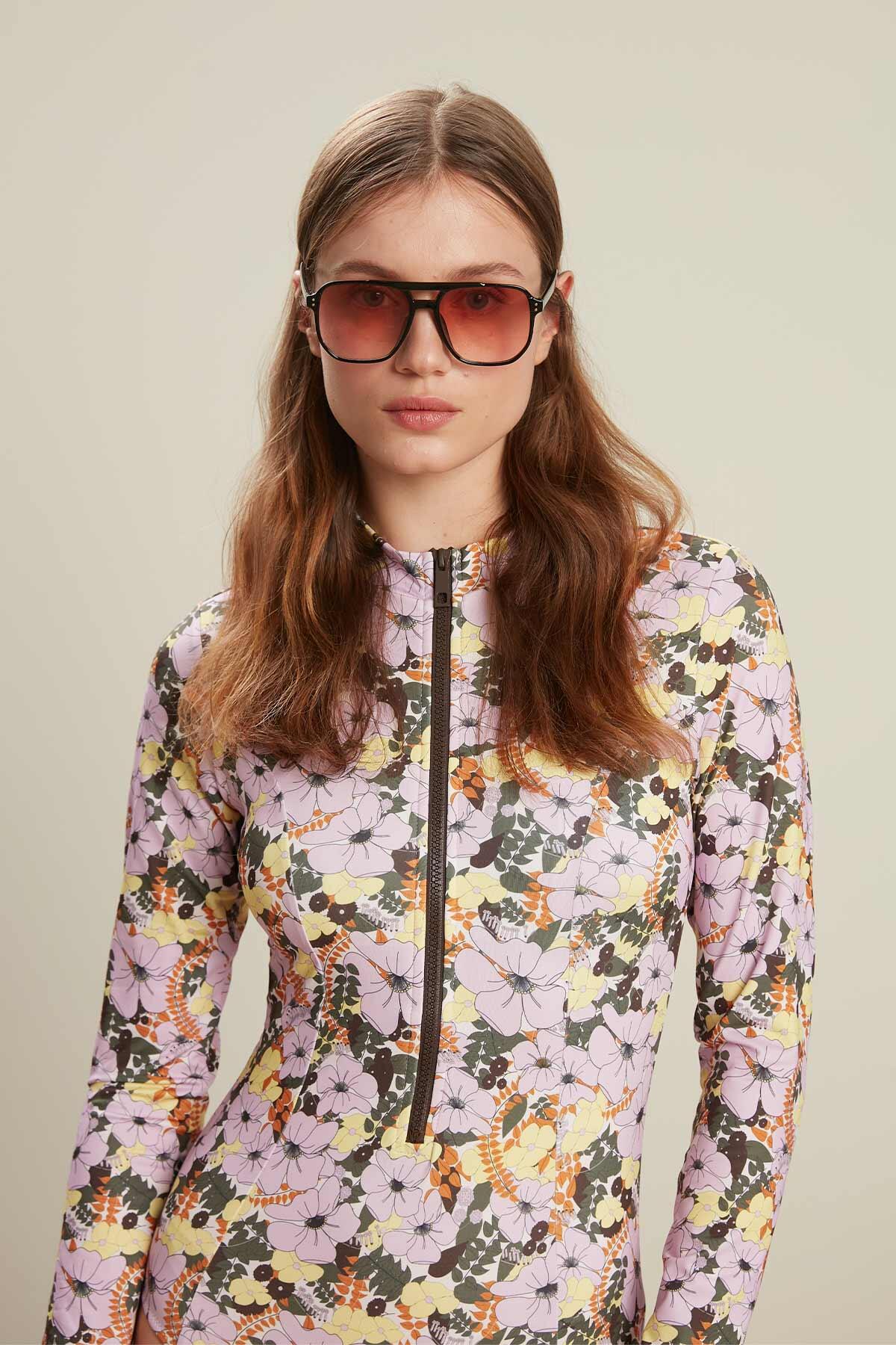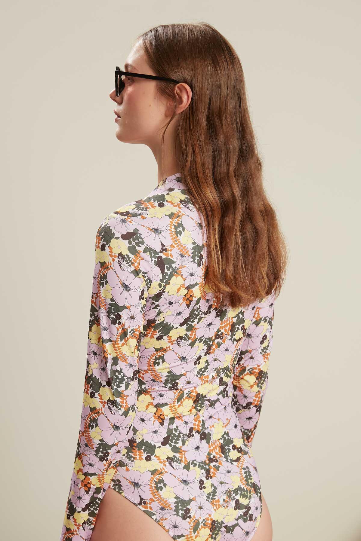 Crafted from flexible swimwear fabric with a composition of 90% polyester and 10% elastane, this swimsuit offers both comfort and stretch for a flattering fit. The high neckline and front zipper closure ensure a secure and stylish look, while the padded cups provide support and shape to the bust. Designed with a vibrant pattern, it adds a pop of color to your poolside ensemble (only includes the upper part of the swimsuit).