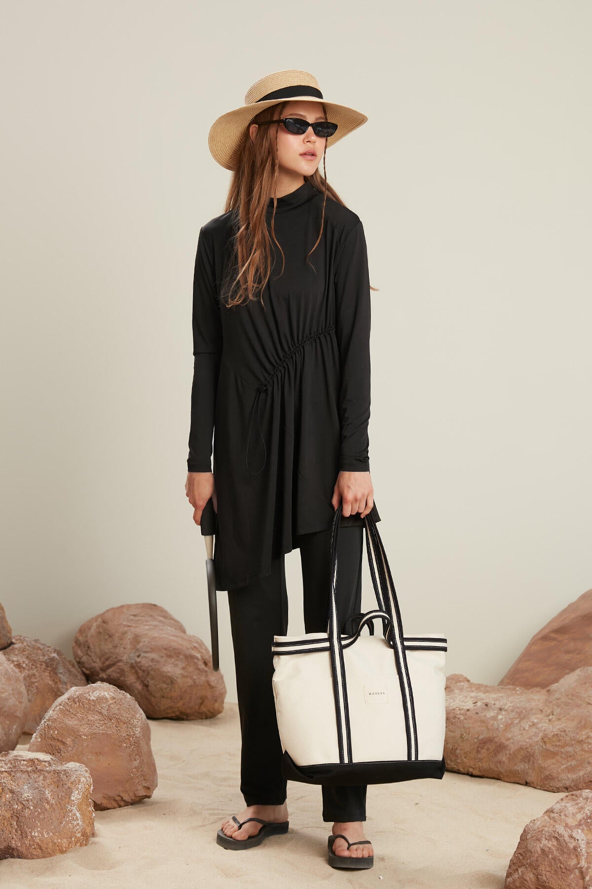Crafted from stretchy swimwear fabric, this tunic offers flexibility and ease of movement whether you're swimming or relaxing by the water. The high neckline provides additional coverage and sun protection. The elastic waistband with stoppers allows you to adjust the gathering detail to your liking, ensuring a secure and personalised fit. With its asymmetrical cut, this tunic adds a modern and chic touch to your swimwear ensemble. Its versatile design and flattering silhouette make it a perfect choice for any beach or poolside occasion.