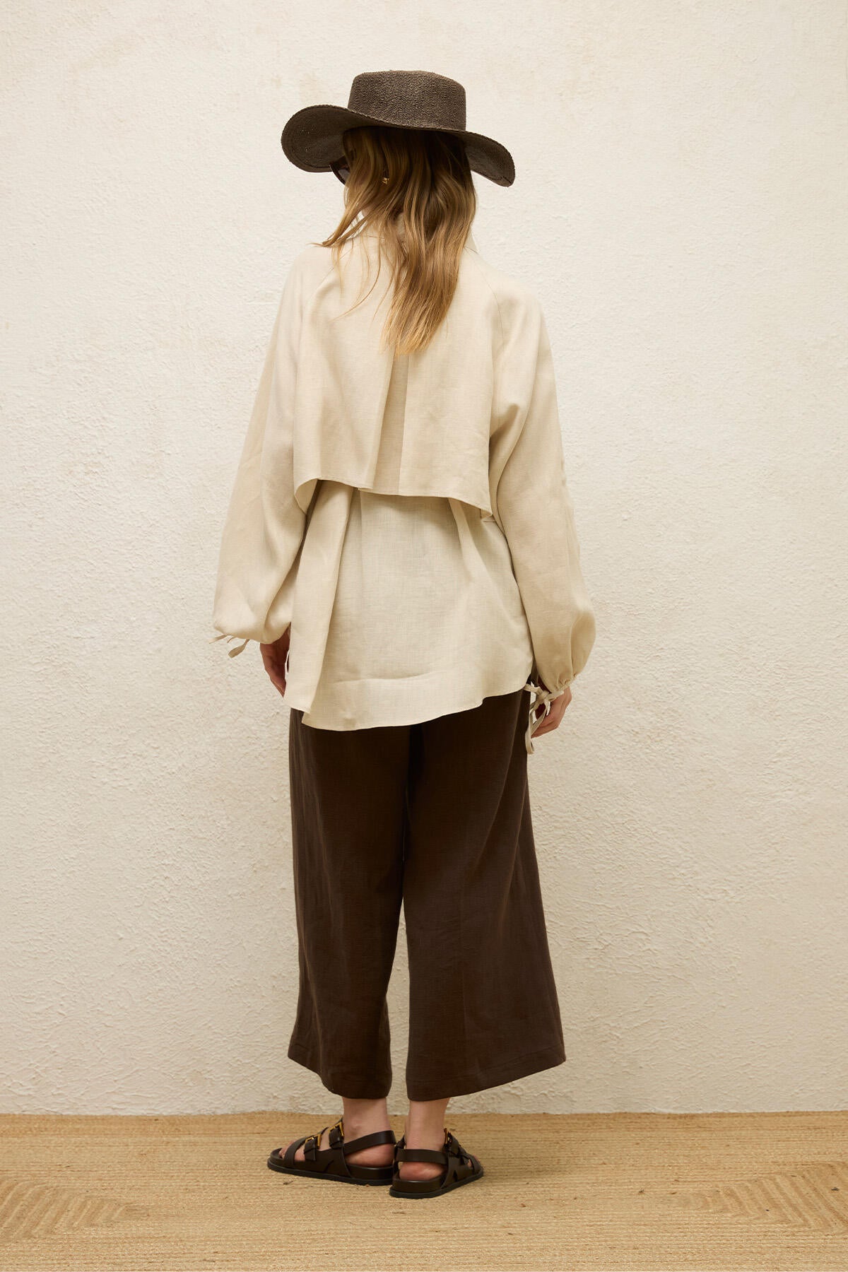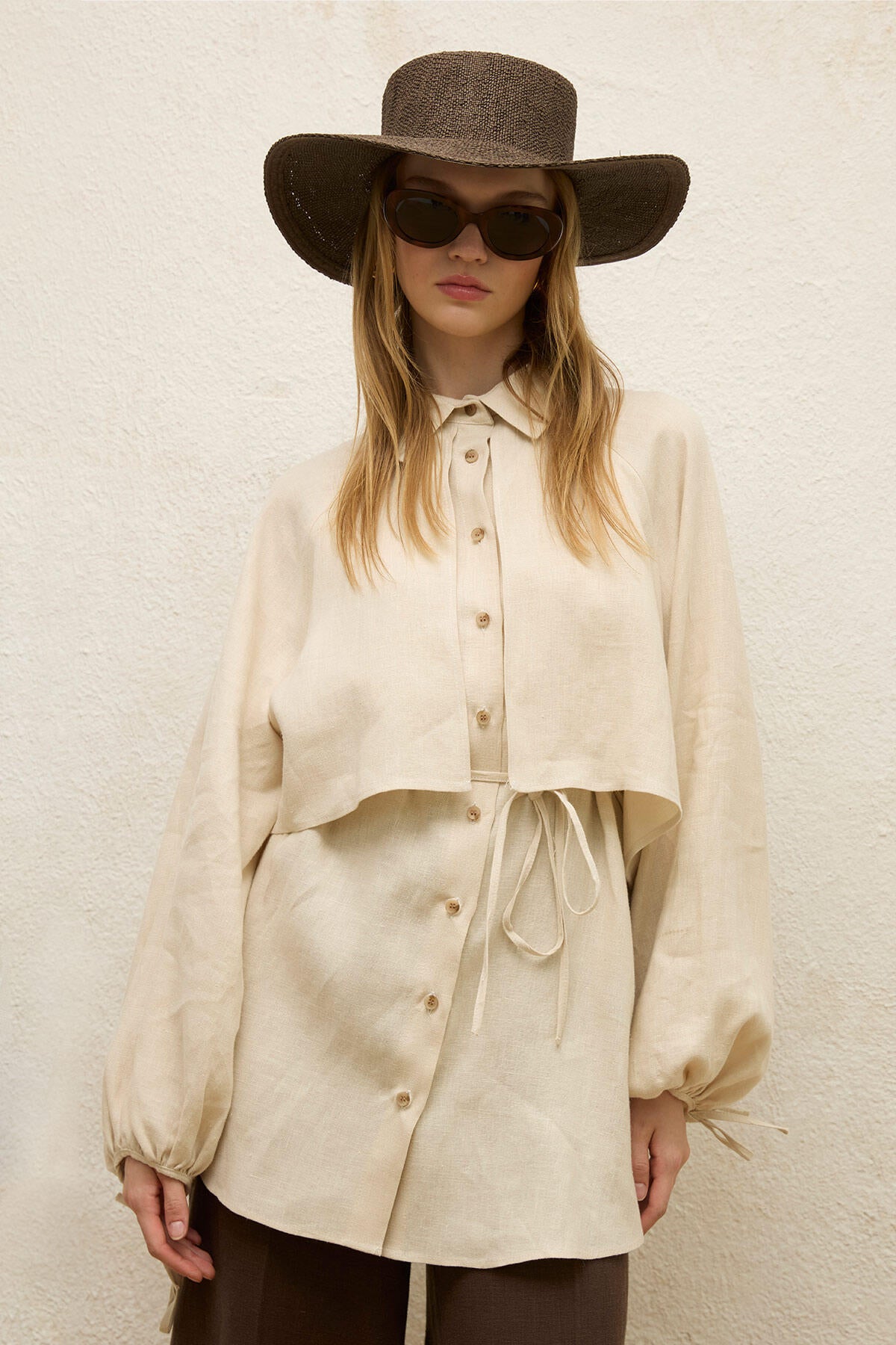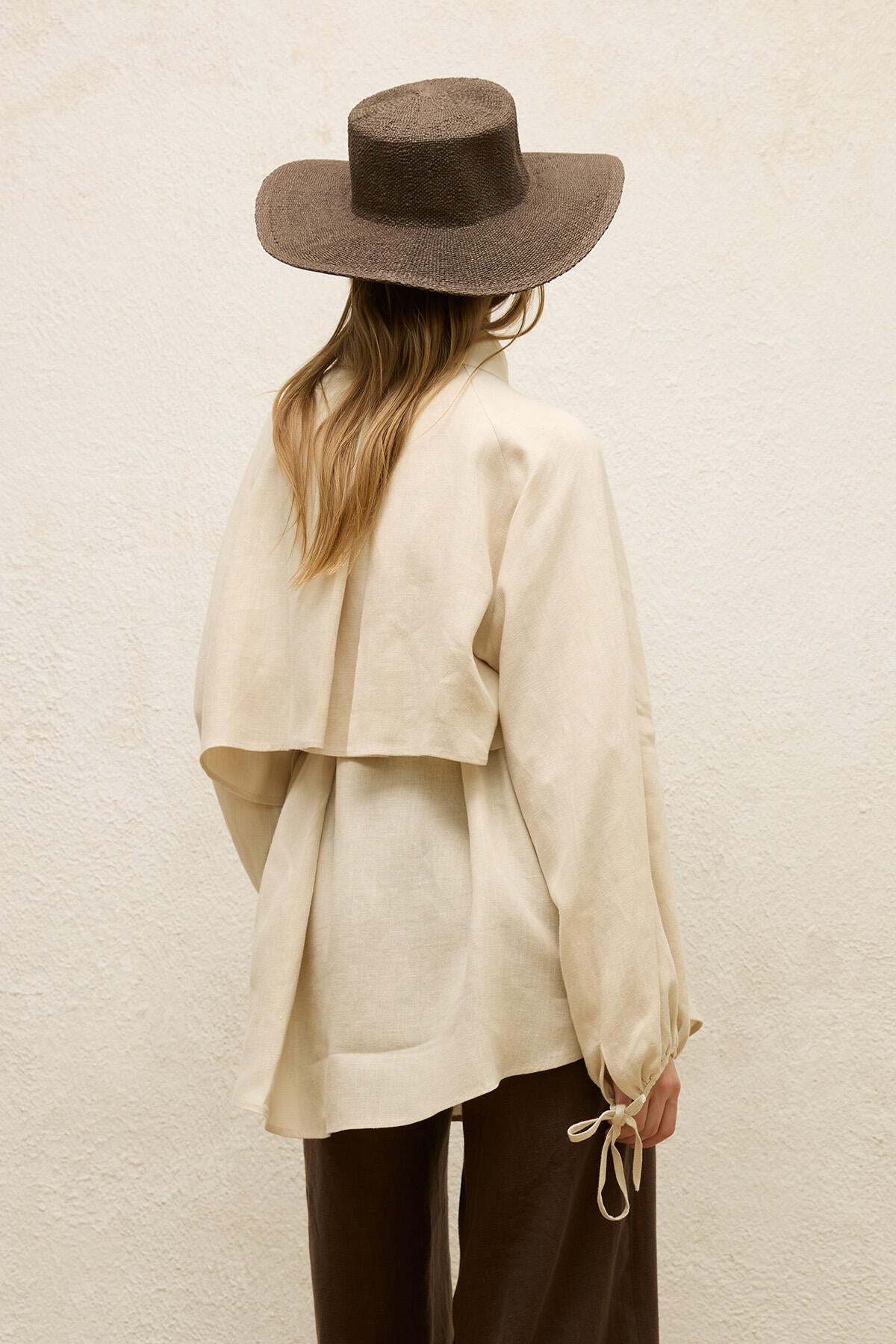 Windbreaker design, shirt collar, button closure, thin belt, raglan sleeves, tie detail at sleeve cuffs, made from 100% linen.