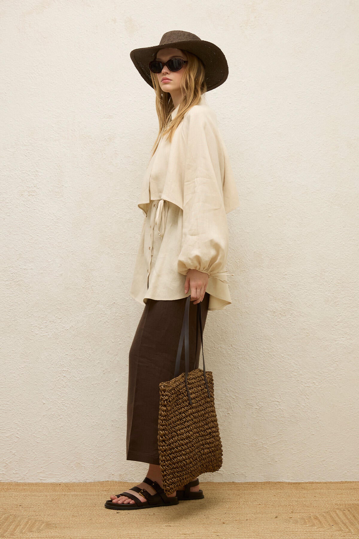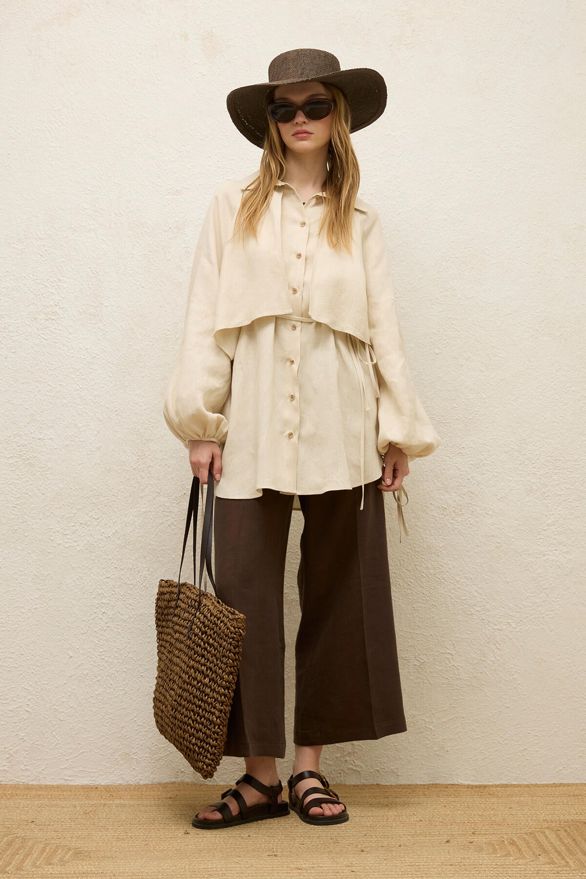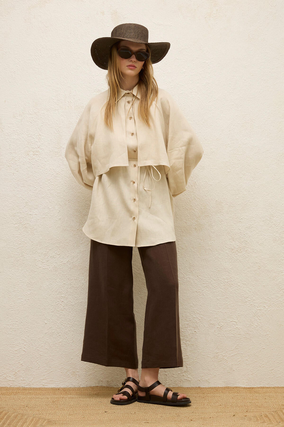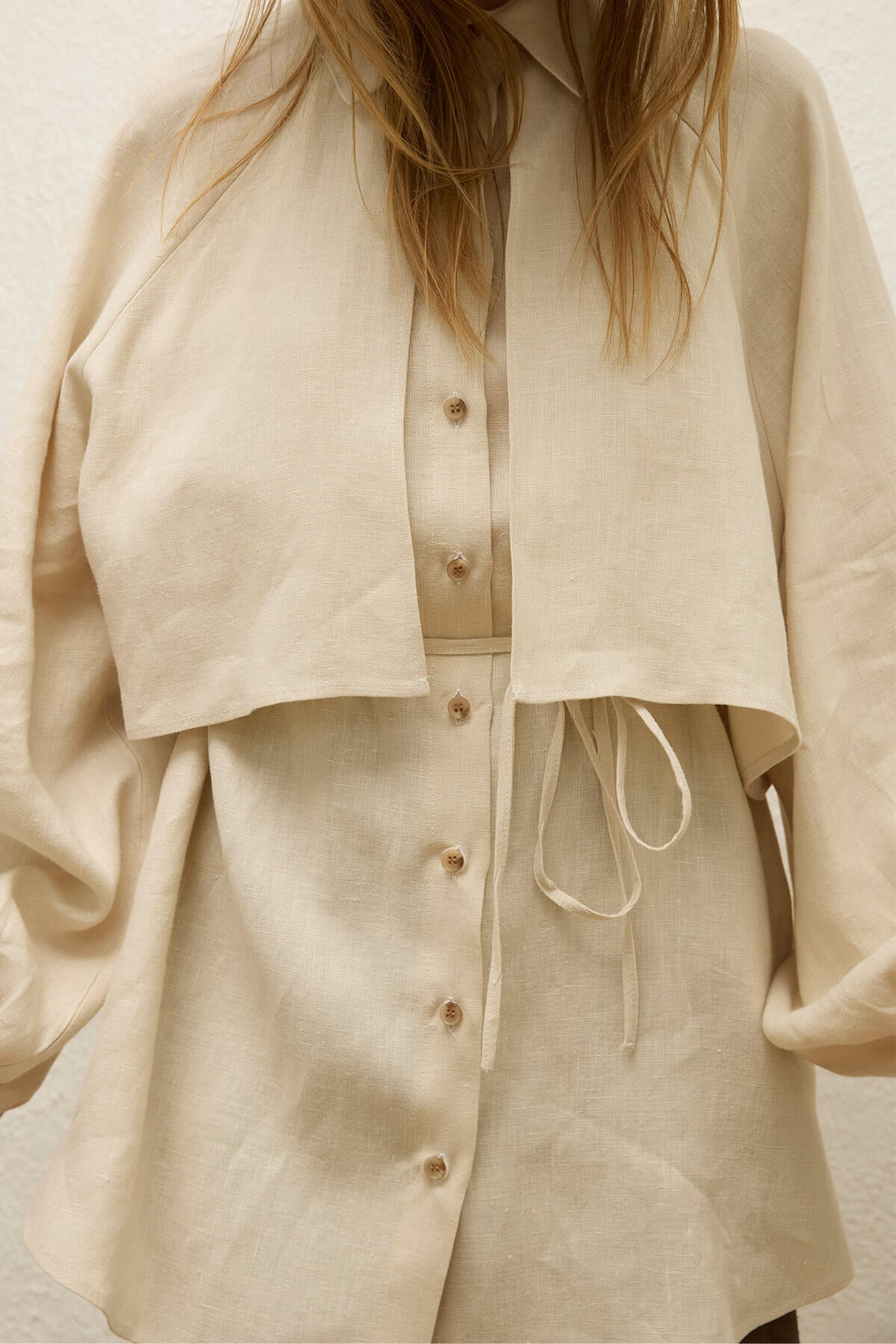 Windbreaker design, shirt collar, button closure, thin belt, raglan sleeves, tie detail at sleeve cuffs, made from 100% linen.