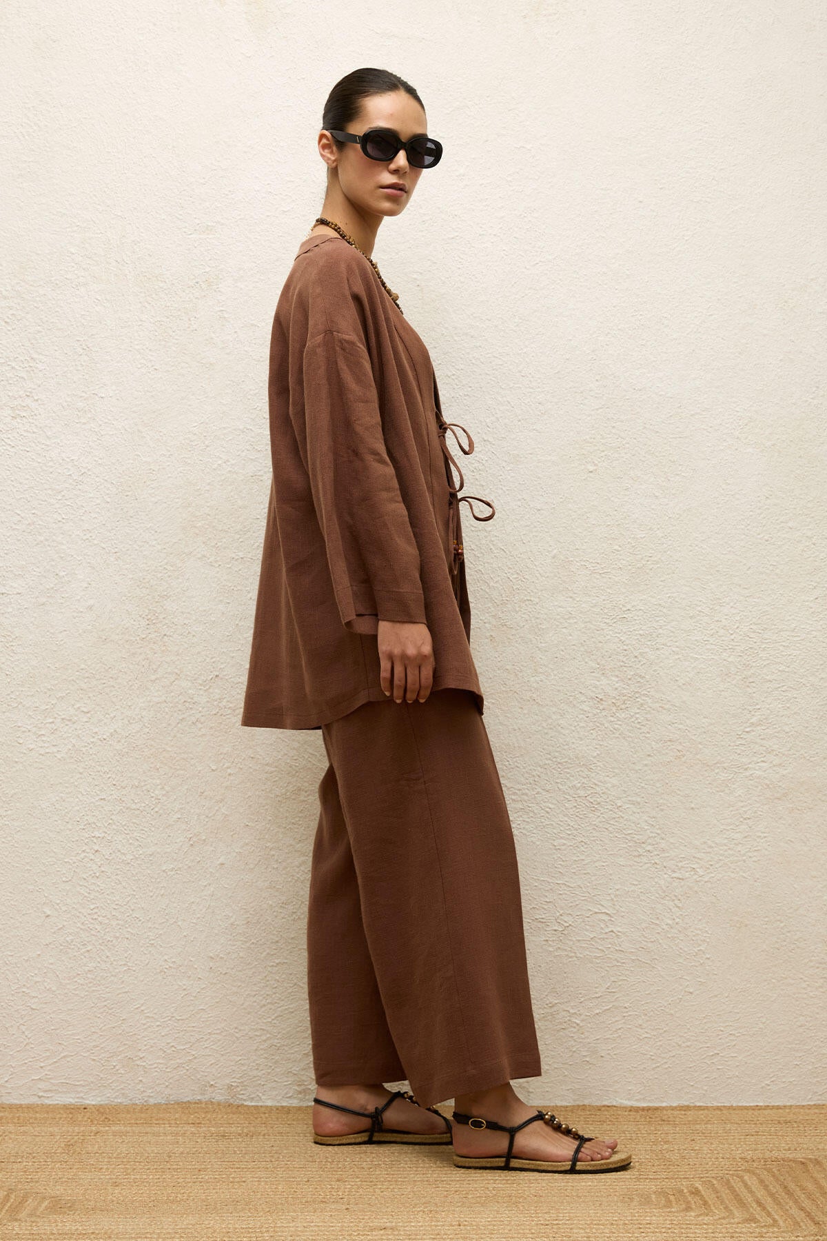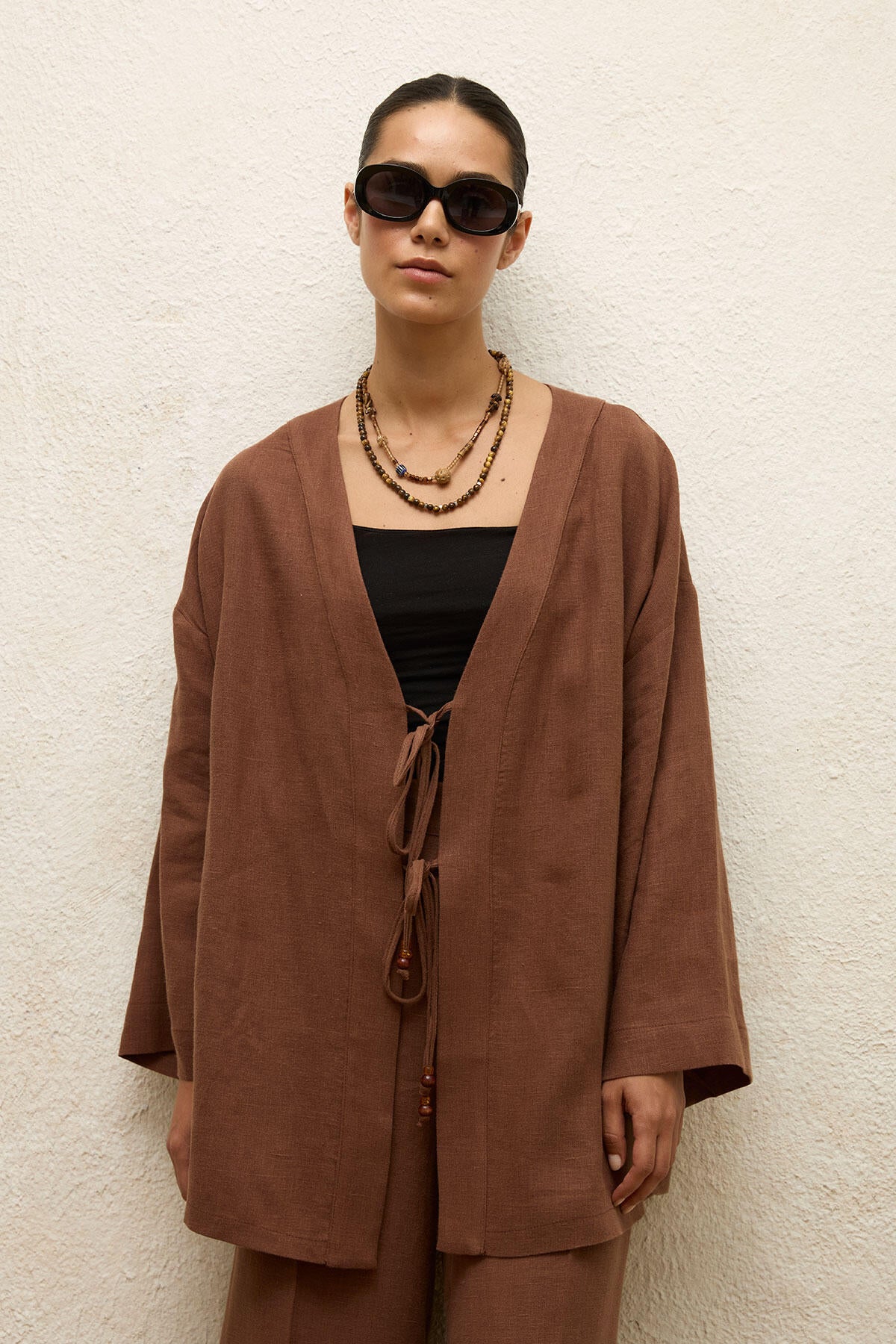 Crafted from 100% linen for unmatched breathability and comfort, this piece features a relaxed, wide fit with dropped shoulders, embodying effortless elegance. Adorned with beaded cord details for an added touch of sophistication, this kimono is the epitome of chic, laid-back style.