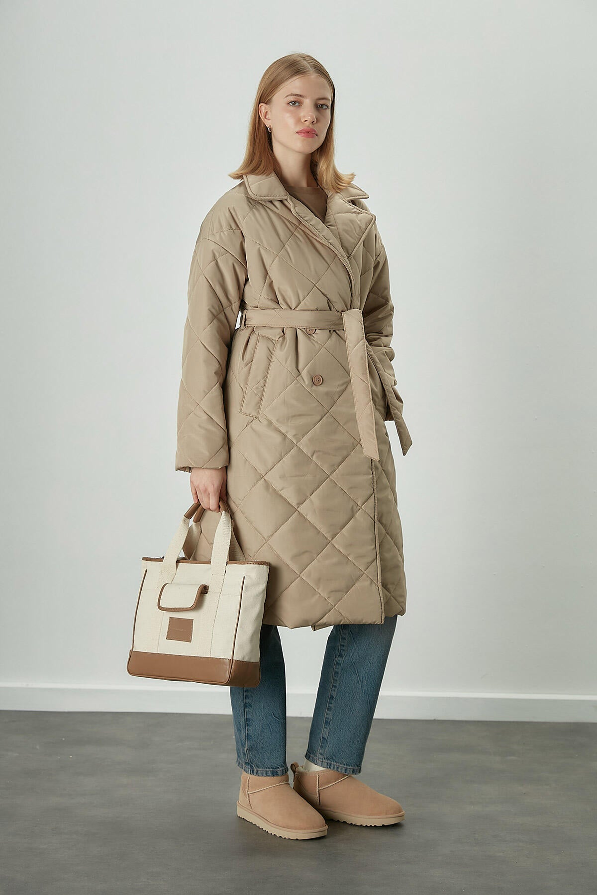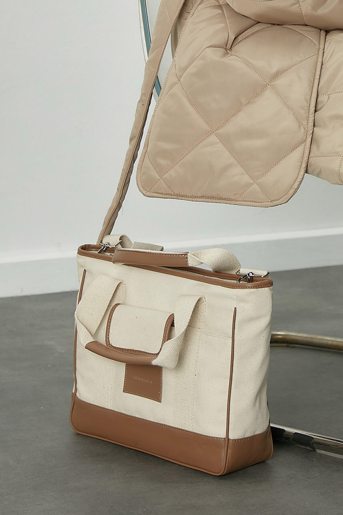 This bag features a canvas exterior complemented by faux leather accents, offering a durable yet stylish look. The design includes multiple small pockets on both the front and back, providing convenient access to essentials and enhancing organization. A zippered closure secures your belongings, while the lined interior adds an extra layer of protection. Equipped with an adjustable shoulder strap and an additional hand strap, this bag offers versatile carrying options to suit your comfort and needs.