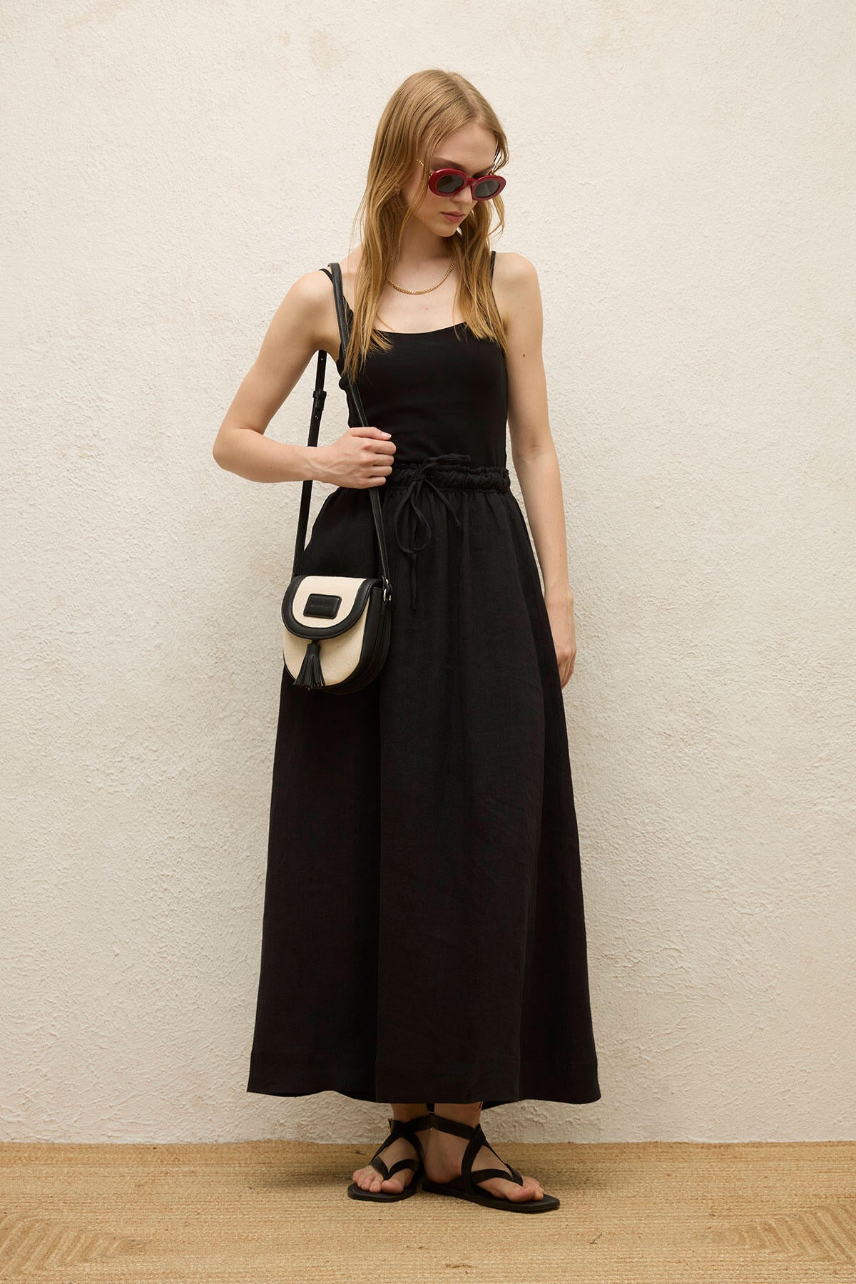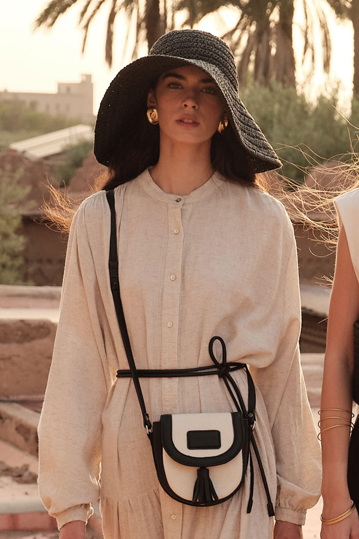 Flap closure, snap fastening, adjustable crossbody strap, unlined, with a small inner pocket, trimmed with synthetic leather. Wipe clean only.