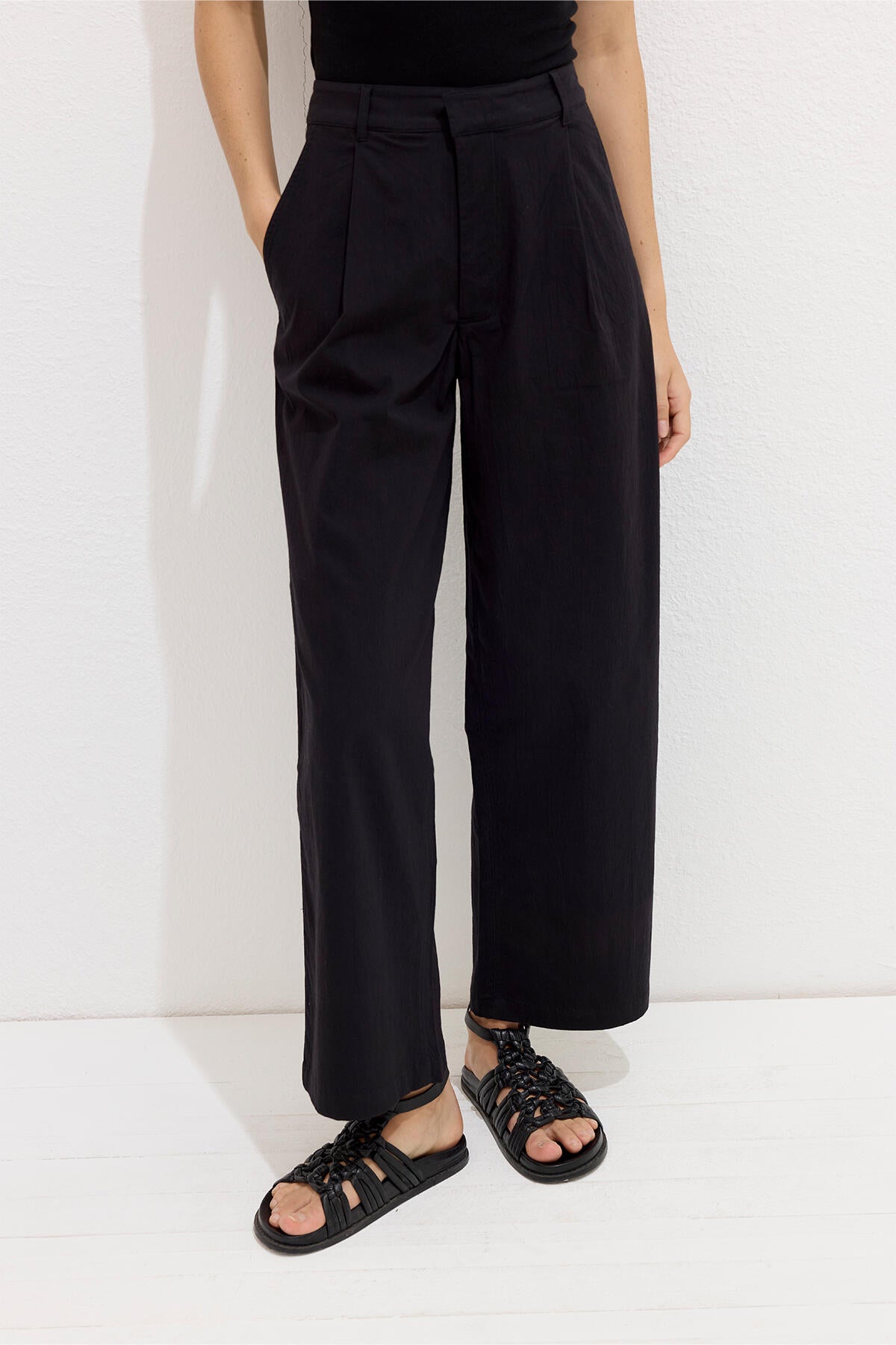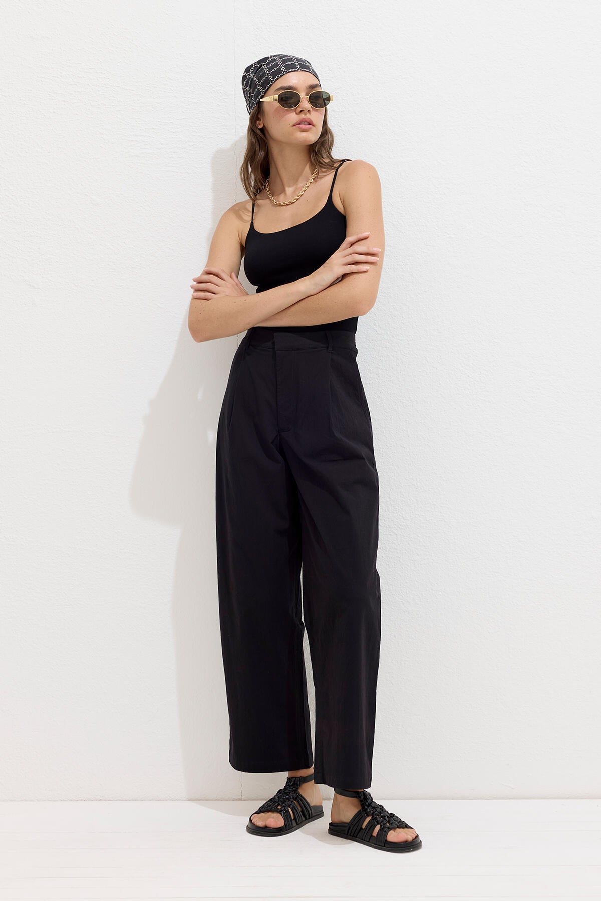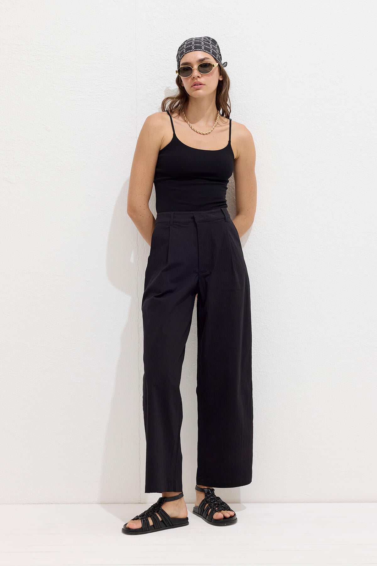 High-waisted, zipper closure, side pockets, pleated, straight wide-legged.