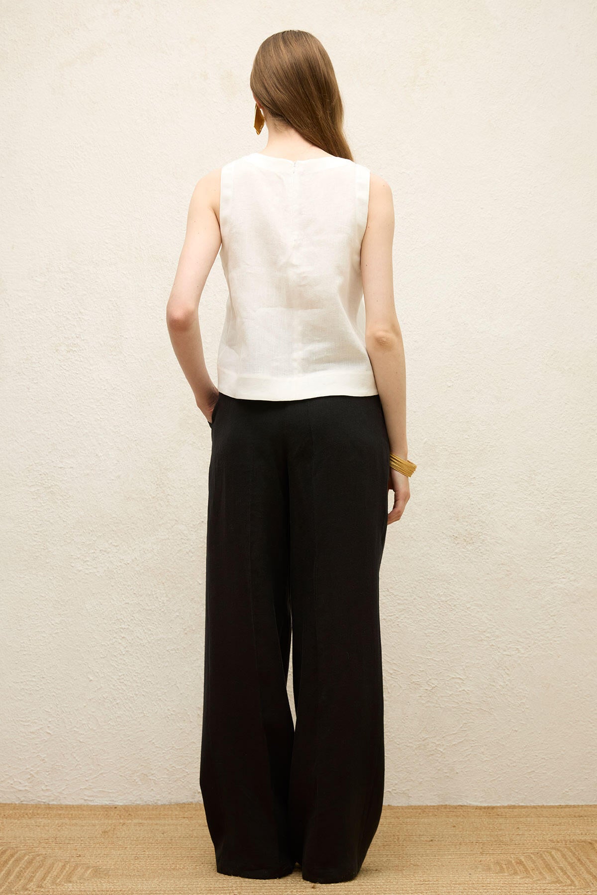 This top features a round neckline, sleeveless design, hidden zipper closure at the back, and seam details. Made from 100% linen fabric.