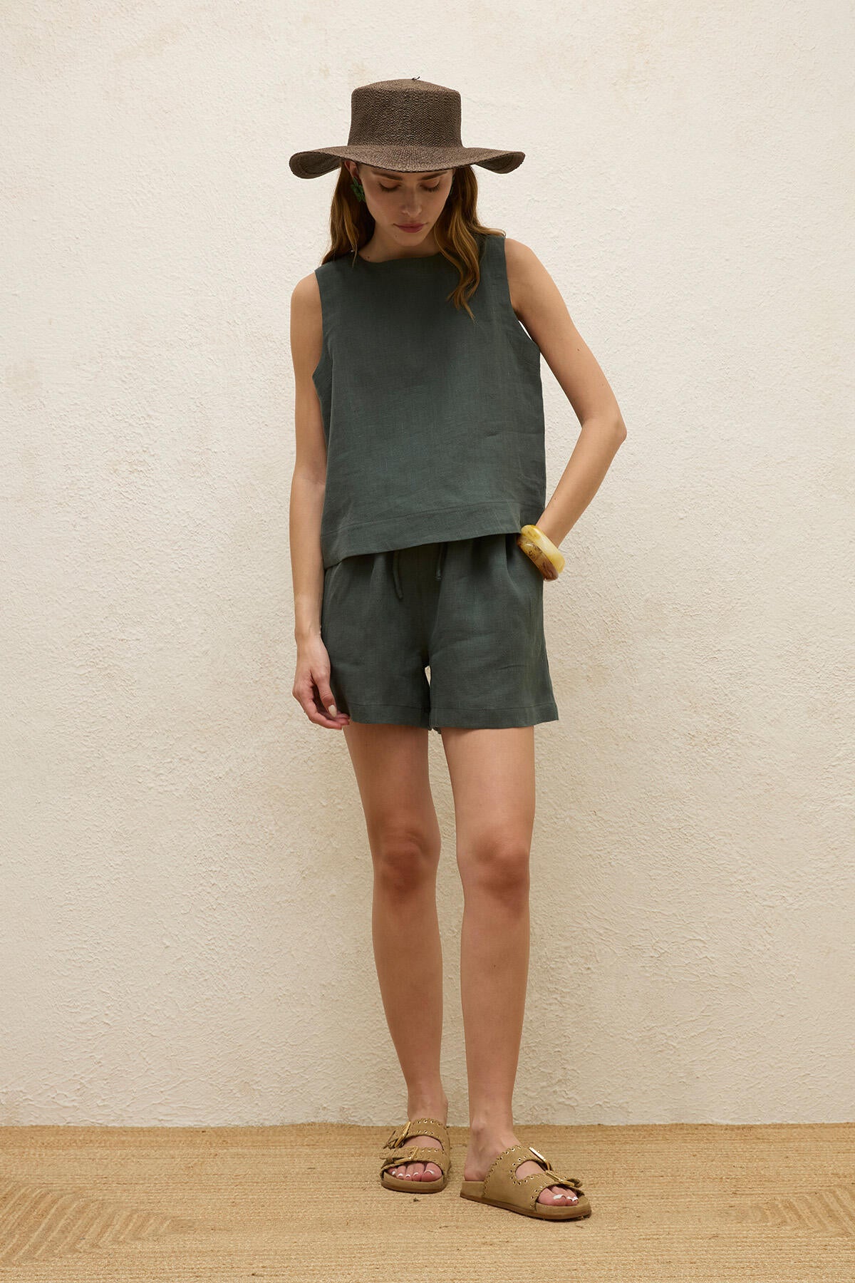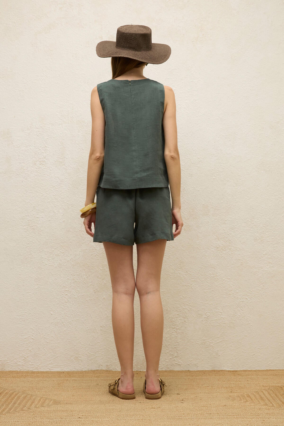 This top features a round neckline, sleeveless design, hidden zipper closure at the back, and seam details. Made from 100% linen fabric.